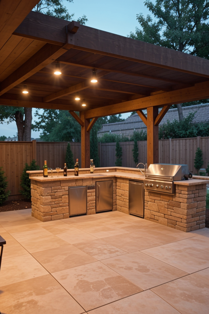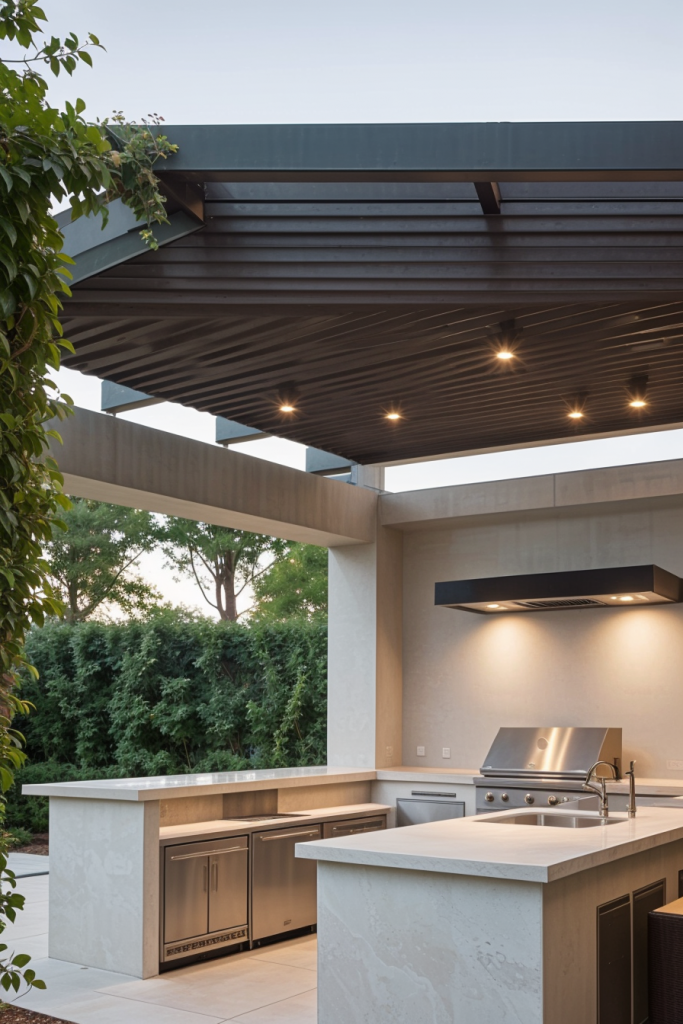 Modern Pergola-Covered Outdoor Kitchen with Integrated Lighting