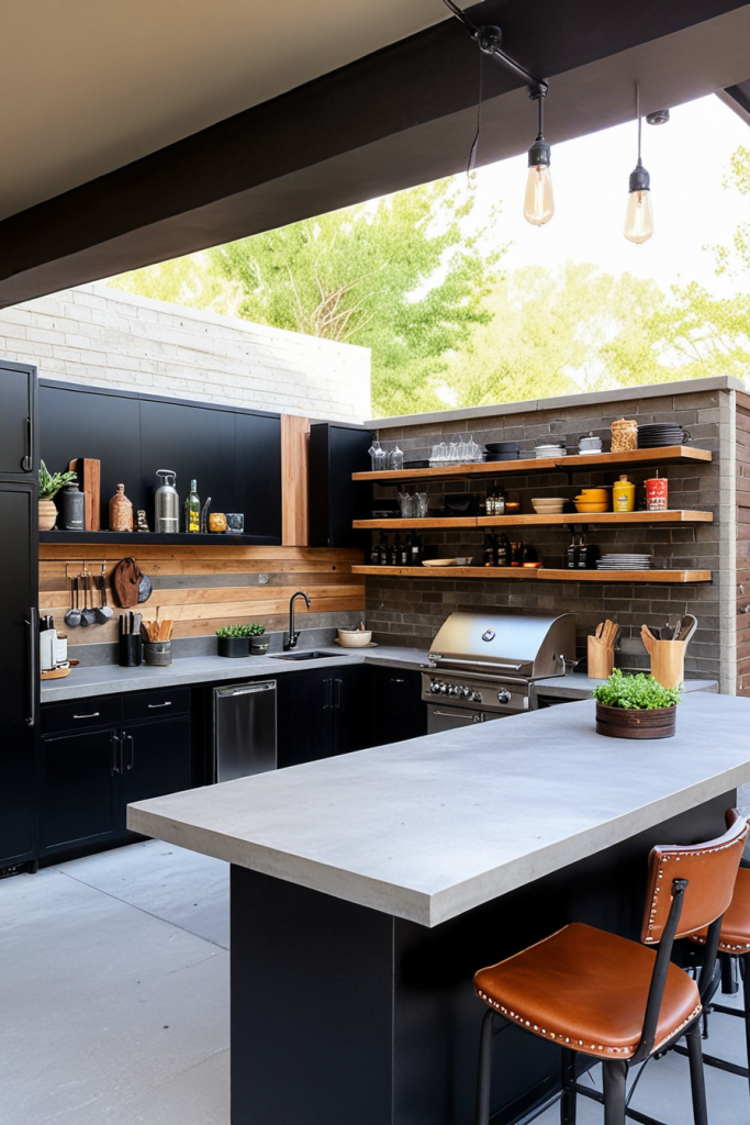 To obtain a modern and industrial kitchen look mix together natural and polished materials. The assembled sequence of black steel cabinets, upcycled lumber shelves, and concrete countertop is what makes this place additionally stylish and useful. Suspended Edison bulbs are used as lighting and the shelves are also made of metal pipes thus giving a feeling of the wild. A grill station, a beer tap system, and some bar stools are the finishing touches of the setup, and that is what makes it the most suitable for informal parties.