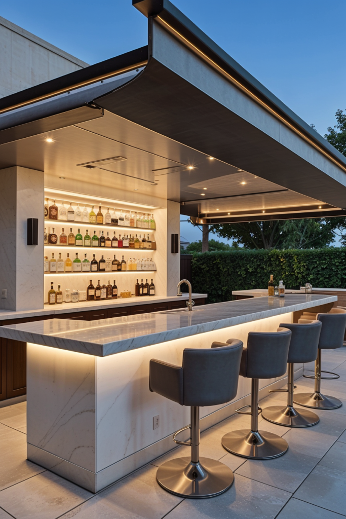 Even in cramped confines, a magnificent outdoor bar can be really influential. This smart and space-saving design impresses with a floating bar counter, custom shelving with LED backlighting, and slim-profile bar stools for a deluxe appearance. A mini fridge and built-in cocktail station maintain the convenience factor without the need for a lot of space. High-quality materials like textured stone or metallic accents ensure the room remains visually appealing, while the addition of a vertical herb garden or a glass railing gives the area a more open feel.