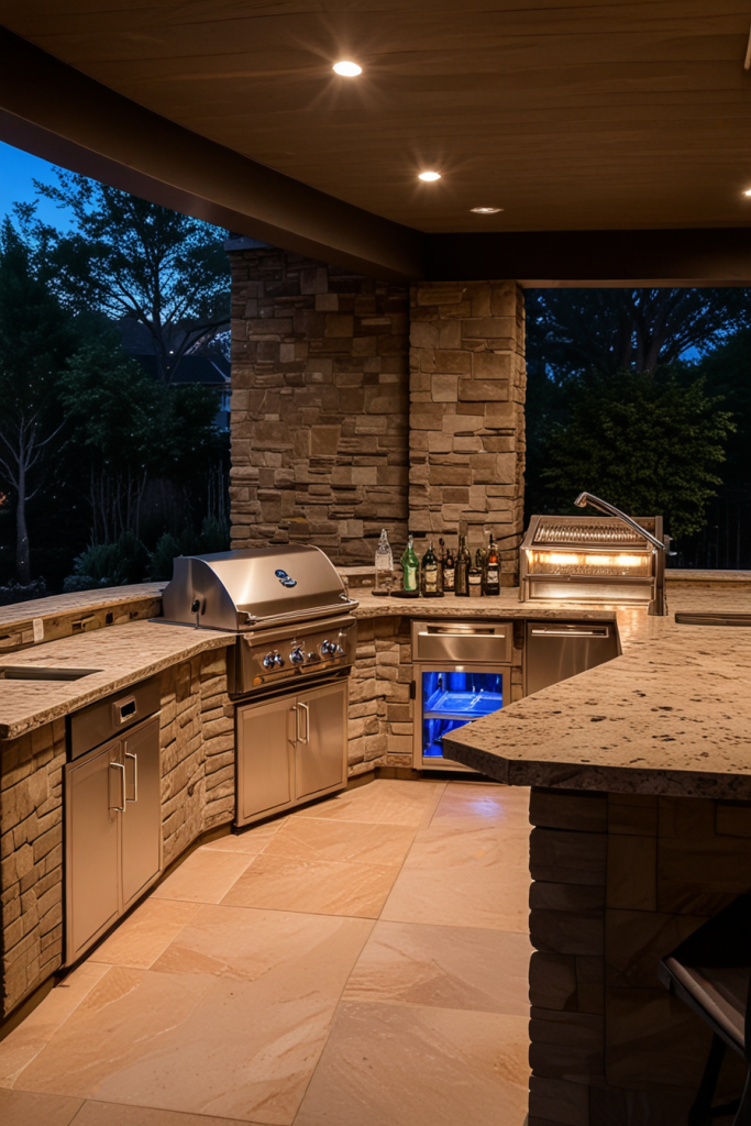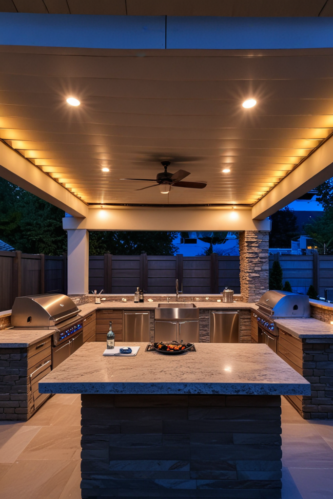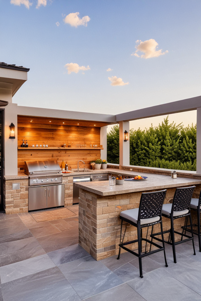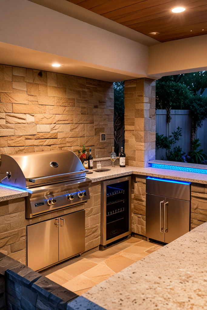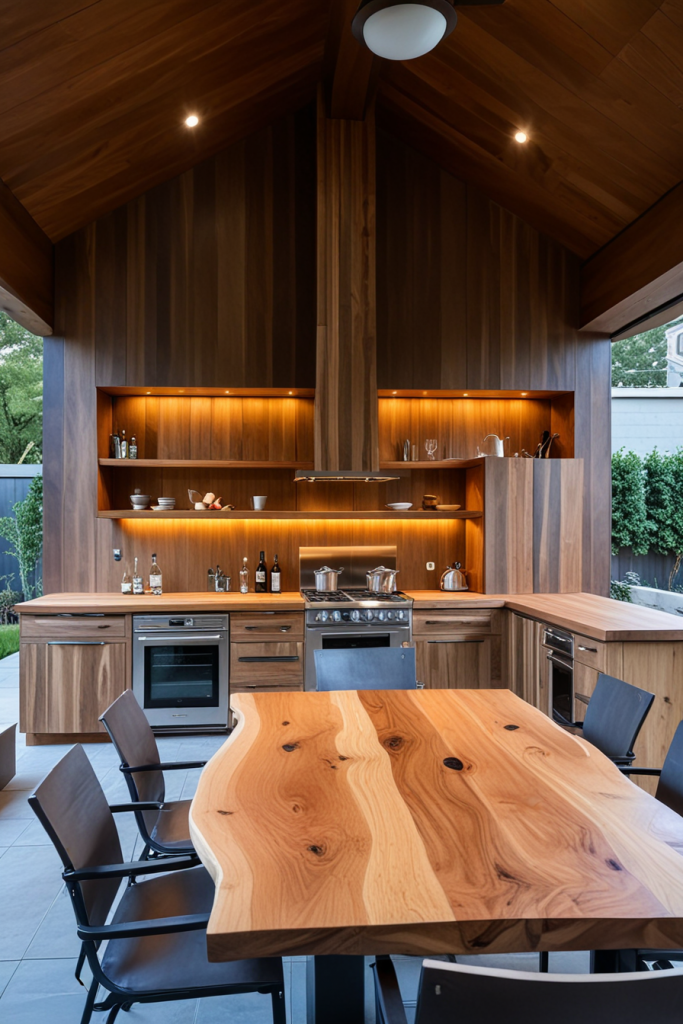 Luxury Outdoor Kitchen with Custom Wood Paneling and Ambient Lighting