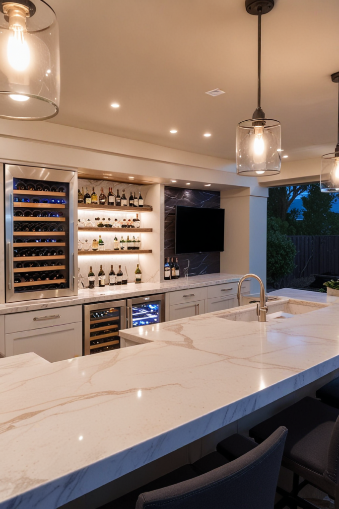 Creating a kitchen and a bar outside that is a dual-level countertop would mean that you have both style and practicality. Essentially, the two sections are devoted to cooking and socializing purposes respectively. Although this particular design includes a clean and unobtrusive lower section for food preparing, the bar area is to be designed higher clearly so guests can flock. Using sleeks like polished quartz, Waterfall marble, polished concrete, etc. produces a polished contemporary look.