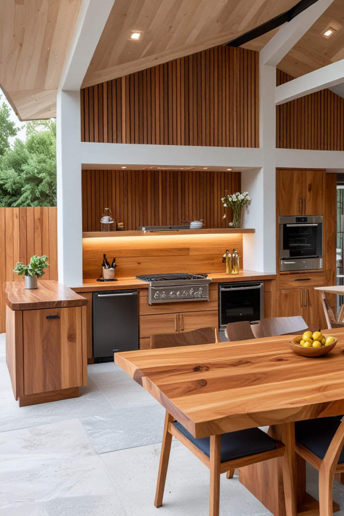 A luxury outdoor kitchen with unique wood paneling gives a sense of comfort and elegance and is ideal for any backyard. This design not only contains the affluent wood of the cabinets but also includes a live-wooded countertop and a vertical plane of wooden slats that are meant to blend harmoniously having a natural look. The kitchen island is made of high-quality built-in appliances, also the indirect light below the countertops and shelves provide an ambient light for the evening.