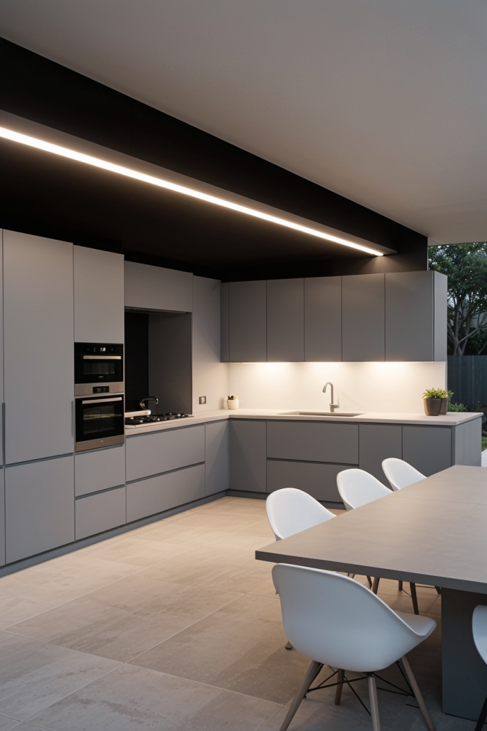 Combining aesthetic appeal with outdoor spaces, minimalist outdoor kitchens incorporate clean lines, nude tones, and minimal design. This design features matte-finished cabinets, monochrome countertops, and flush-mounted appliances for a seamless look. The dining area has a low-profile table with sculptural chairs, and soft LED lighting gives a warm ambiance. A hidden storage system stores the necessities neatly away, to keep the living spaces neat and organized.