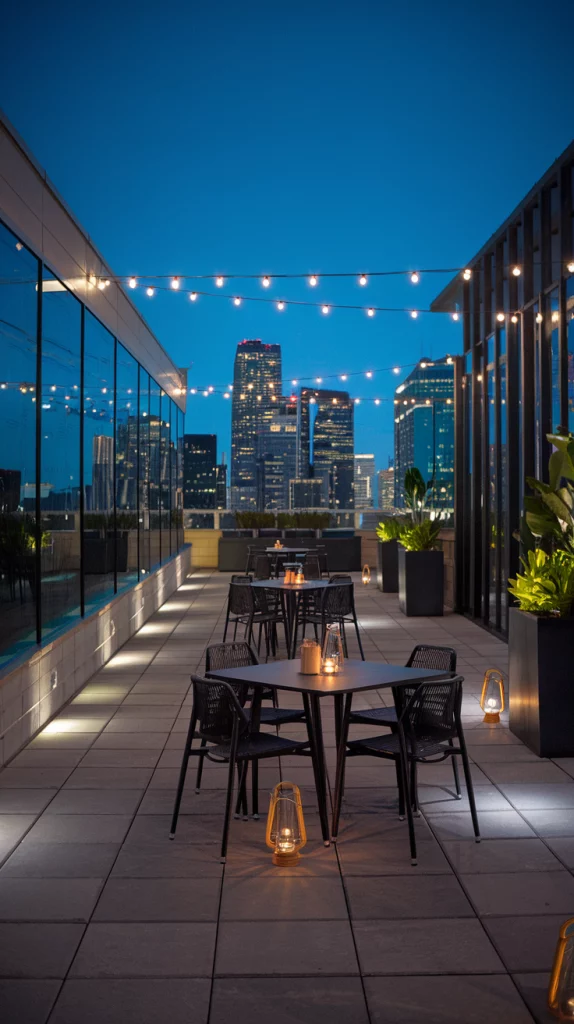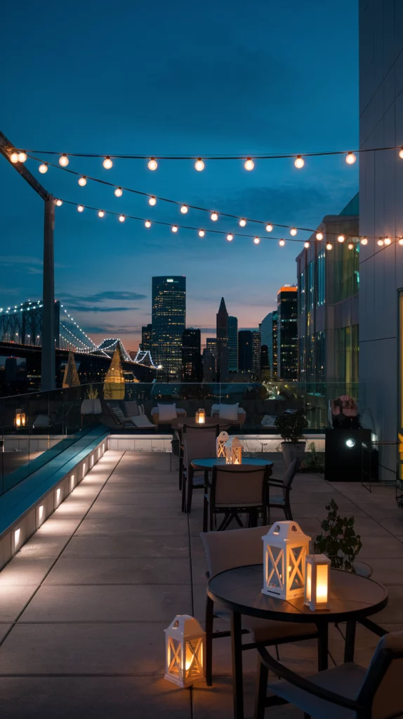 Rooftop terraces can be transformed into inviting retreats with the right lighting design. Use string lights for a festive touch, recessed lights for a clean look, and portable lamps for flexibility. Add lanterns or candles to create a warm and intimate atmosphere.