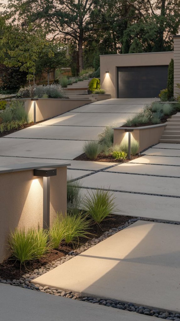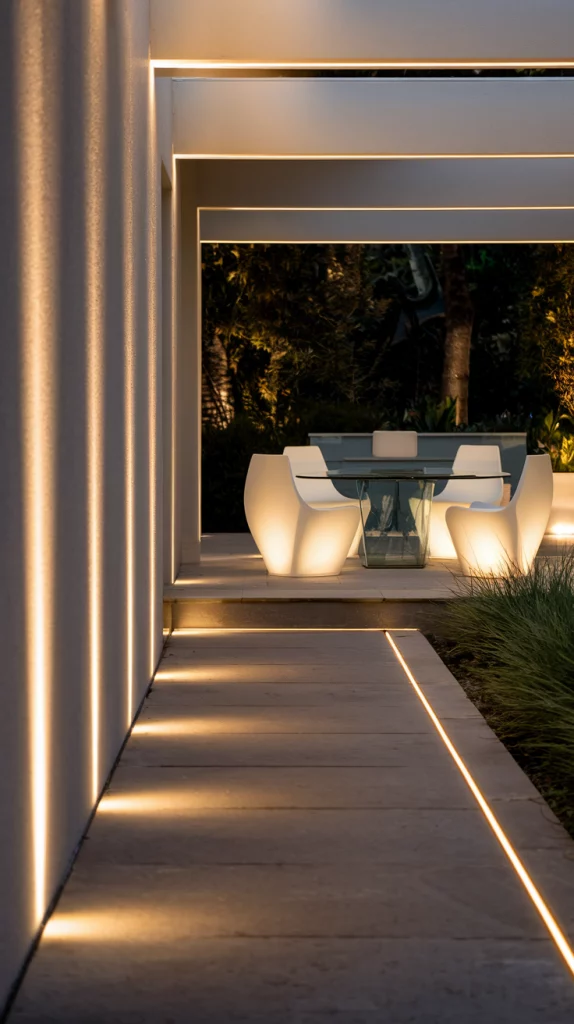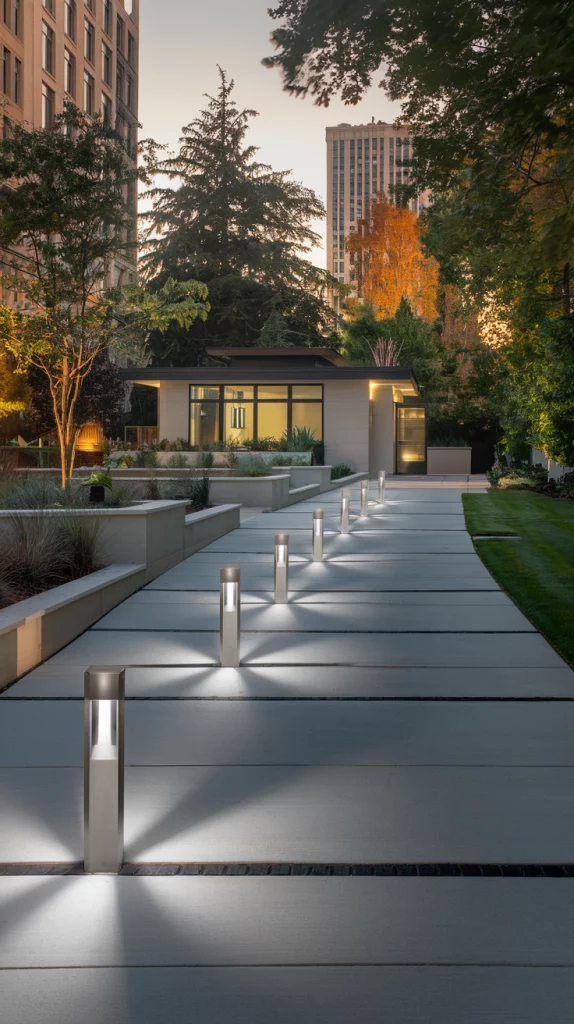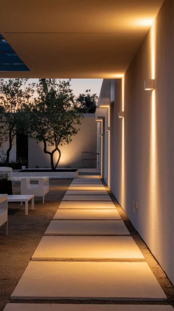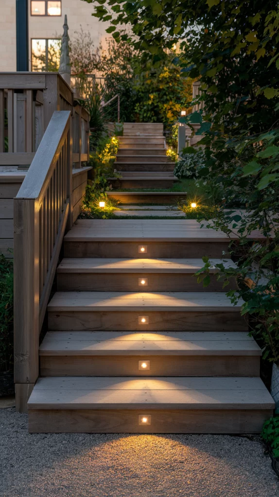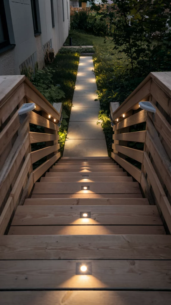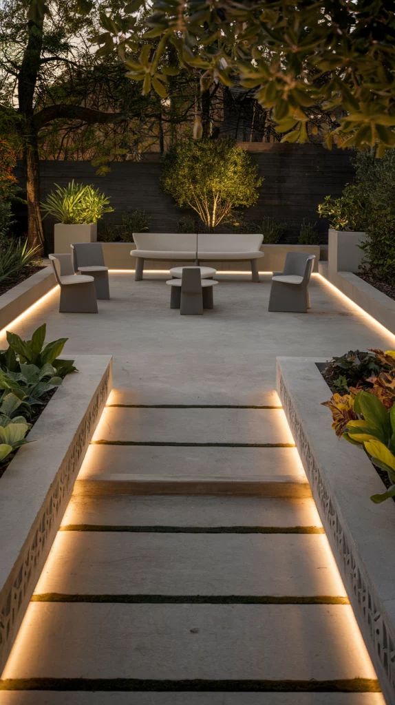 Step lighting is essential for ensuring safety while adding a modern touch to outdoor stairs and pathways. Recessed LED lights installed on stair risers or beneath railings create a sleek, minimalist look. For pathways, small stake lights or embedded ground lights can illuminate the way without taking up space.