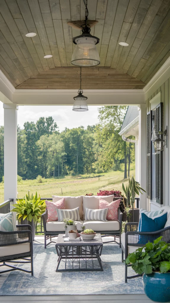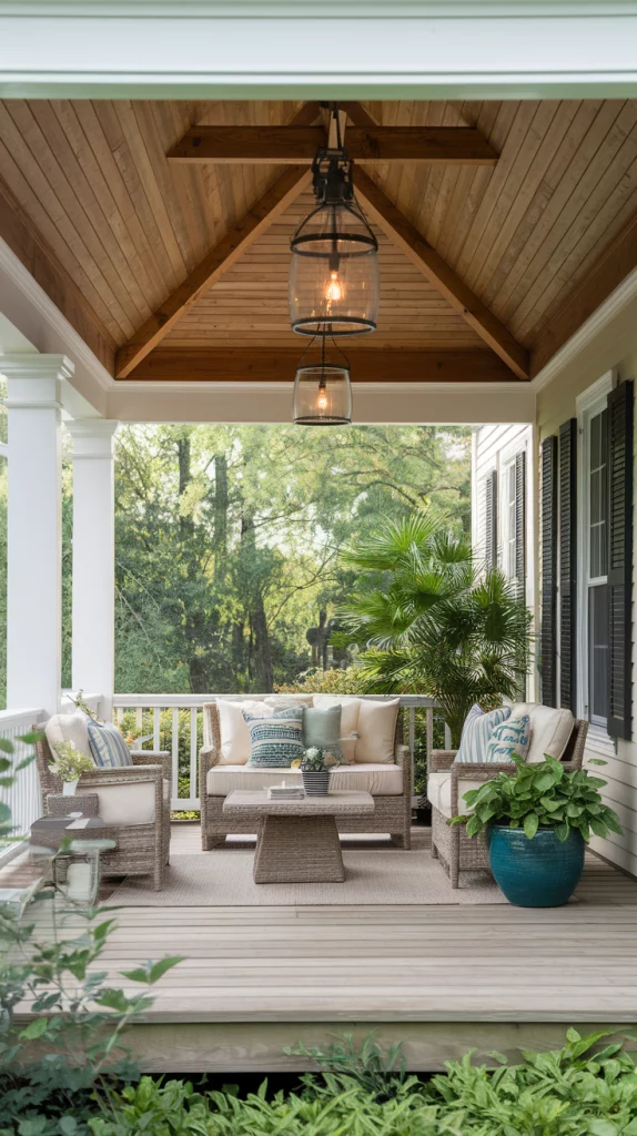 Pendant lights bring a touch of elegance to covered porches and outdoor seating areas. These hanging fixtures come in a variety of designs, from rustic lanterns to modern glass globes, and create a warm, focused glow. Position them above dining tables or seating areas for functional and decorative lighting.