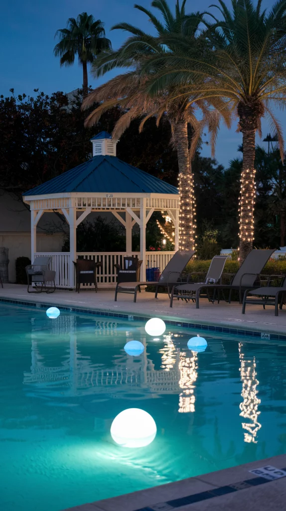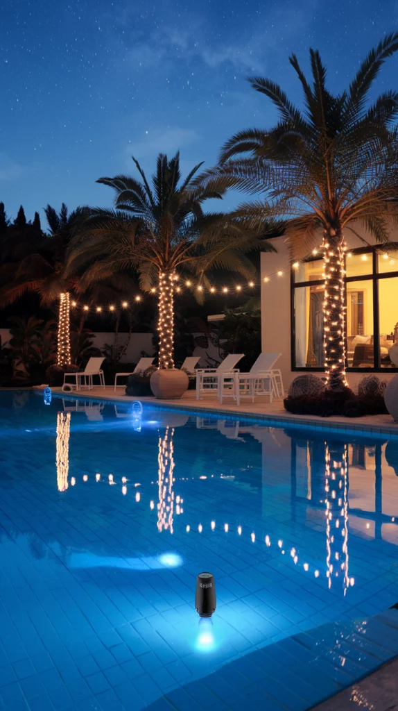 Water-resistant lighting is essential for poolside areas to ensure both safety and ambiance. Submersible LED lights in the pool create a vibrant underwater glow, while wall-mounted or ground-level fixtures illuminate the surrounding space. For added flair, use floating lights or waterproof string lights around the pool’s perimeter.