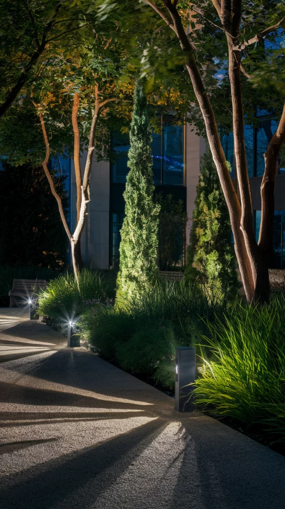Uplighting is an elegant way to draw attention to trees, shrubs, or architectural features. Place spotlights at the base of trees or larger plants to create dramatic upward beams of light. Adjust the angle to highlight the height or texture of the foliage for a striking visual effect.