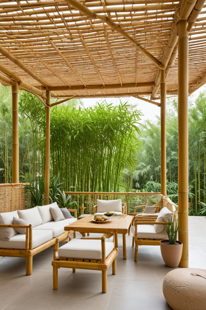 An eco-friendly pavilion concentrates on resource sustainability and environmental conservation. Bamboo furniture, reclaimed wood for beams, as well as decking, and recycled metal structures will accomplish this goal. Energy efficiency can further be enhanced with solar-powered lighting or sprouting plants that provide natural cooling, as well as a green roof. Energy saving kitchen appliances and water saving fixtures should be used if the pavilion contains a kitchen.