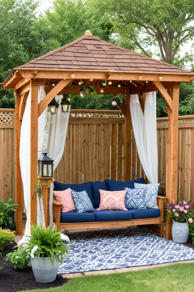 With the right seasonal décor, your pavilion can be transformed into a space for every season of the year. Replace spring and summer pillows with flowery ones with blaring colors , add throw pillows, and airy curtains to make the pavilion feel warm and bright. In the colder seasons, replace pillows with ones in twisted pumpkin colors and add holiday wreaths sprinkled with fairy lights. On autumn days, throw some warm autumn leaves around the pavilion to make it feel cozy and festive. With these changes, your pavilion will be relaxing throughout the year!