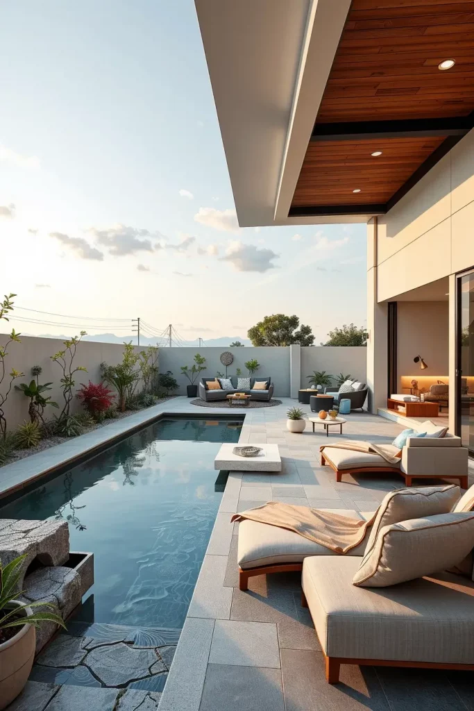 In 2026, I see water becoming the central architectural element of the outdoor relaxing area 2026. A statement water feature or a shallow reflective pool immediately elevates the space, adding movement, light play, and a calming acoustic backdrop. I design these areas with clean geometric lines, often positioning the reflective pool parallel to the lounge zone to visually widen the space. This approach is both practical and atmospheric, as water naturally cools the surrounding area and enhances the sense of retreat.