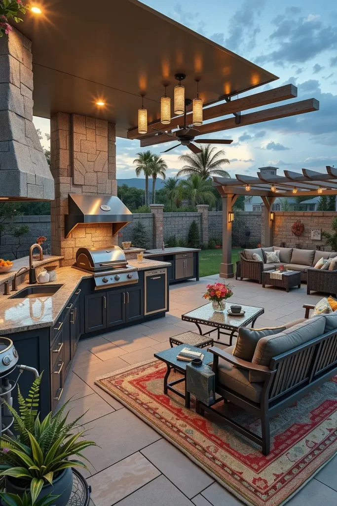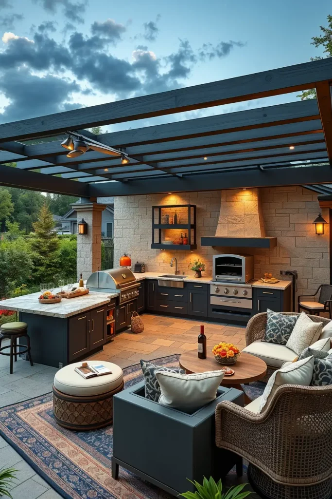 I recommend using weatherproof cabinetry with matte finishes, integrated grills, pizza ovens, wine coolers, and stone countertops that withstand temperature changes. Adjacent to the kitchen, I position deep lounge seating with outdoor sectionals, textured cushions, and low-profile coffee tables. A pergola with integrated lighting and heating panels ensures year-round usability. Every piece of furniture must balance durability with comfort.