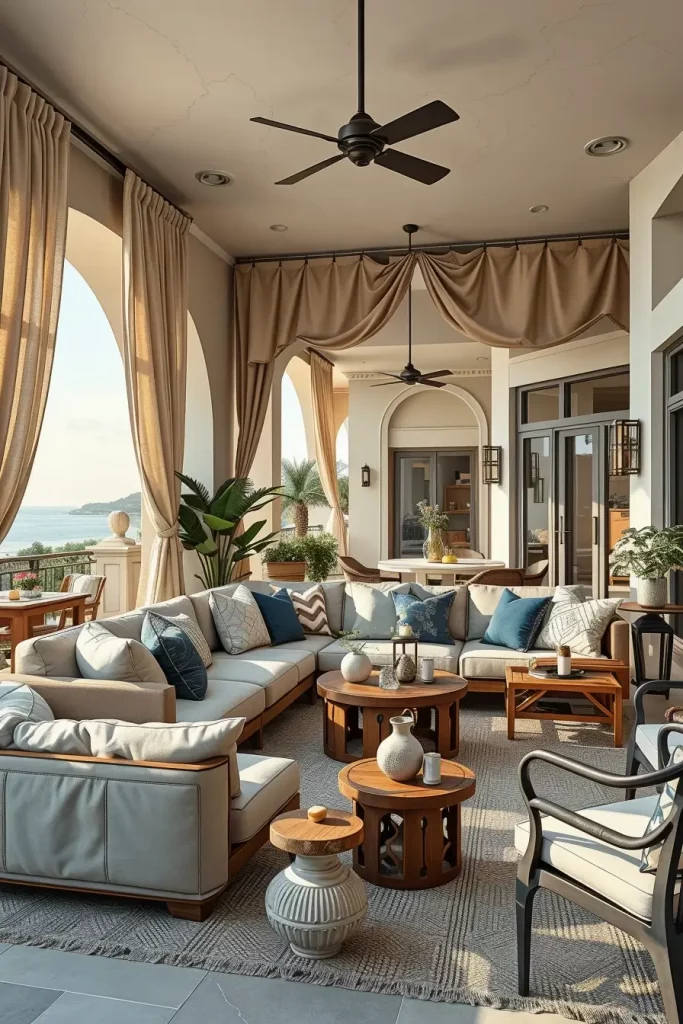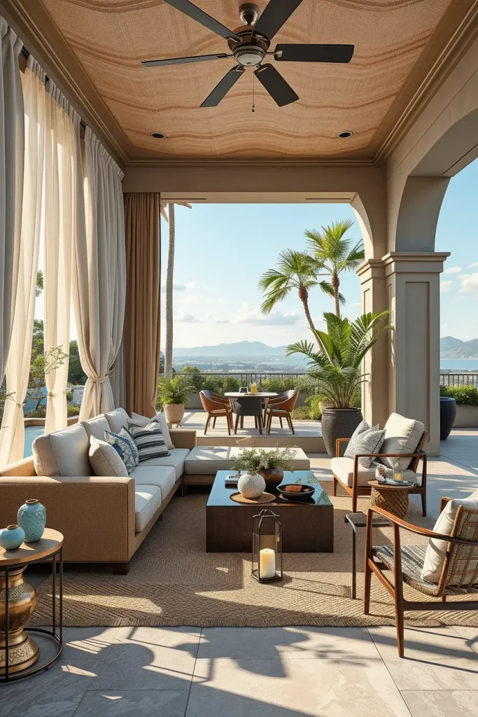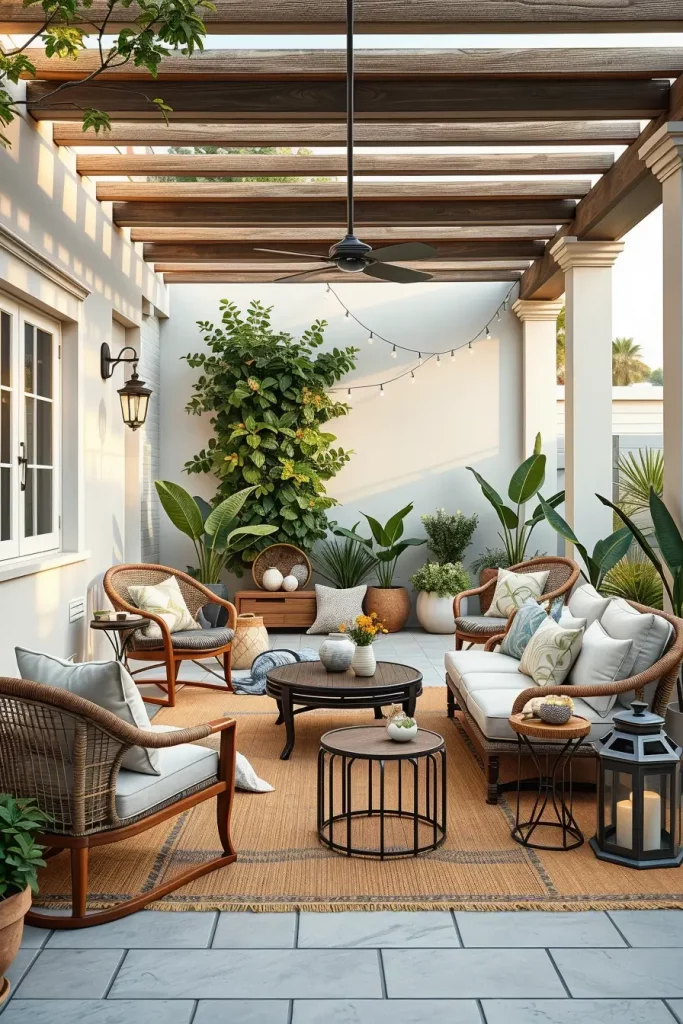 I typically combine woven lounge chairs, teak or powder-coated metal frames, oversized outdoor rugs, and ceramic side tables. Neutral cushions with subtle patterns, layered throws, and lantern-style lighting create warmth. I incorporate vertical garden walls or potted olive trees for greenery, ensuring the layout remains breathable and balanced.