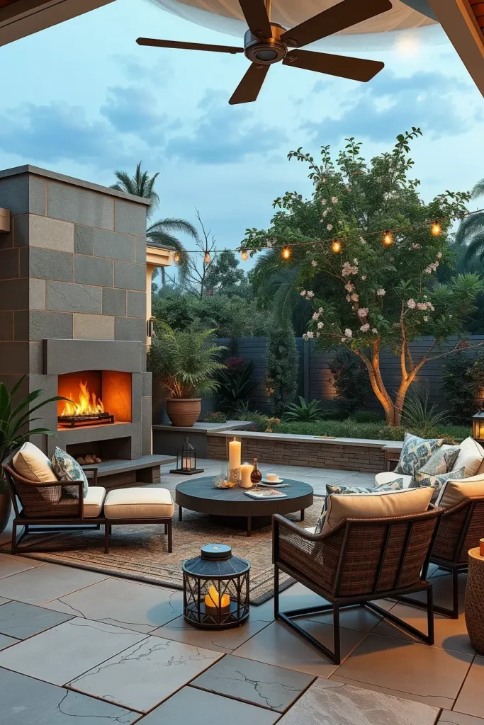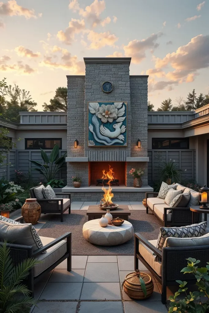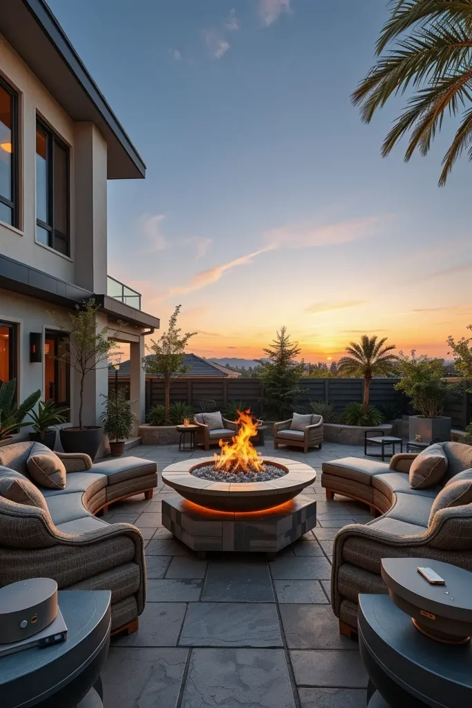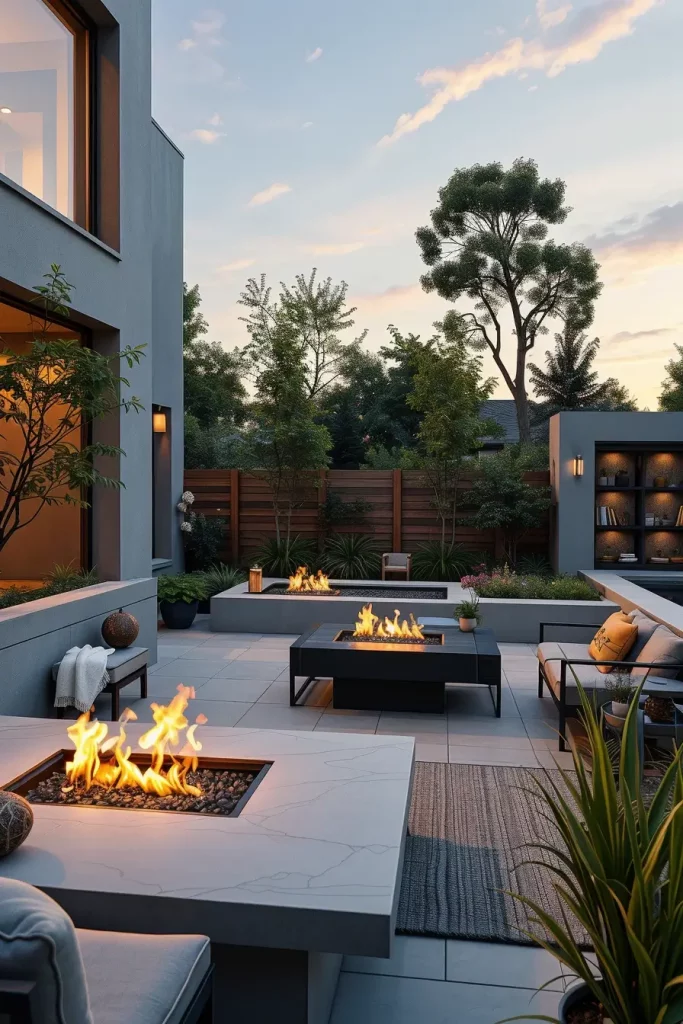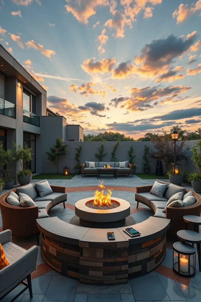 I carefully position seating to encourage conversation while ensuring safe clearances. Materials such as blackened steel, natural stone, or cast concrete provide durability and modern appeal. I often combine fire elements with reflective surfaces or water features to create contrast and visual depth. This combination results in a stylish and unique composition.