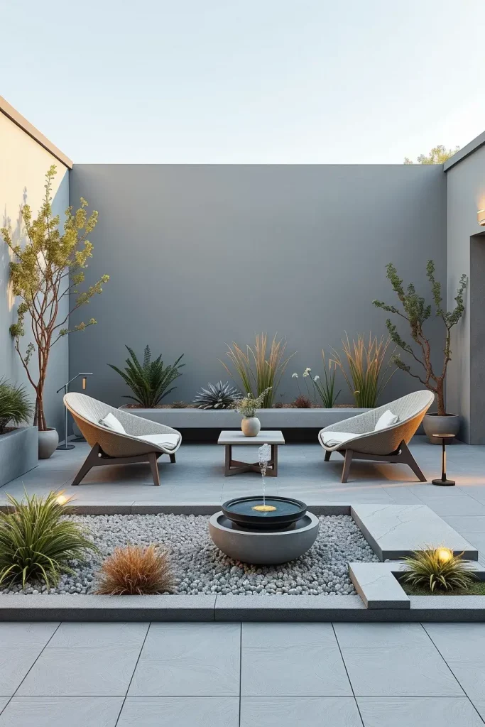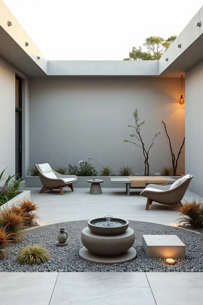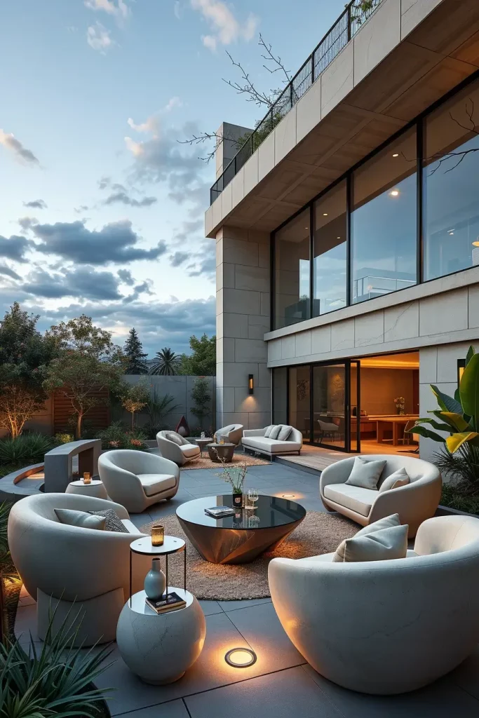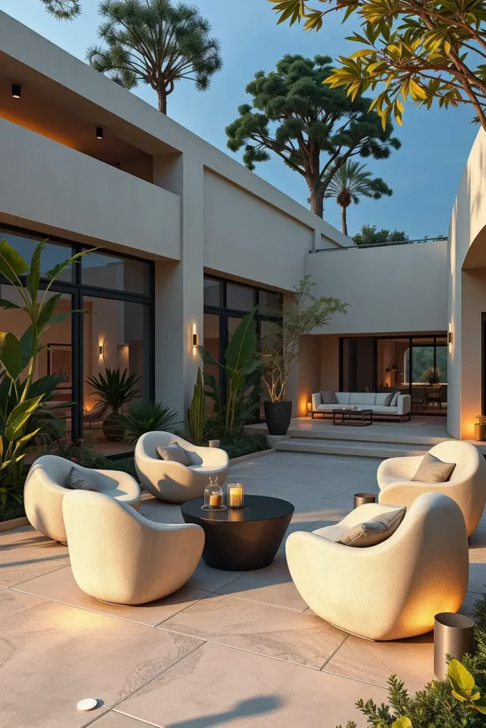 I typically combine minimalist lounge seating with a central statement fire feature or sculptural table. Built-in benches along courtyard walls maximize space efficiency. Vertical elements such as trellises or textured plaster walls soften the geometry. Strategic use of outdoor rugs in performance fabrics helps define seating zones while adding warmth to harder materials.