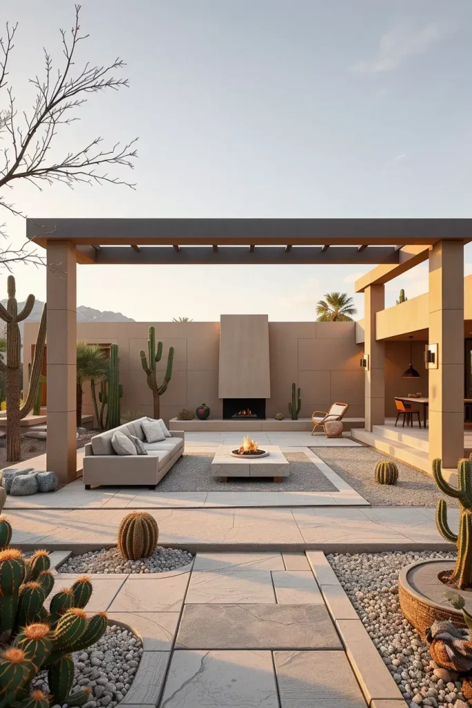 Desert-modern aesthetics continue to influence designer outdoor relaxing areas in 2026. I focus on warm earthy tones, minimal landscaping, and strong architectural lines. The design is calm, grounded, and visually cohesive. I often use gravel beds, sculptural cacti, and smooth concrete surfaces to define zones while maintaining simplicity.