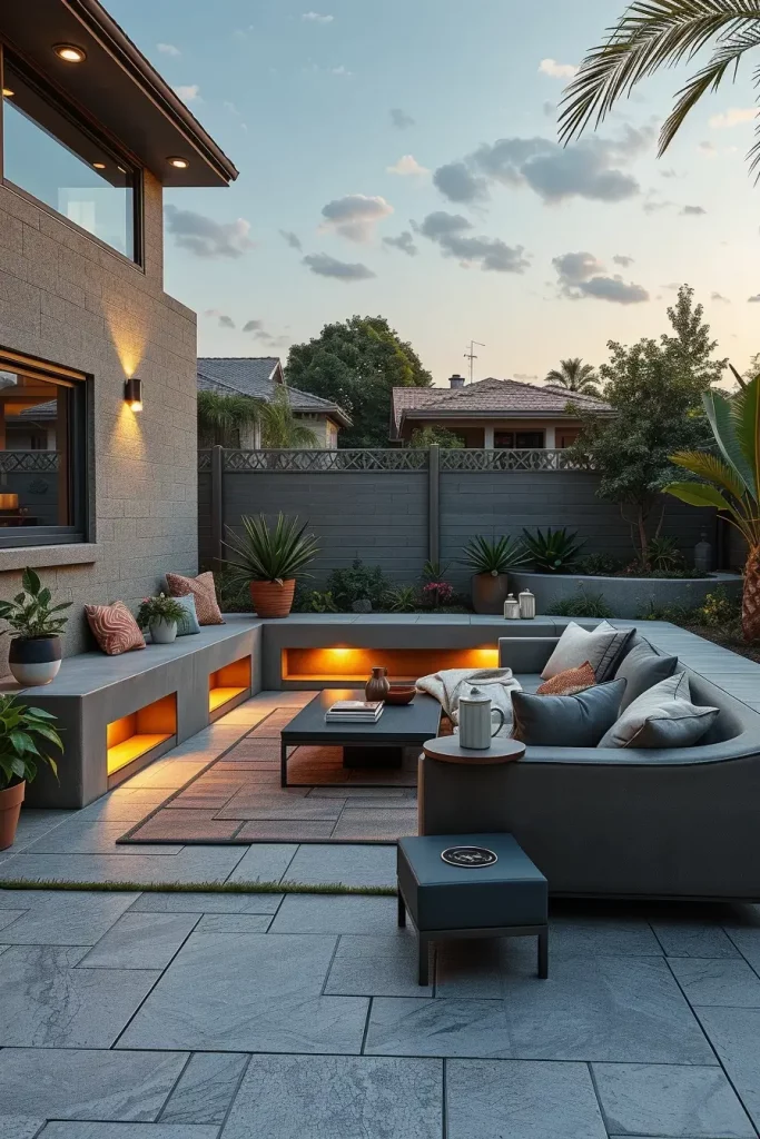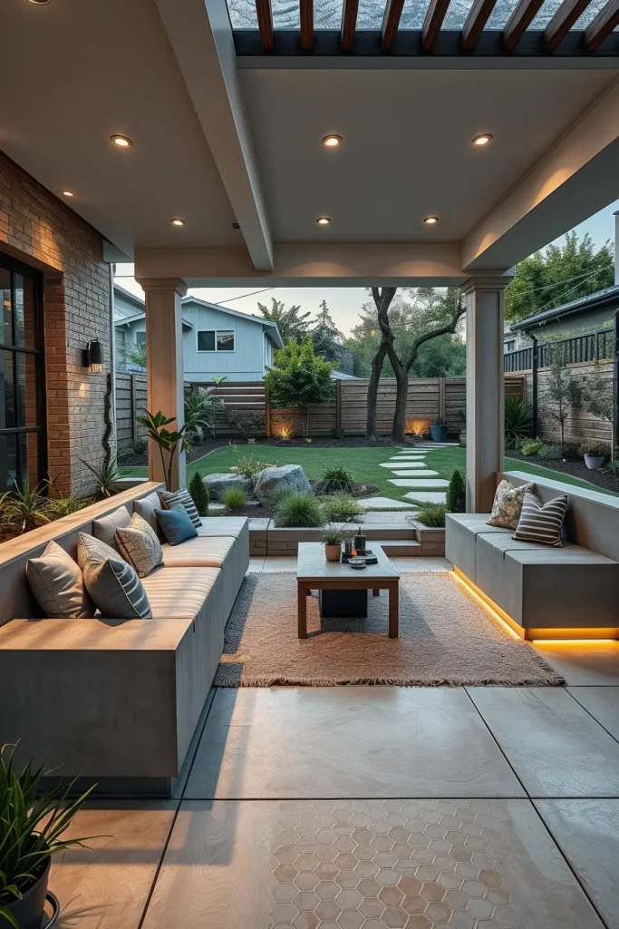 Built-in seating defines many stylish outdoor relaxing areas in 2026 because it maximizes space efficiency while maintaining a clean appearance. I design these seating systems along walls, around fire features, or integrated into raised platforms. This approach works particularly well in smaller yards or rooftop environments.