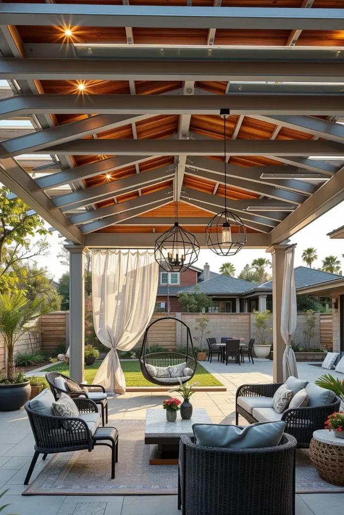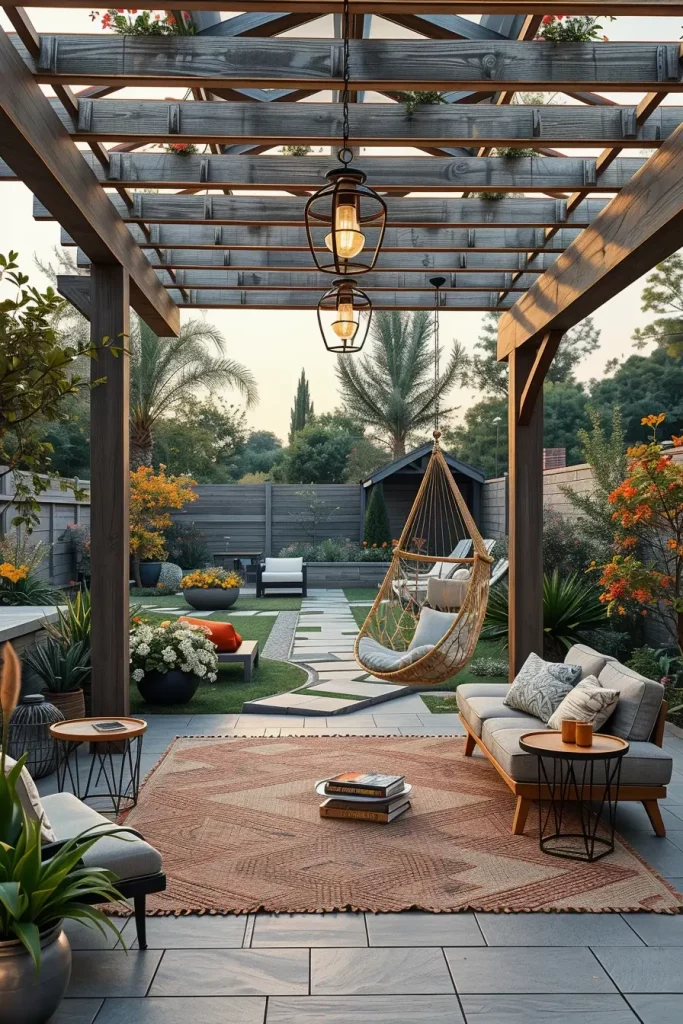 I prefer aluminum or steel pergolas with adjustable louvers, integrated drainage, and concealed lighting strips. Statement details such as wood slat ceilings, suspended swing chairs, or sculptural pendant lights transform the pergola into a true outdoor room. Adding sheer outdoor curtains enhances flexibility, offering privacy and protection from wind.