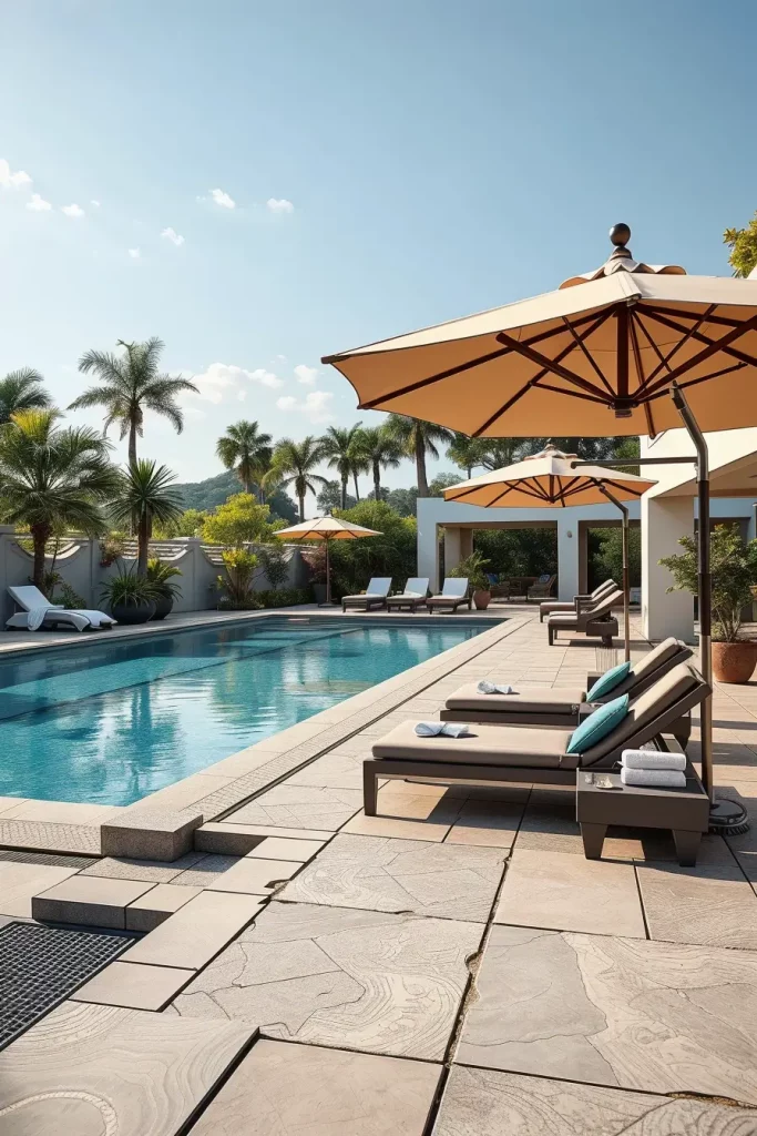 I typically incorporate adjustable chaise lounges with quick-dry cushions, sculptural side tables, and oversized designer umbrellas in architectural shapes. Shade structures are positioned strategically to balance sunlight and comfort throughout the day. I also integrate built-in towel storage benches and concealed drainage systems to maintain a clean and organized appearance.