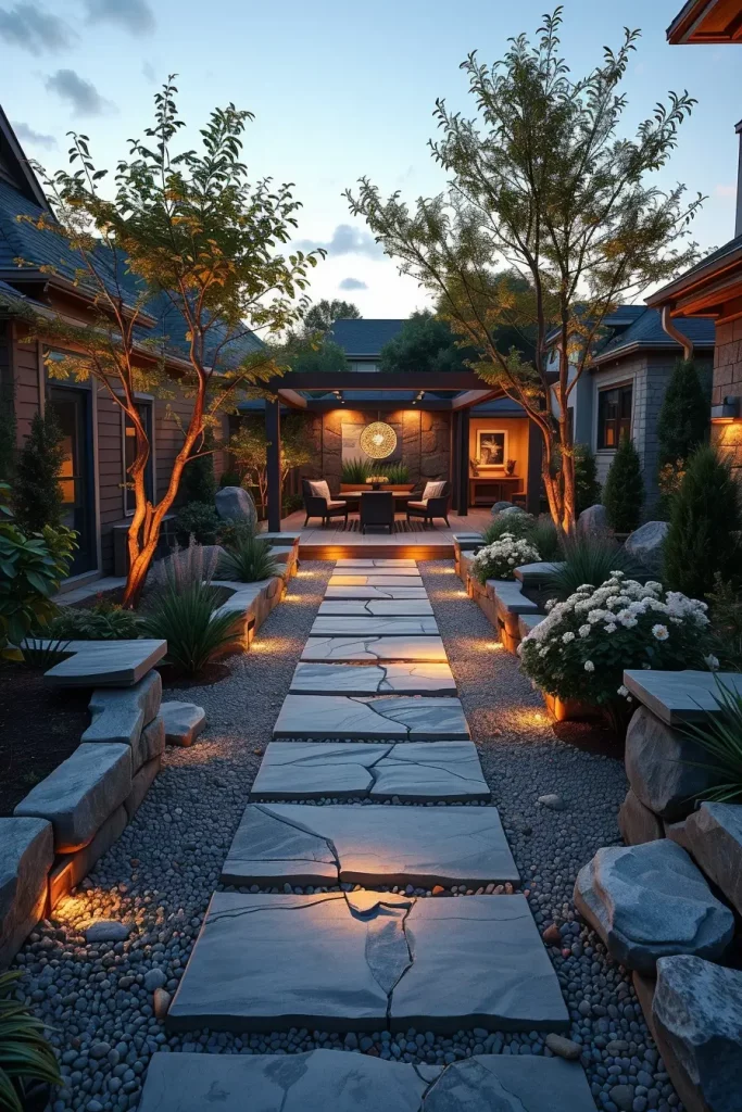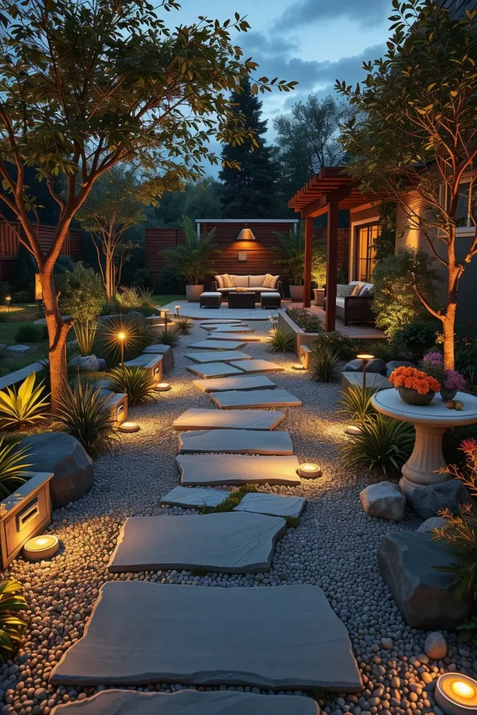 The journey toward the lounge area is just as important as the space itself. In a unique outdoor relaxing area 2026, I design pathways that guide movement intentionally while enhancing visual interest. I often use large stepping stones, textured concrete slabs, or natural stone pavers set within gravel or ground cover to create rhythm and direction.