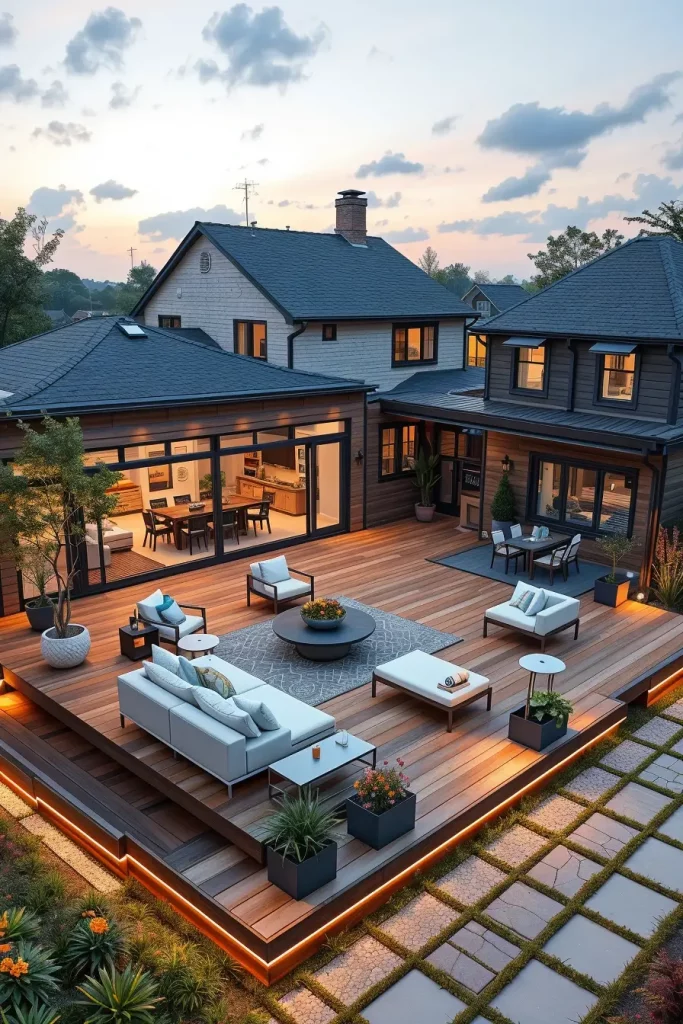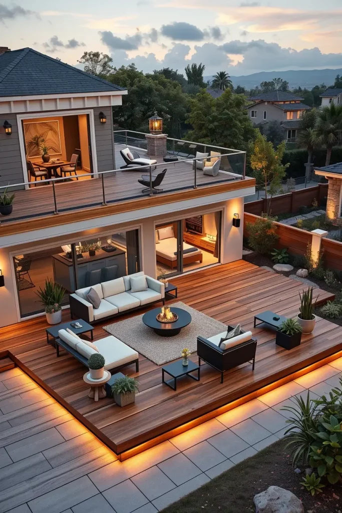 I select composite decking or treated hardwood for longevity, combined with concealed support systems that enhance the floating illusion. Built-in LED strip lighting under deck edges creates a subtle glow at night. Low-profile outdoor sofas, sculptural loungers, and minimalist side tables maintain the designer aesthetic without overwhelming the architecture.