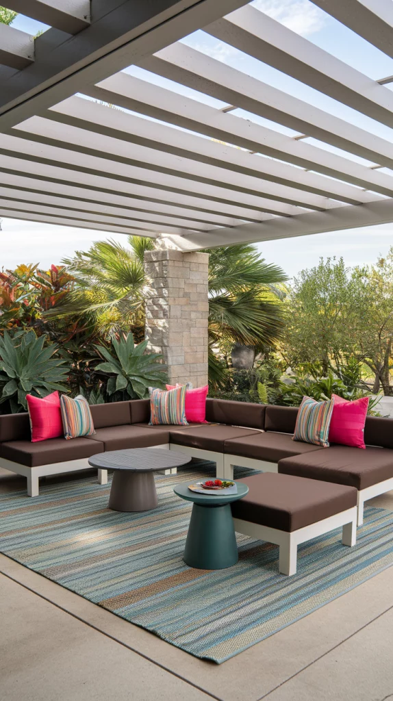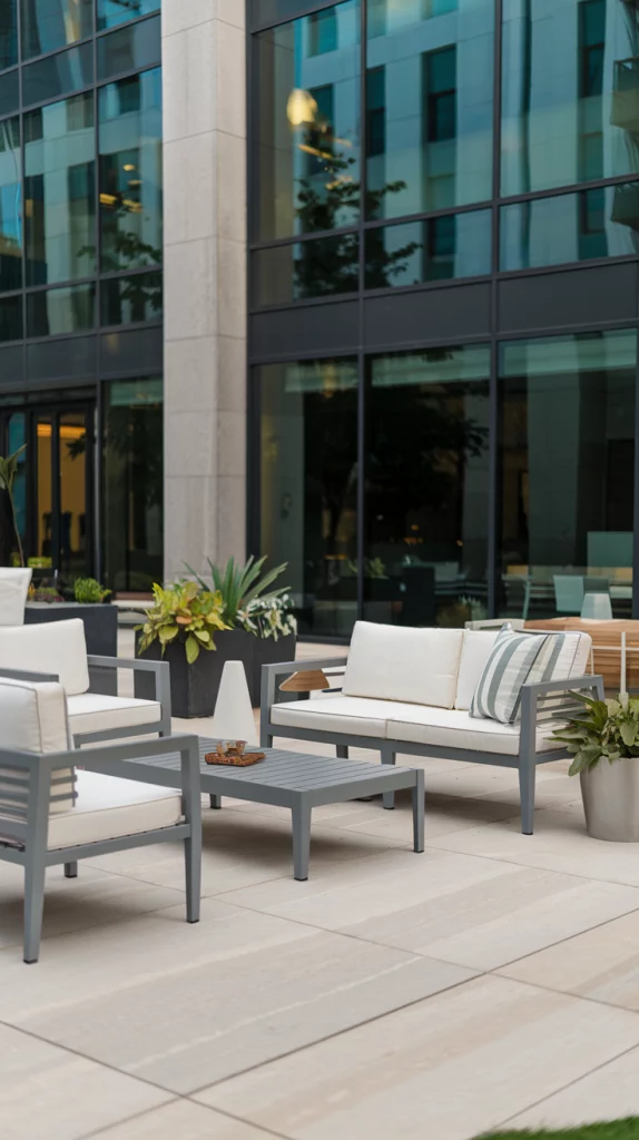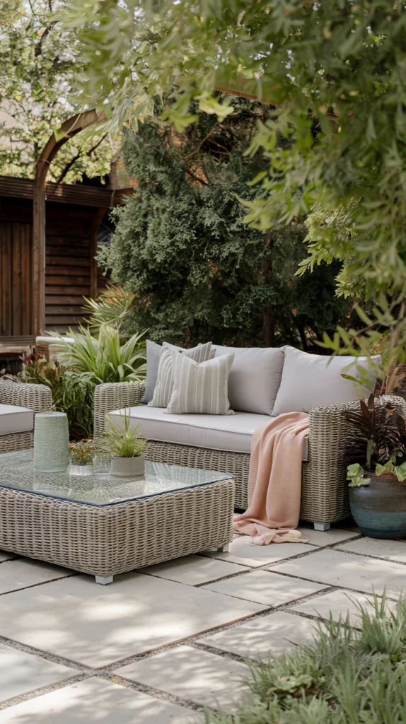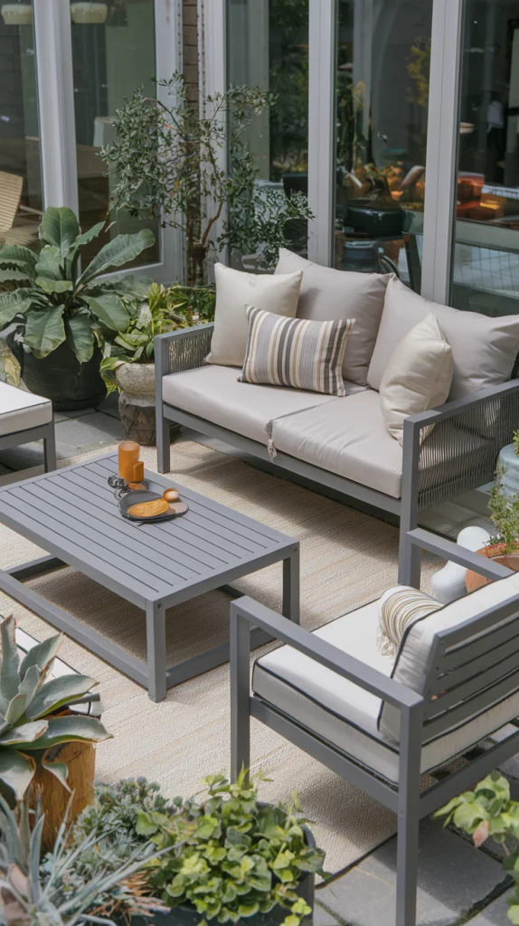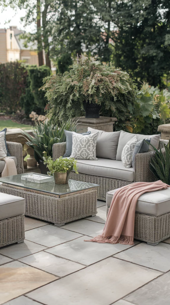 A large patio allows for expansive seating arrangements. Consider outdoor sofa sets that include multiple sections, such as L-shaped or U-shaped configurations. Pair these with a large coffee table or ottoman and accent chairs to create a welcoming space for entertaining guests. Enhance the area with potted plants and layered lighting for a dynamic effect.