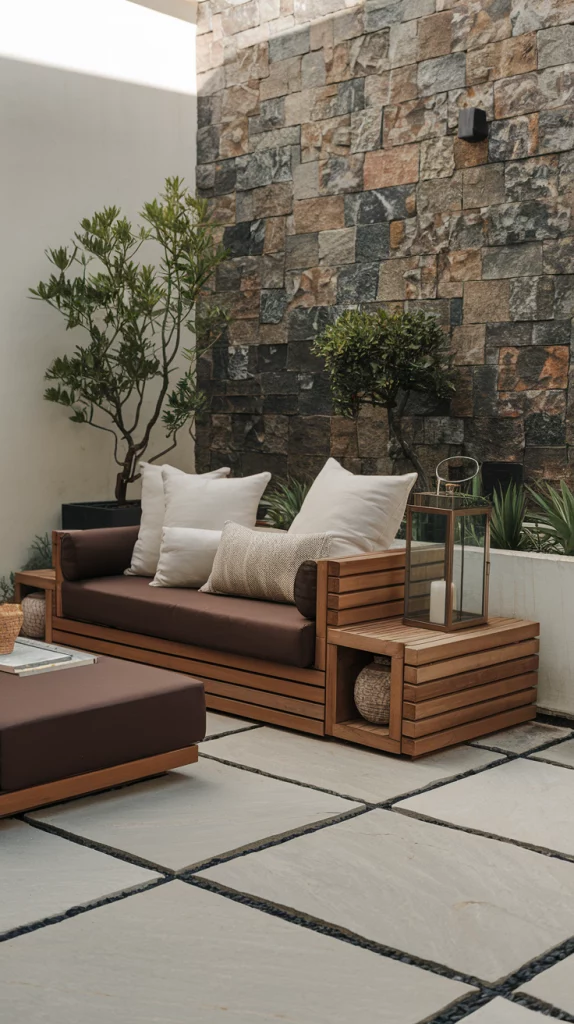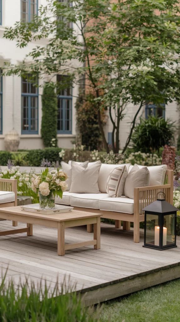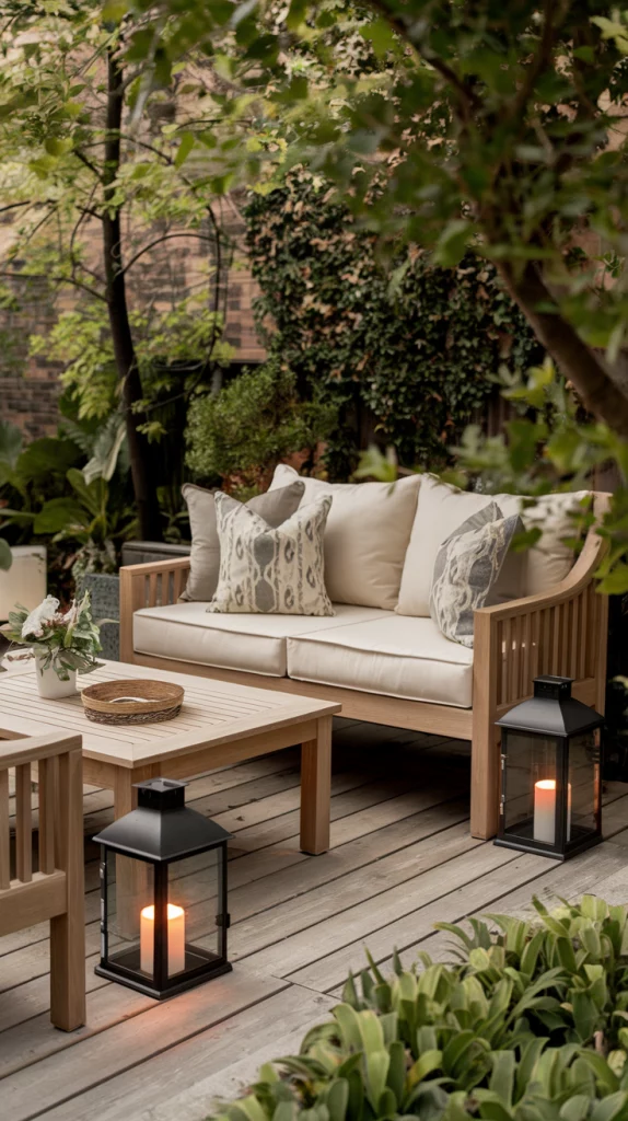 Wooden outdoor sofas exude a classic charm that suits both rustic and modern designs. Opt for teak or cedar wood frames for their durability and rich textures. Add thick, weather-resistant cushions in white or beige tones to create a warm and inviting look. Accent the area with a wooden coffee table, lantern-style lighting, and greenery for a cohesive design.
