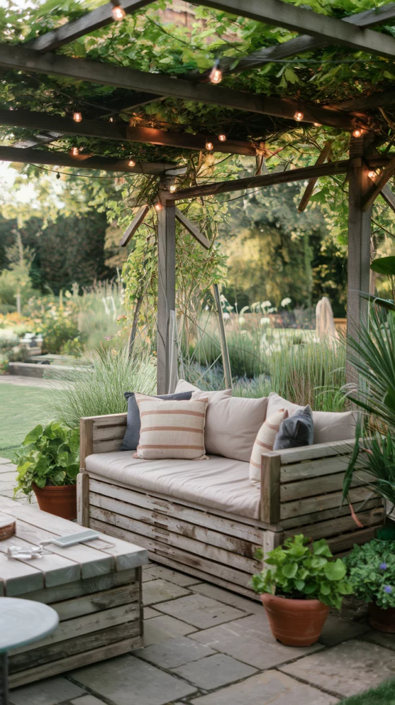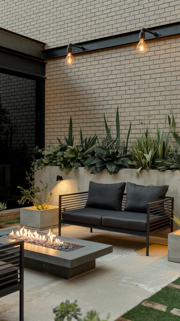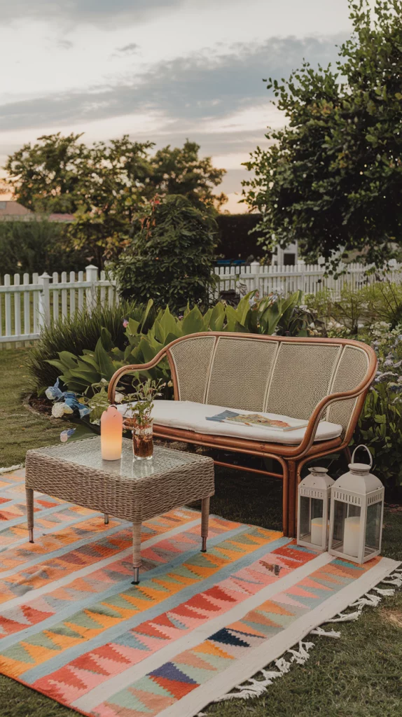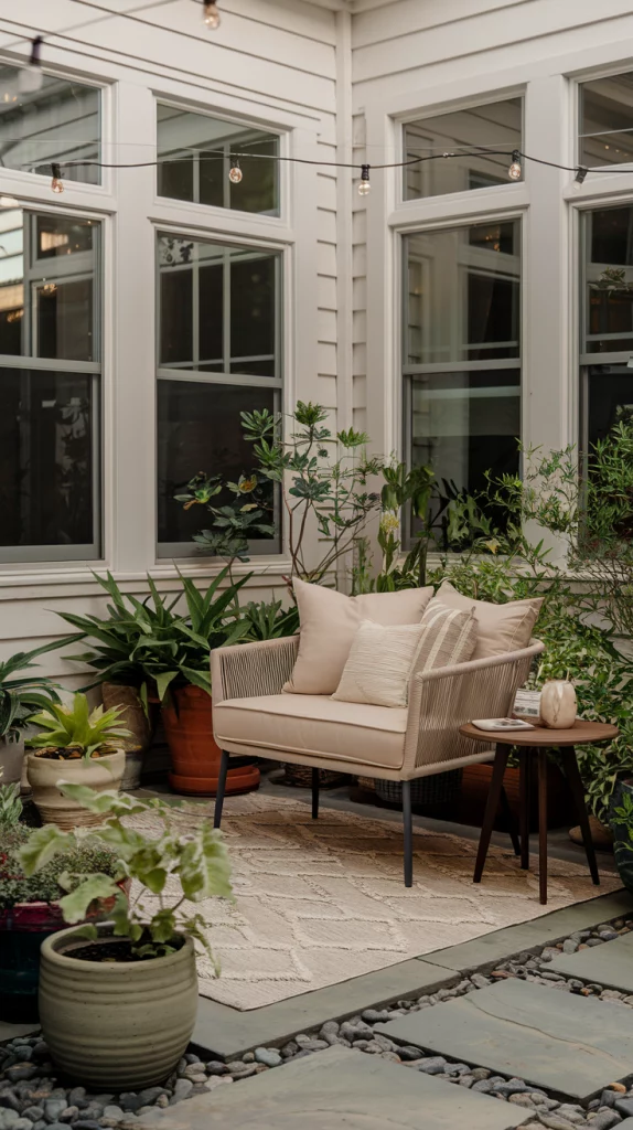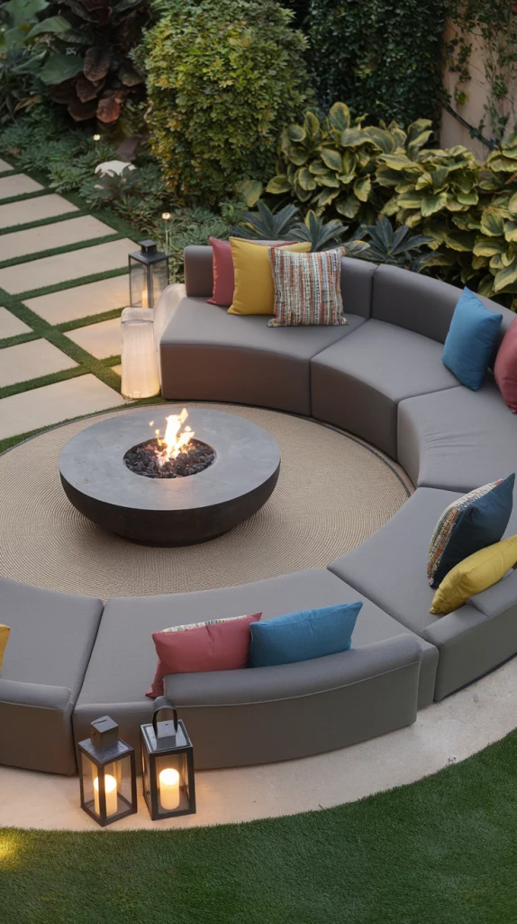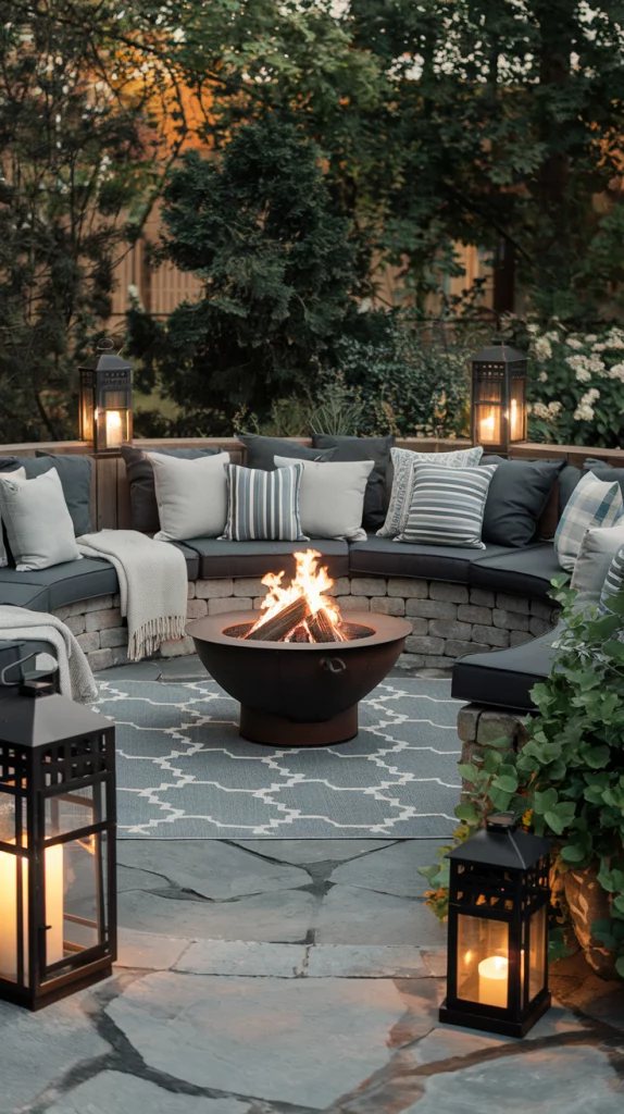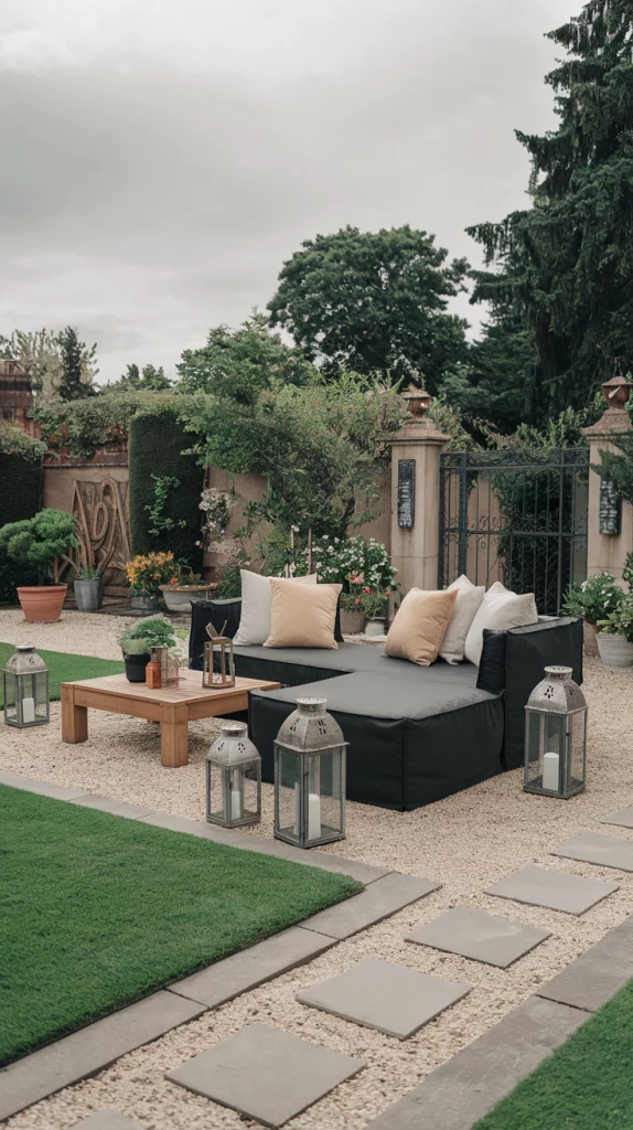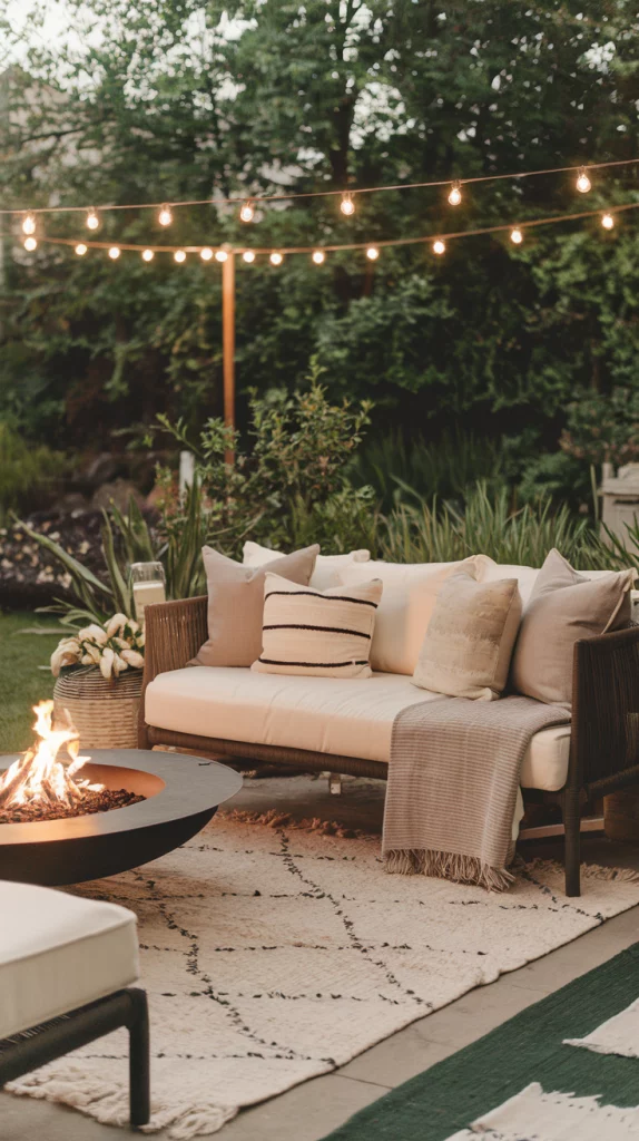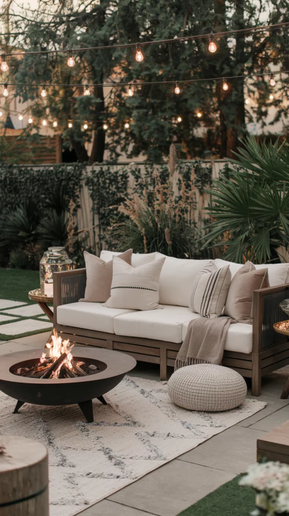 A cozy backyard lounge should feel like an extension of your living room, with plush seating and warm, inviting decor. Opt for outdoor sofas with deep cushions in neutral or earthy tones, surrounded by soft throw pillows and a textured outdoor rug. Add a fire pit or string lights for ambiance. This layout is perfect for hosting intimate gatherings or enjoying a quiet evening under the stars.