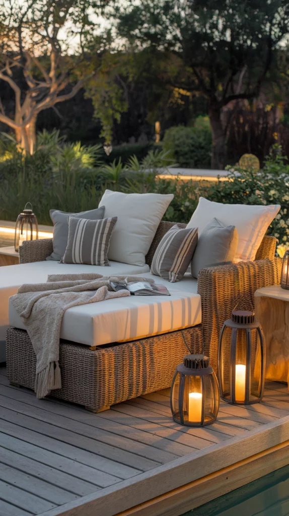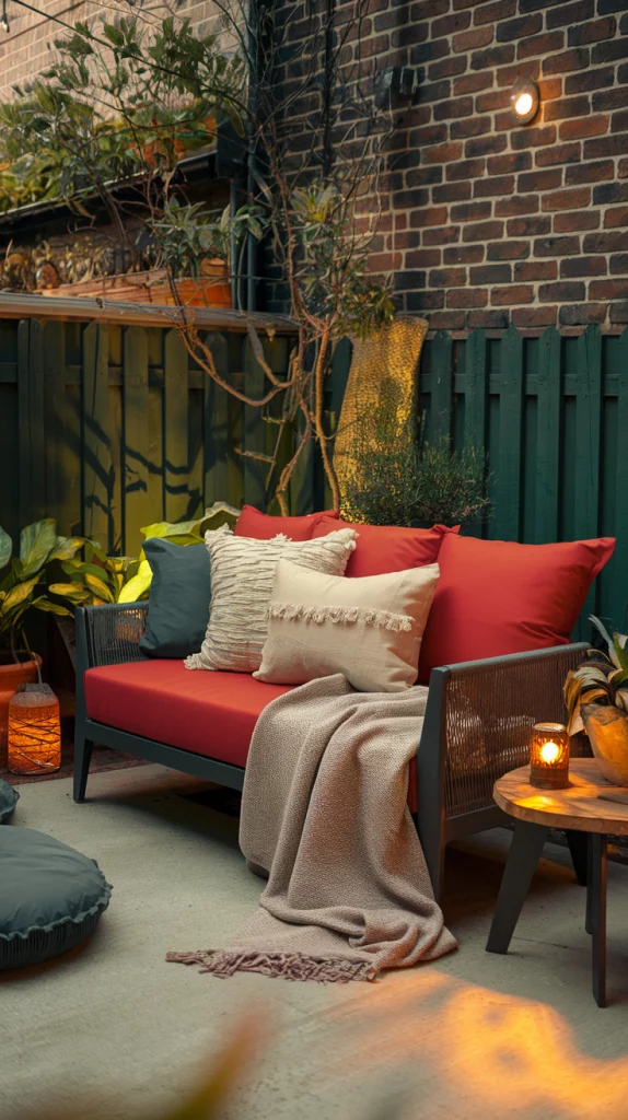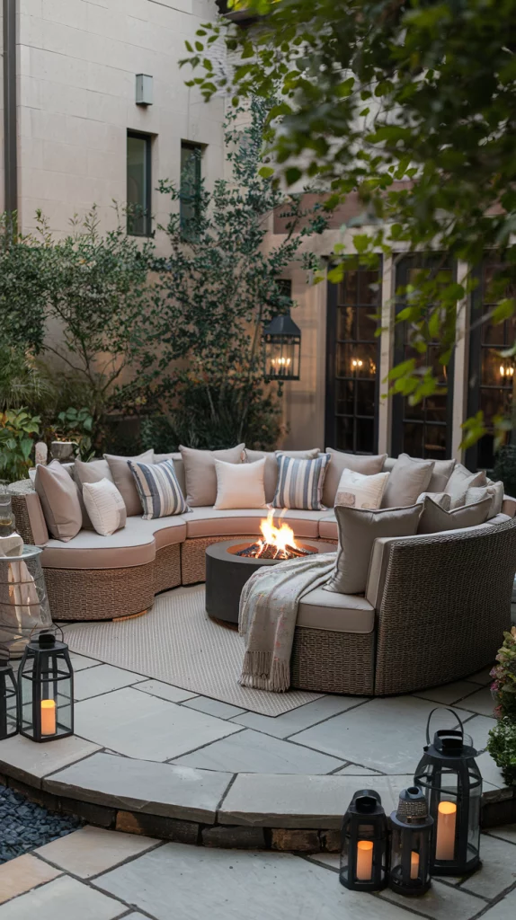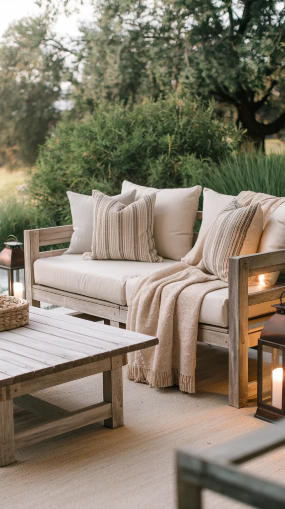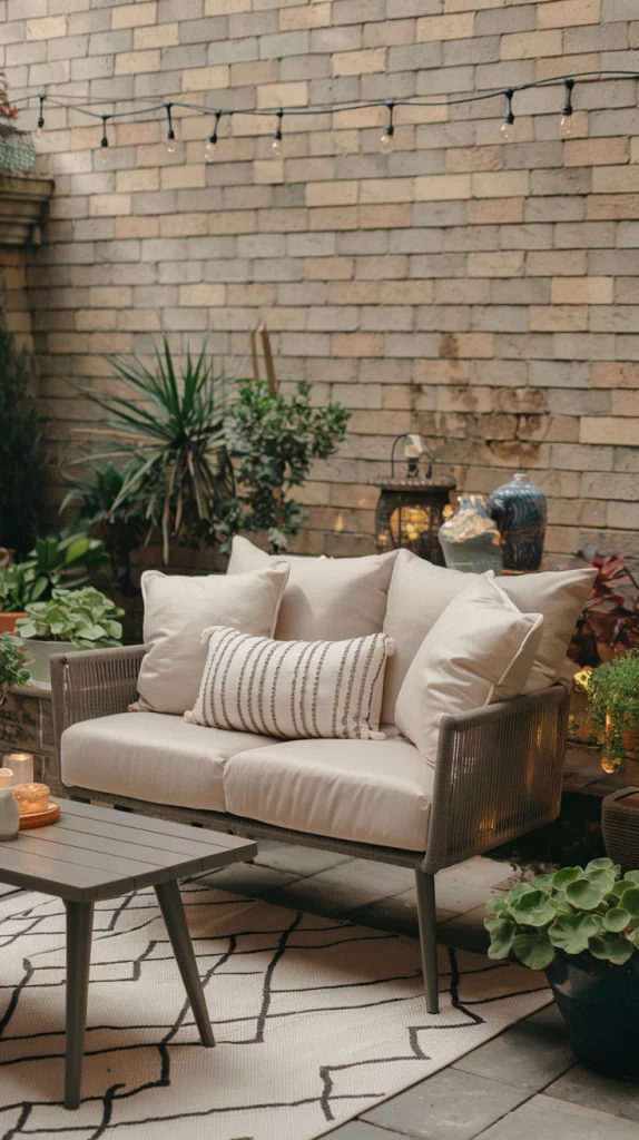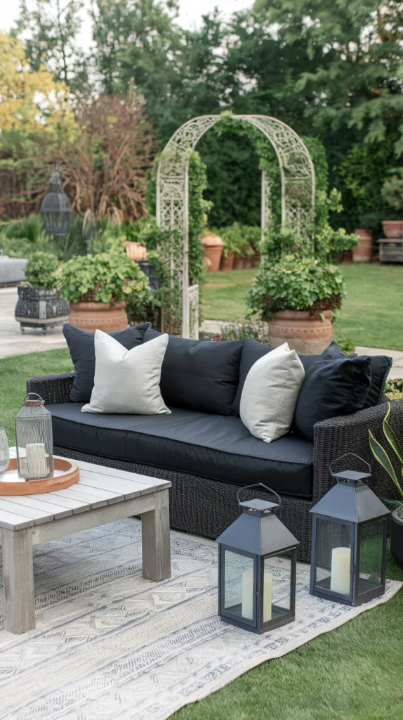 Comfort is key for outdoor relaxation. Opt for outdoor sofas with deep, plush cushions made from weather-resistant materials. Add extra layers of comfort with soft blankets and oversized pillows. Surround the area with potted plants and ambient lighting for a cozy vibe.