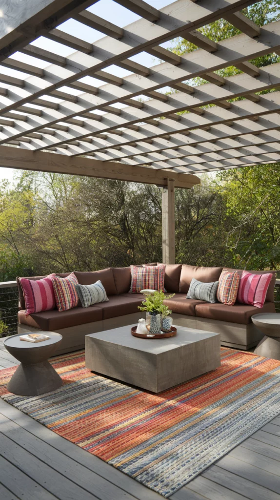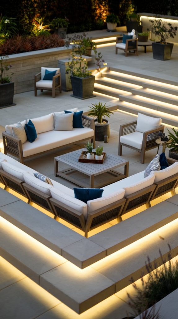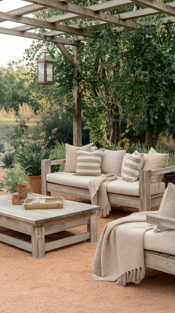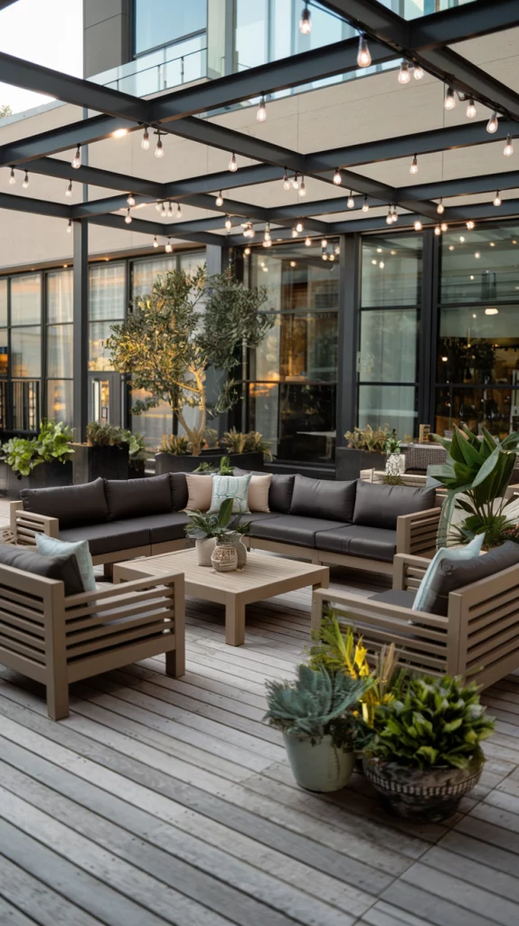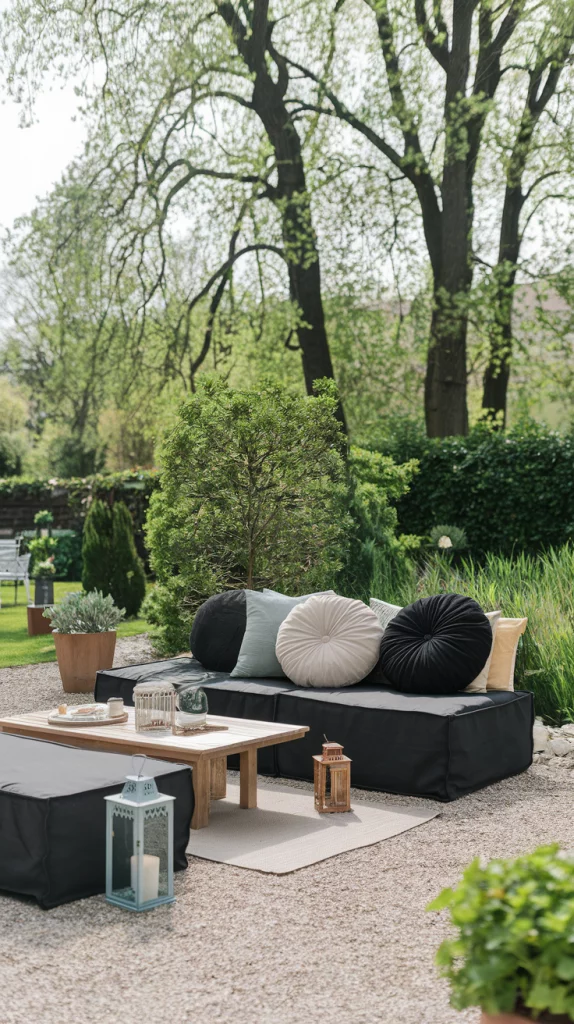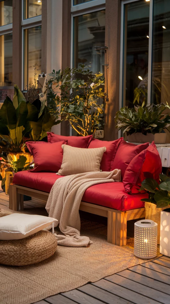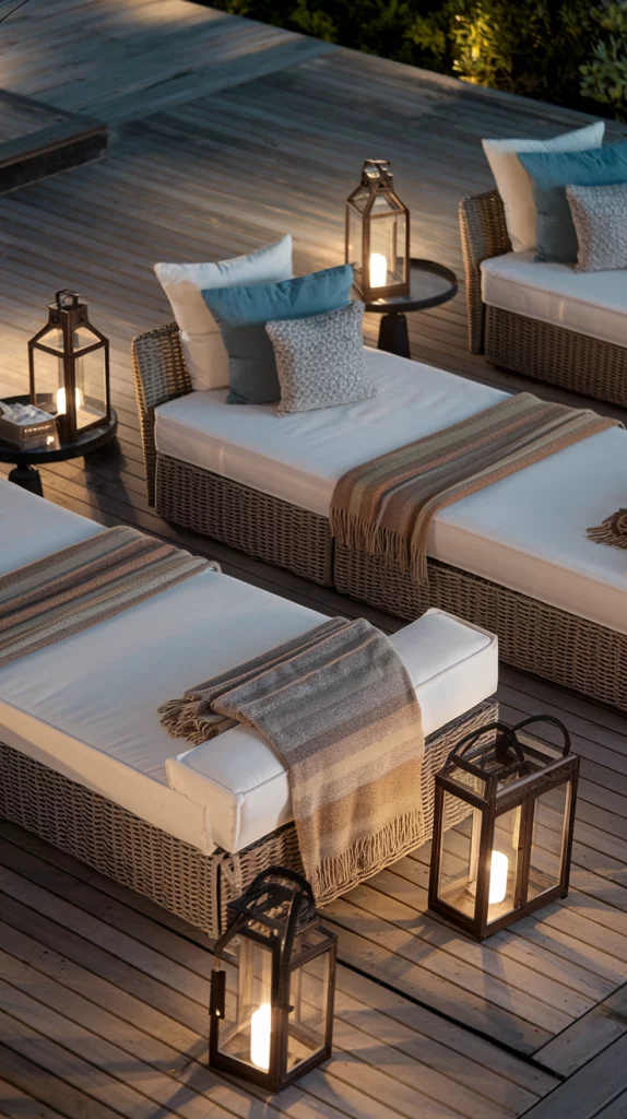 Comfort is key for outdoor relaxation. Opt for outdoor sofas with deep, plush cushions made from weather-resistant materials. Add extra layers of comfort with soft blankets and oversized pillows. Surround the area with potted plants and ambient lighting for a cozy vibe.