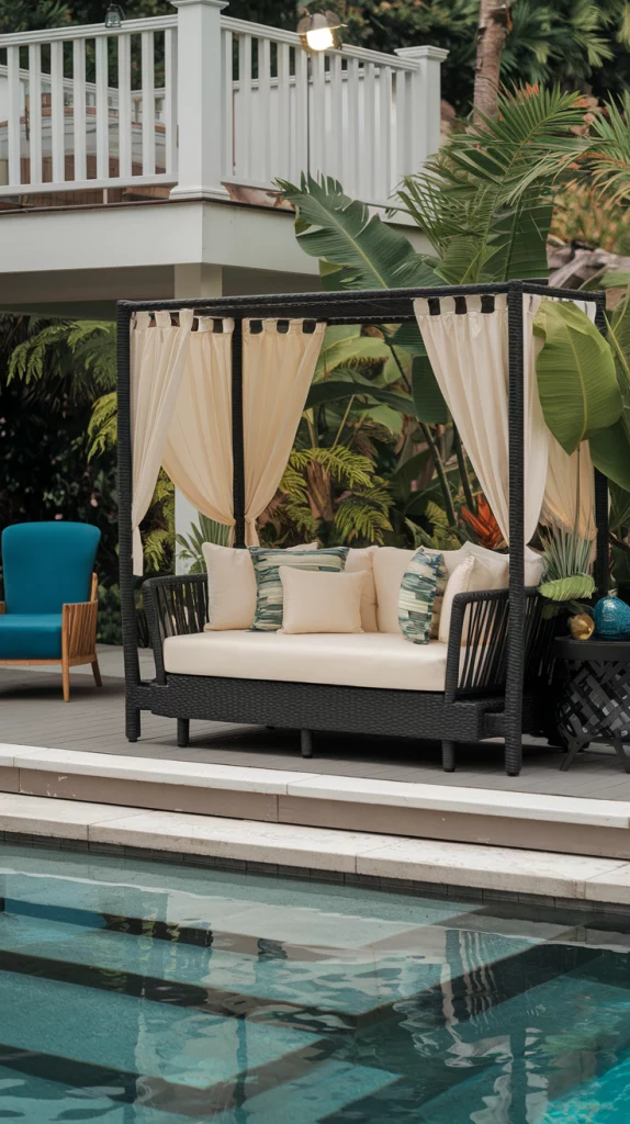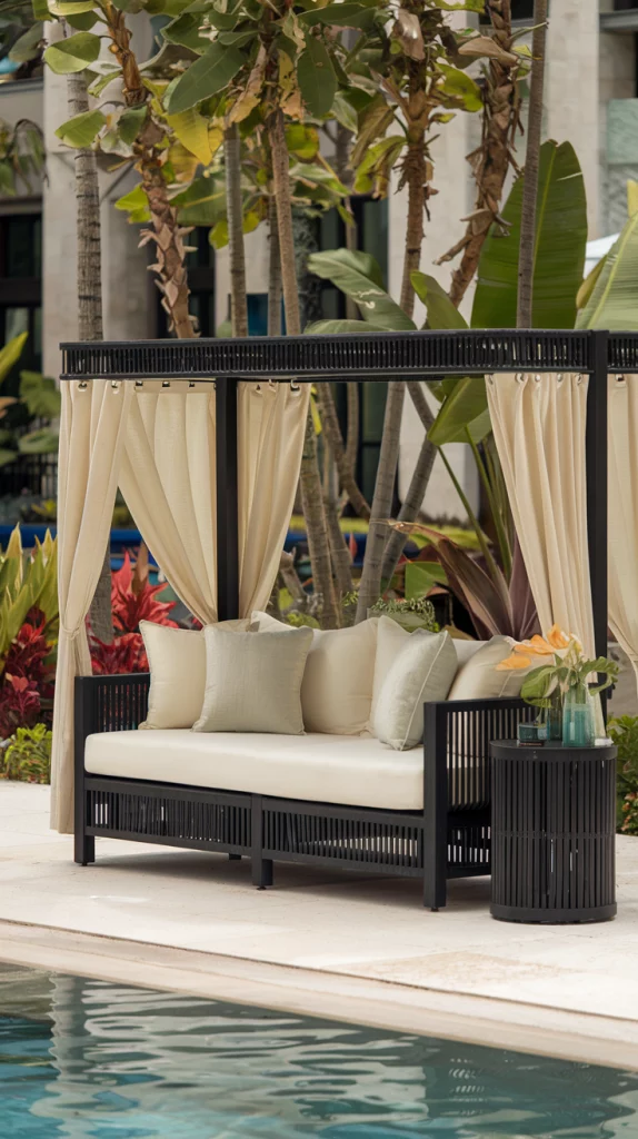 Canopy-covered outdoor sofas are the epitome of luxury and comfort. These designs offer shade and privacy, making them ideal for relaxing on sunny days. Choose a sofa with plush cushions, adjustable canopies, and elegant side curtains. Enhance the setup with lanterns, a side table, and tropical plants for a resort-inspired aesthetic.