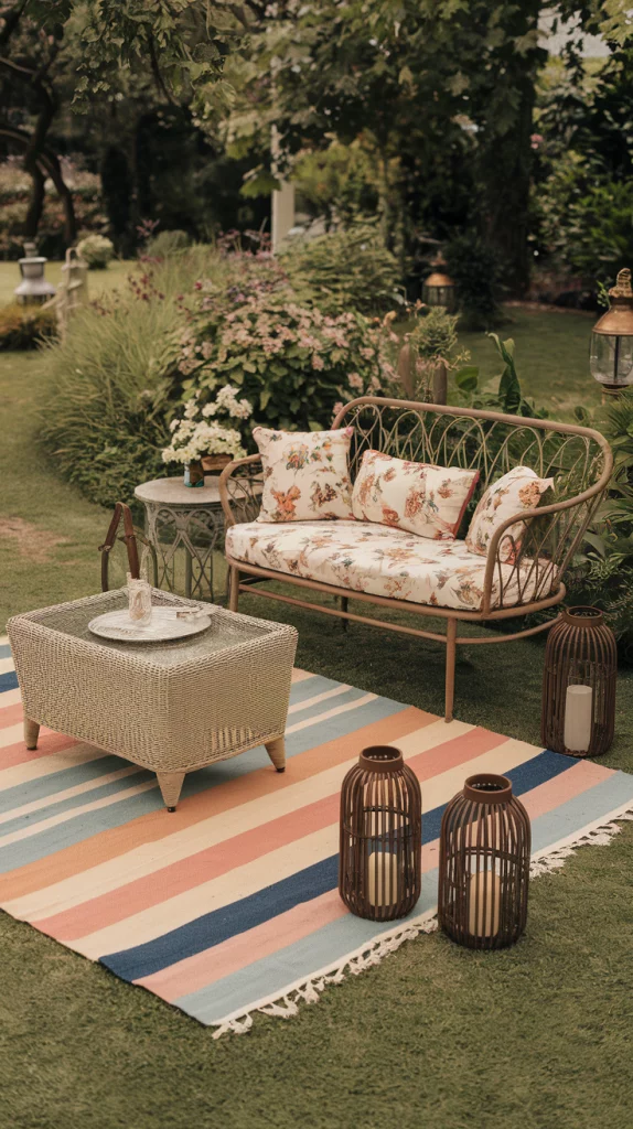 Vintage-inspired outdoor sofas bring a retro charm to your patio or garden. Look for designs with ornate metal frames, floral cushions, or wicker accents. Pair the sofa with a vintage-style coffee table, colorful outdoor rugs, and classic decor pieces like lanterns or wind chimes for a nostalgic vibe.