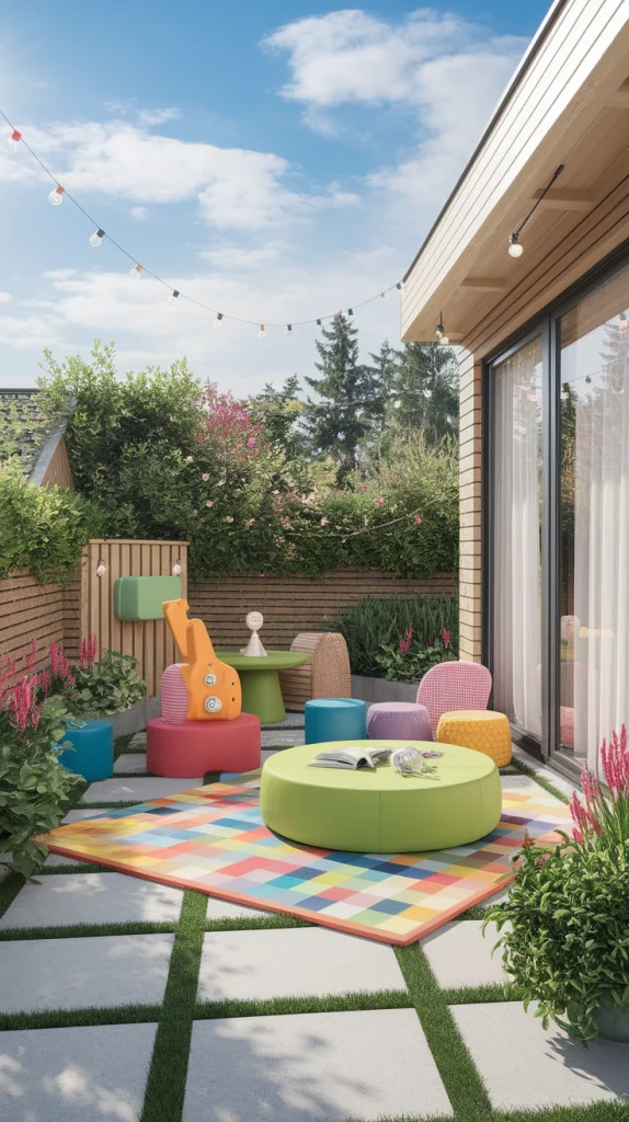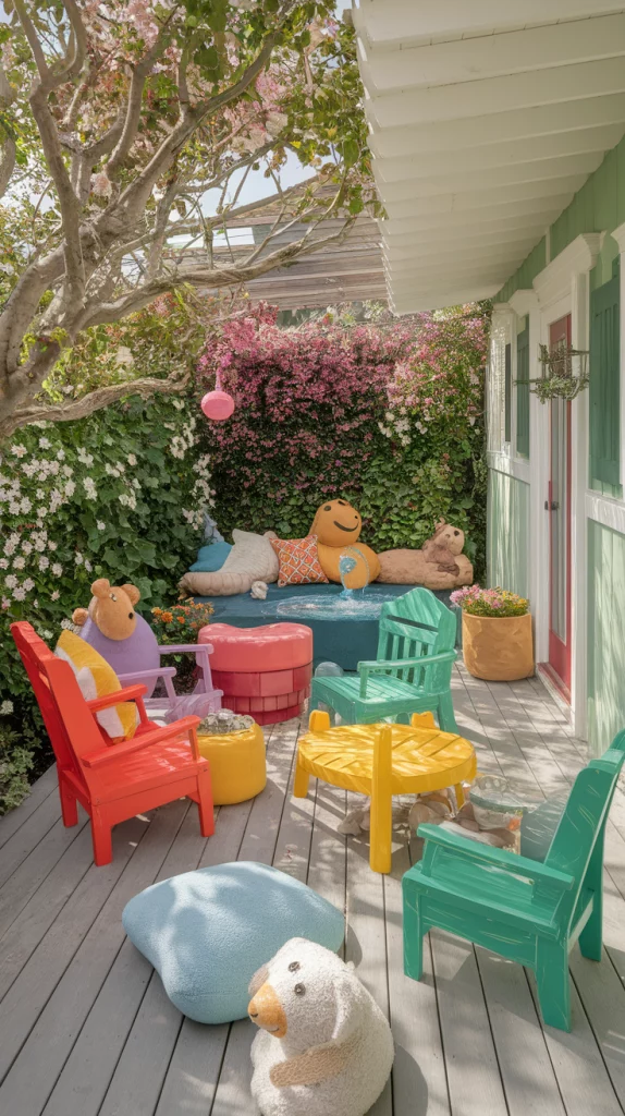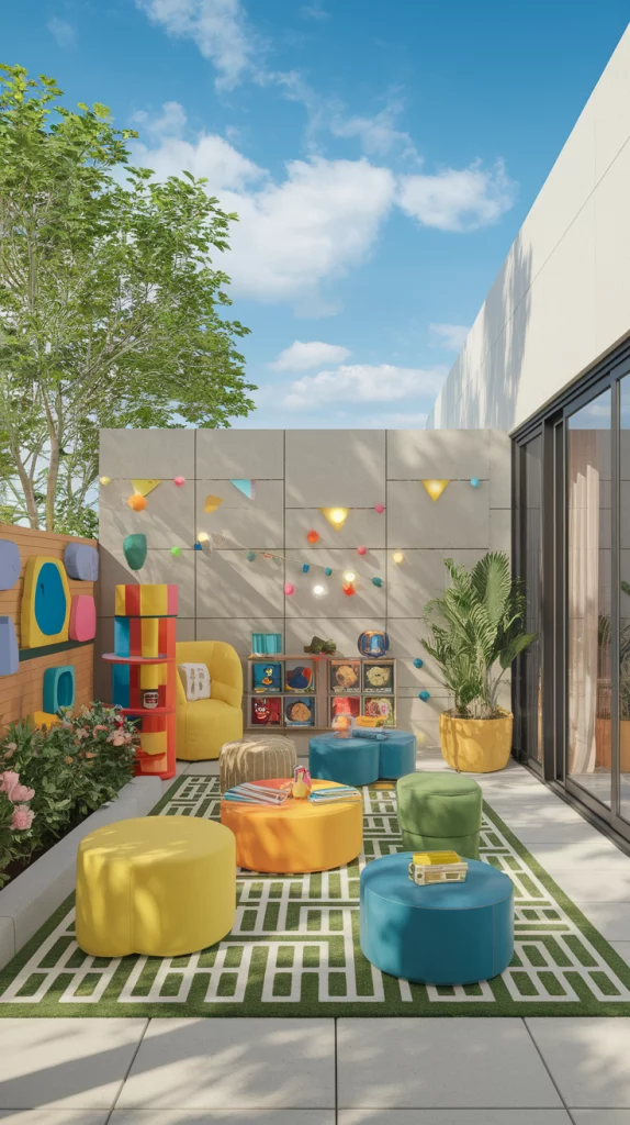 Create an outdoor space that will capture the imagination of both adults and children and look wonderful. Use furniture, decor, and soft surfaces that are modern in appearance and allows ease of playful imagination which is so required by children. This helps create a space that is suitable for family get-togethers, fun, and engaging for the children.