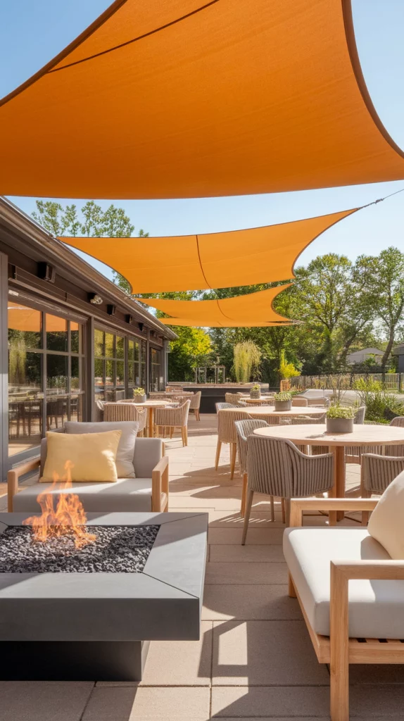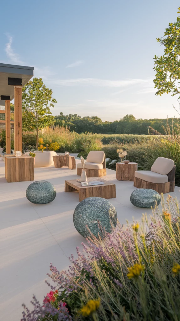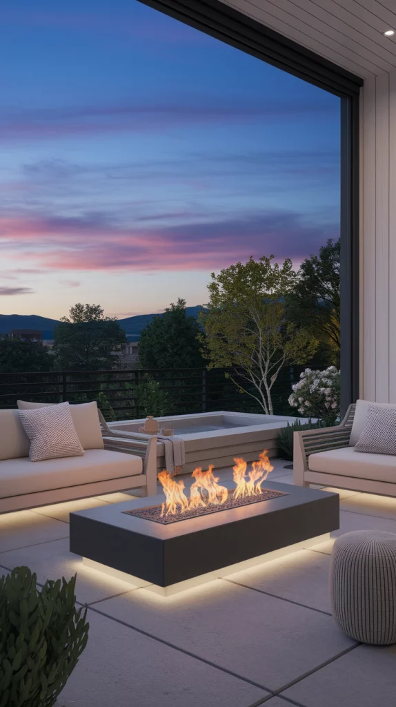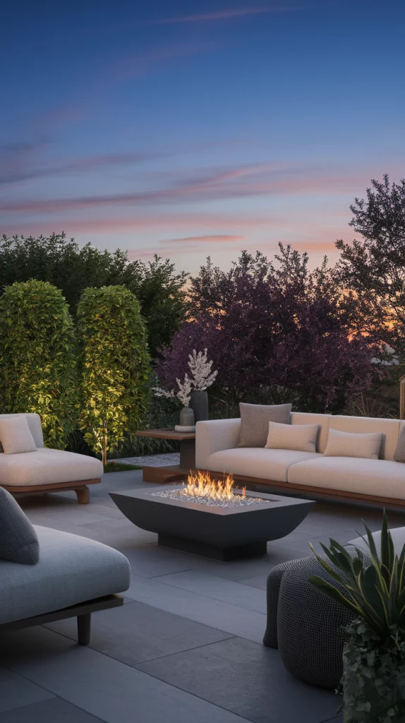 Compile your outdoor aesthetic decor concepts around an inviting fire pit that serves as the centerpiece for all your gatherings. This design features contemporary fire pit designs alongside relaxed seating and elegant decor indicating a comfortable and safe environment in summer evenings. This fusion of modern design and nature is perfect for creating a beautiful and peaceful outdoor space.