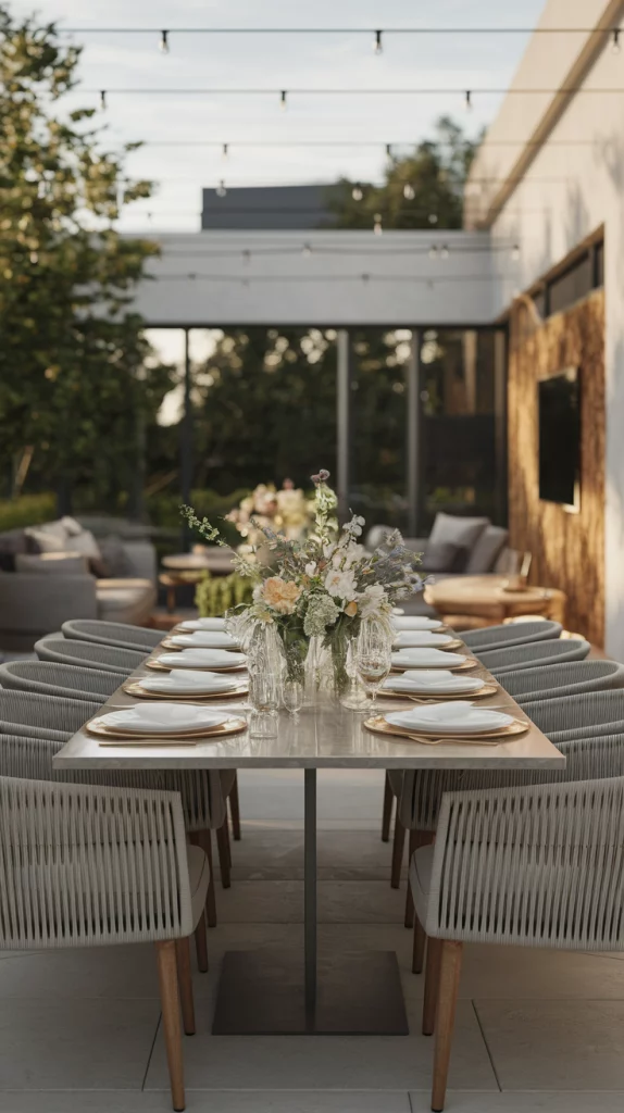 Add a touch of elegance to outdoor dining with al fresco table settings tailored for summer gatherings. Stylish centerpieces, chic tableware and summer decorations along with ambient lighting will add to the feasting atmosphere. Modern furniture and carefully curated accessories merge together to form an inviting and sophisticated dining space.