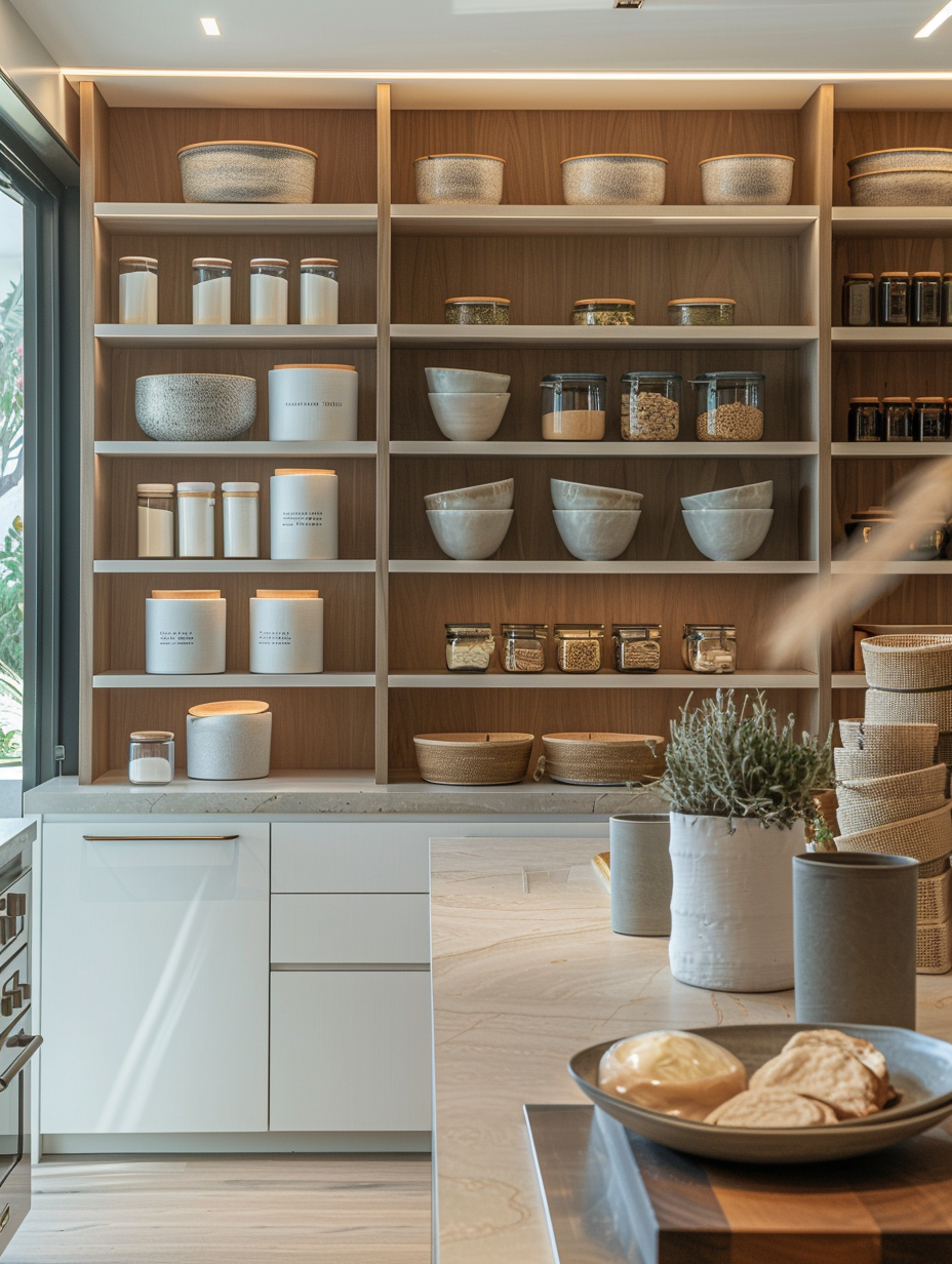 Open shelving can use the existing space on the wall and not make it feel crowded. Or you can put the dishes, pots, and the fruits and all you need. These racks can be installed on the wall or roof and, thus, empty some shelf space which makes your pantry a claustrophobia-free area.