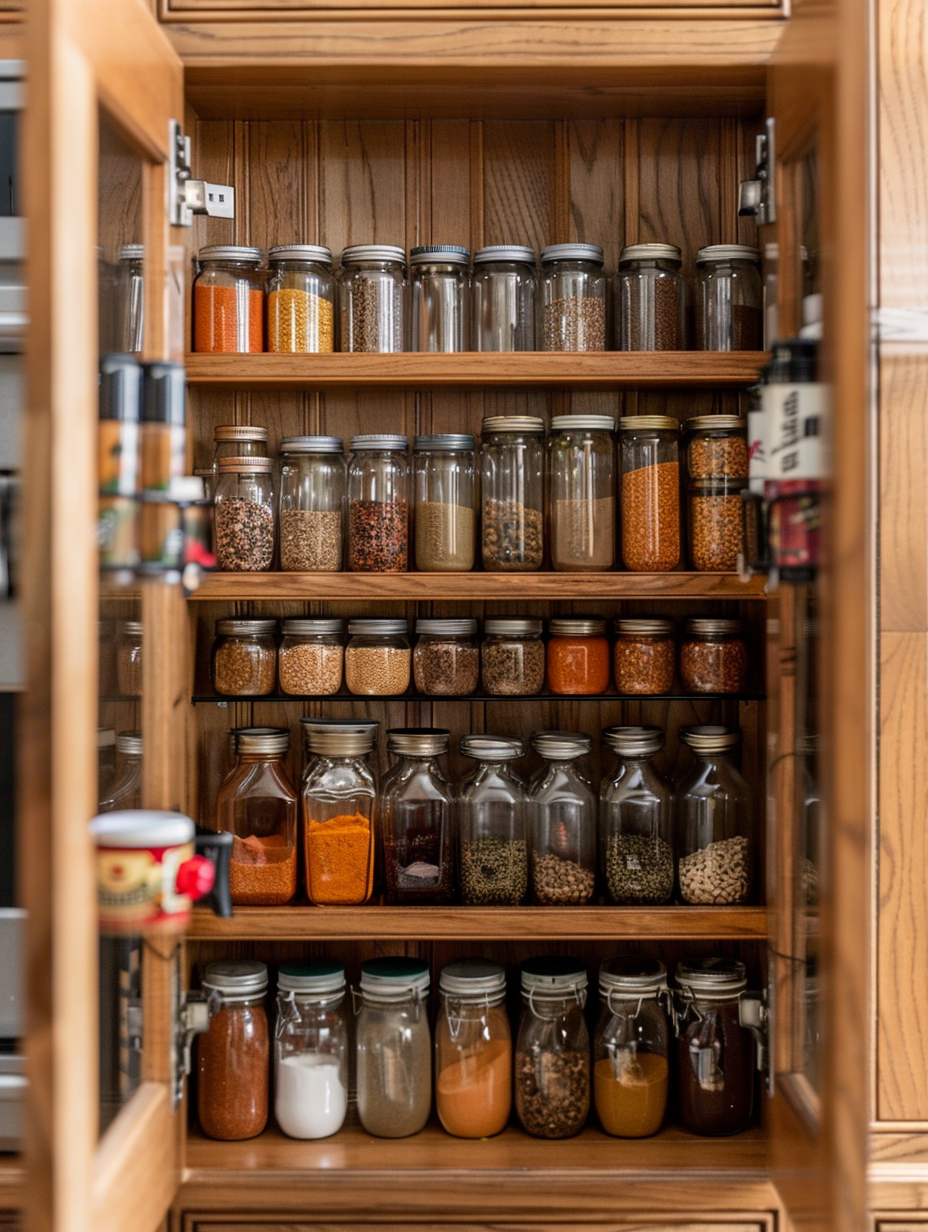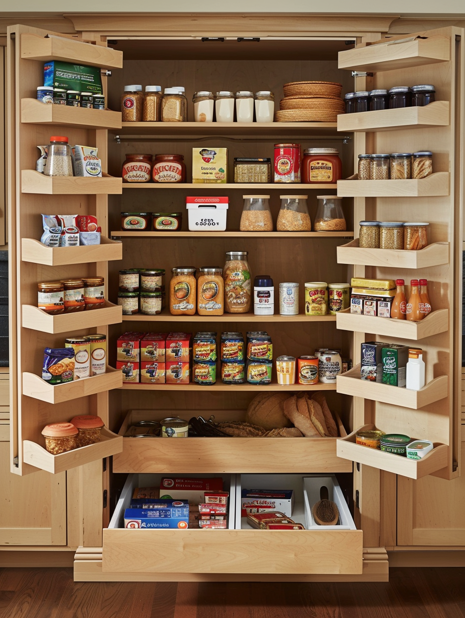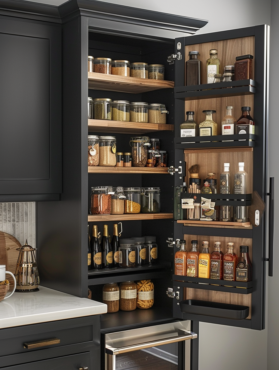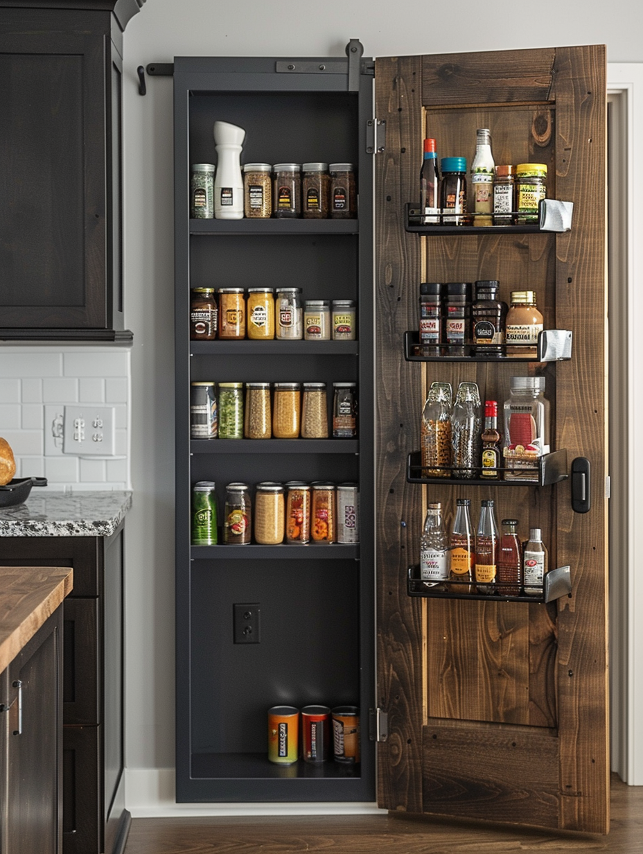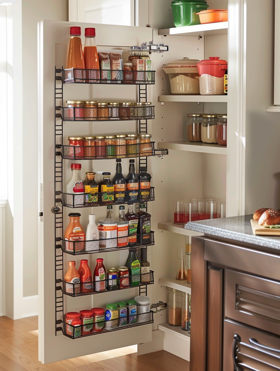 Maximizing the space in your pantry can be done by using the inside of the door. You can install shelves or racks on the inside of the pantry door to store such small items as spices, condiments, and snacks.