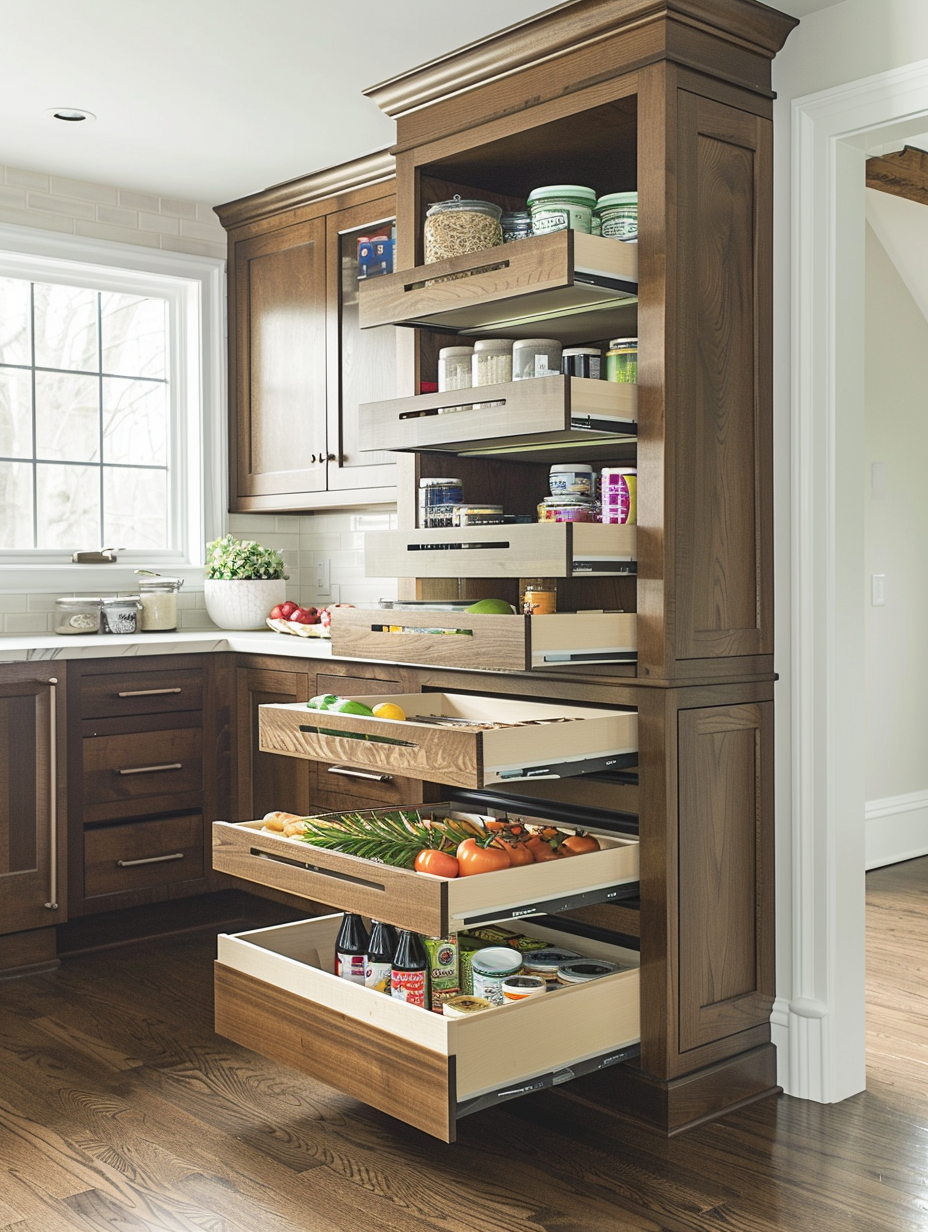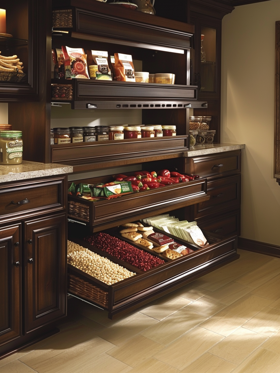 Under-shelf baskets are one of the best innovative ways for you to use all the space beneath your shelves. These baskets can hold tiny equipment, including snacks, spices, or utensils, and make them neatly organized and easily accessible to retrieve. They are an ideal option for making the most out of the space in your kitchen pantry.