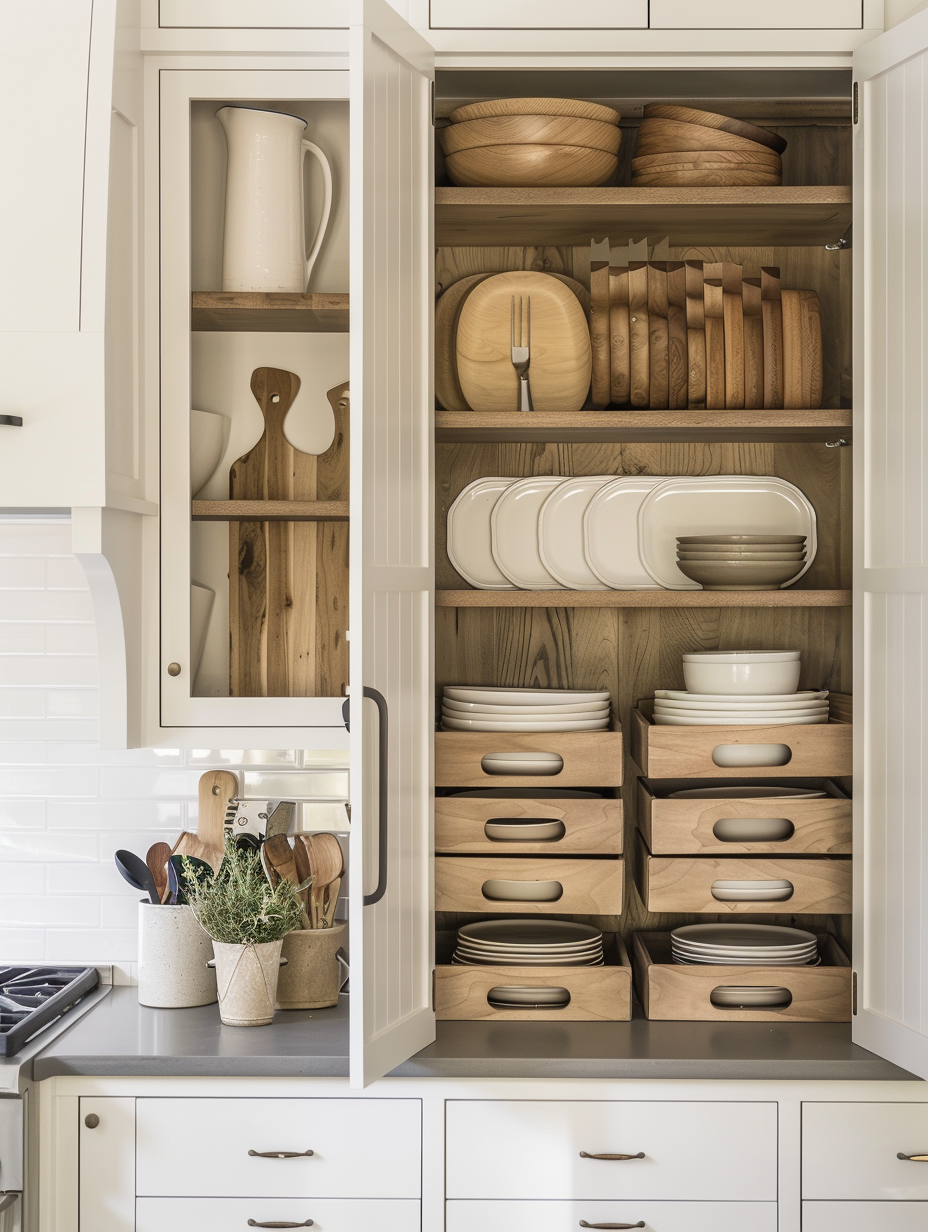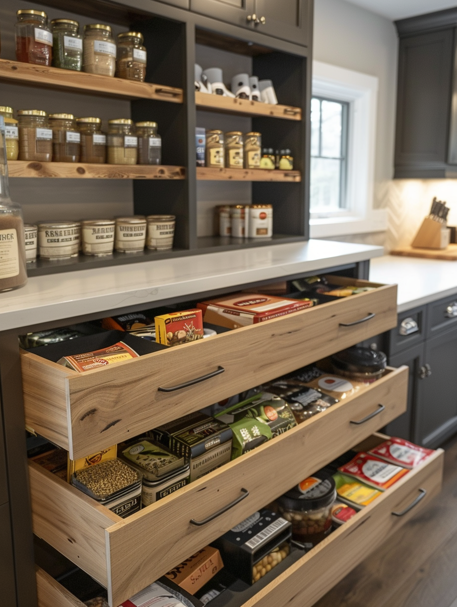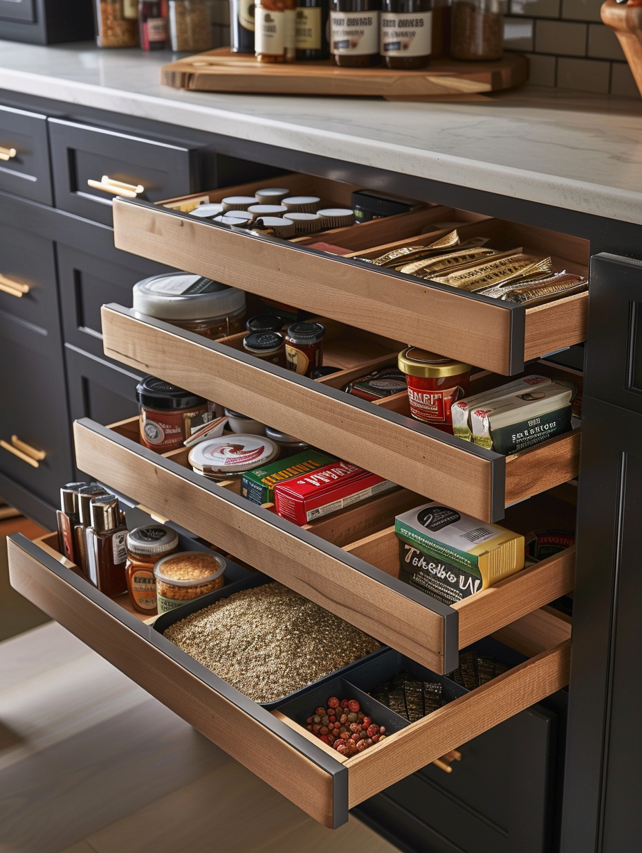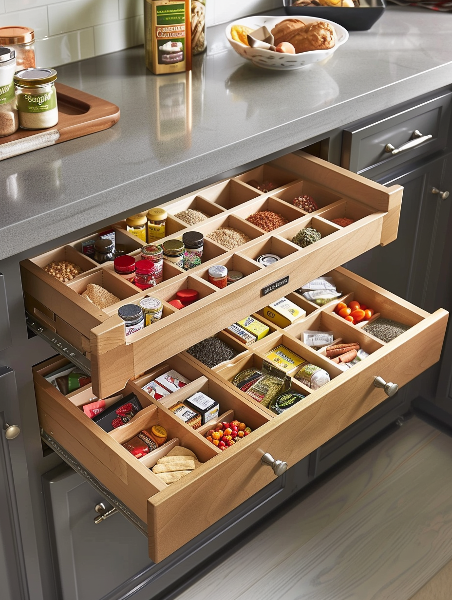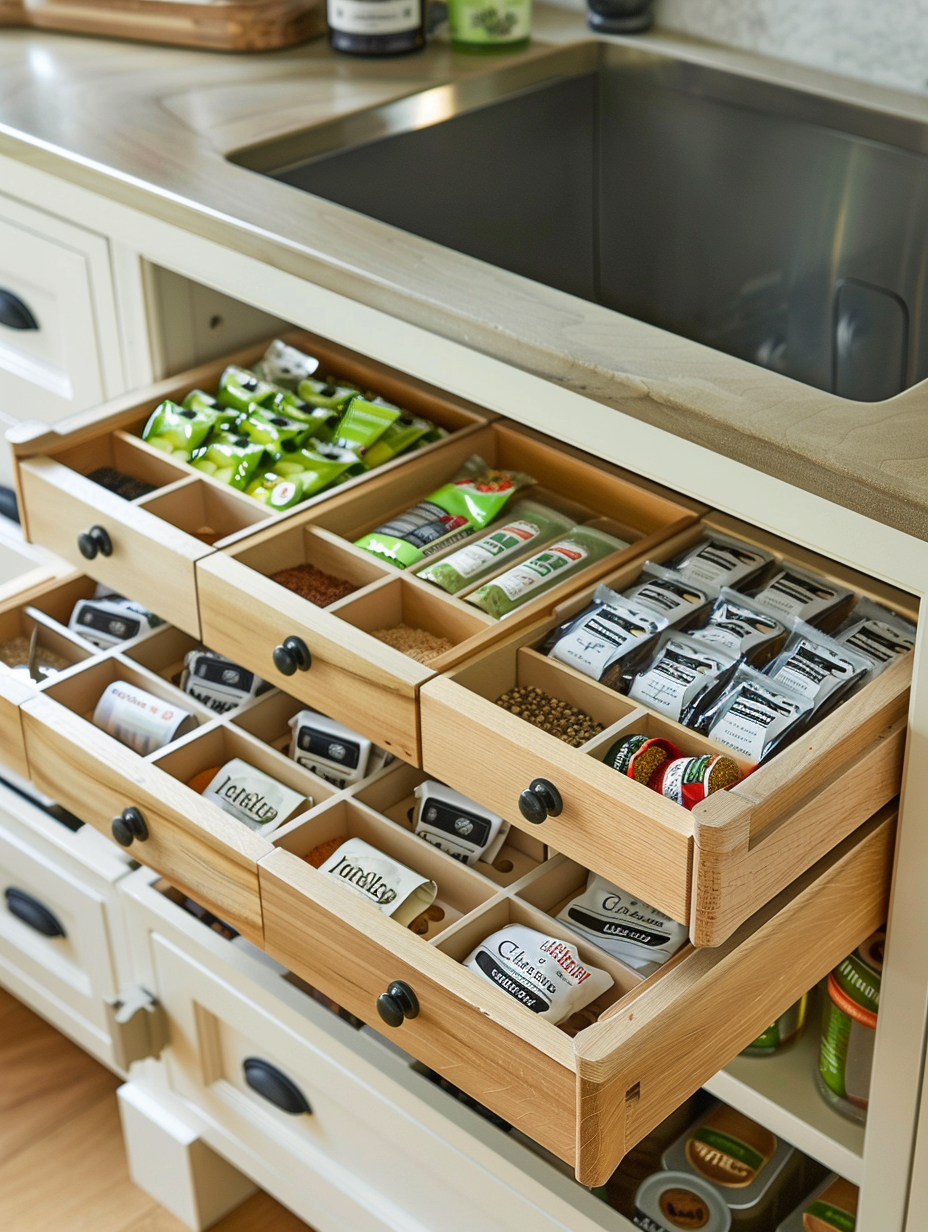 Drawer organizers are the ultimate solution to keeping small pantry items from spilling out of control. Made use of them to save such products as spice packets, tea bags, and small snacks. The organizing pieces are easy to use, small items are not lost, and it is possible to find quickly what you require.