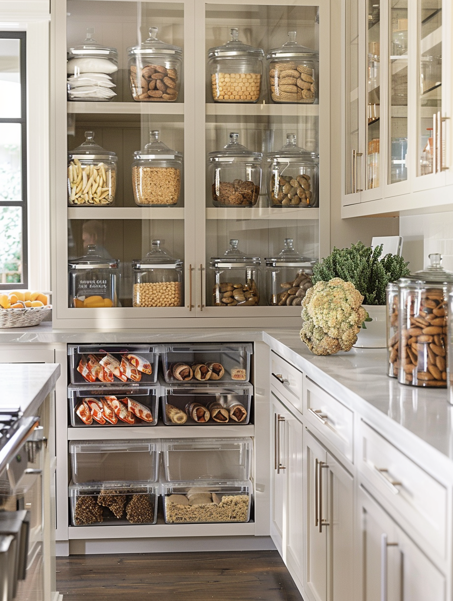 In a pantry, transparent containers are useful for keeping snacks in order, and they are convenient to acquire. You will need a variety of eating options for different tastes besides the possible deployment of different-sized containers. Utilize the written word to further highlight the organizing of your cabinet and the beauty you desire.