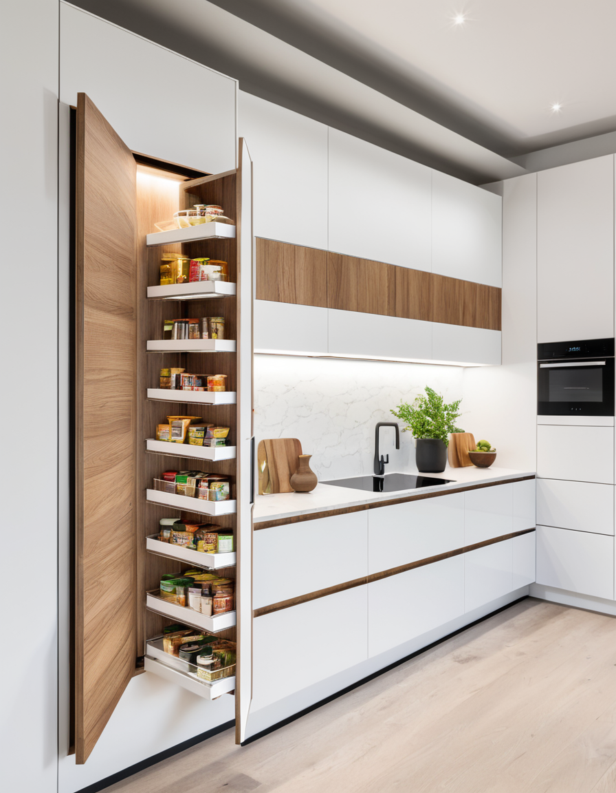 Hidden storages are a way to make your pantry design more special and find additional space without sacrificing the clean, orderly look. Use pull-out shelves, hidden drawers, or a hidden cabinet secretly behind a wall to organize your pantry better. These might be great storing solutions for infrequently used items or personal items that look less cluttered. Hidden storages appear fabulous in both minimalist and old-fashioned designs; they contribute to the renovation through surprise and glamour.