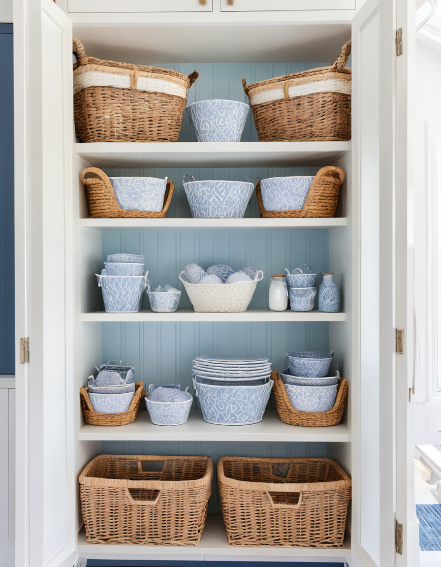 A coastal style pantry, on the other hand, will make the entire kitchen feel as if it is on the beach; light, fresh and airy. A coastal kitchen touches on many senses from sight through color, smell with certain scents and sound through the waves crashing. Get inspired by the colors that are often present in the coastal area. Both soft blues, whites and sand will contribute to the coastal vibe in the indoor space. Contrast like is the wonderful accent of light wood finishes to the motif. Some details like a shell within a wicker basket can create an aesthetic where the slight indications of the ocean are the main components.