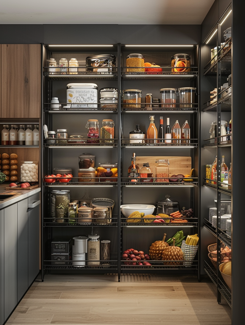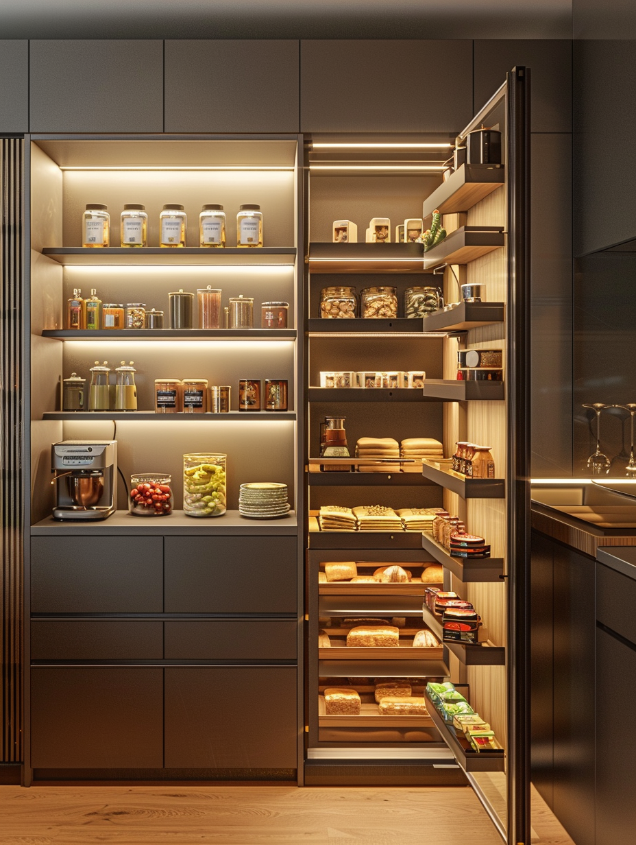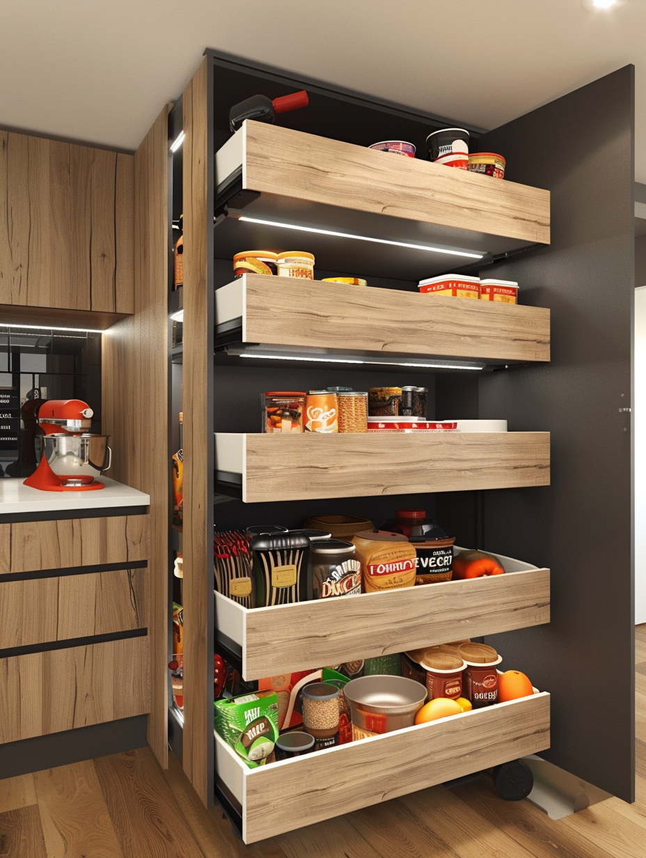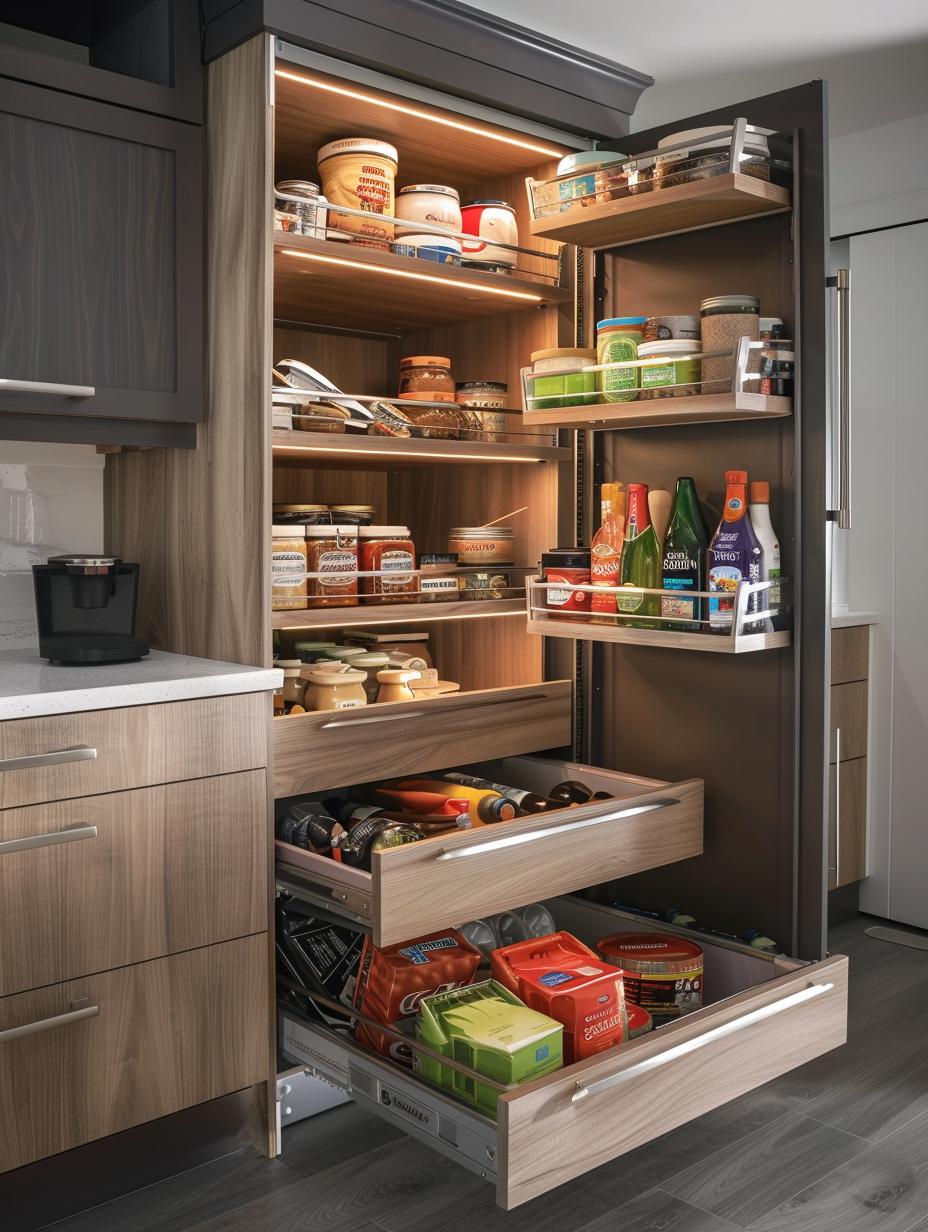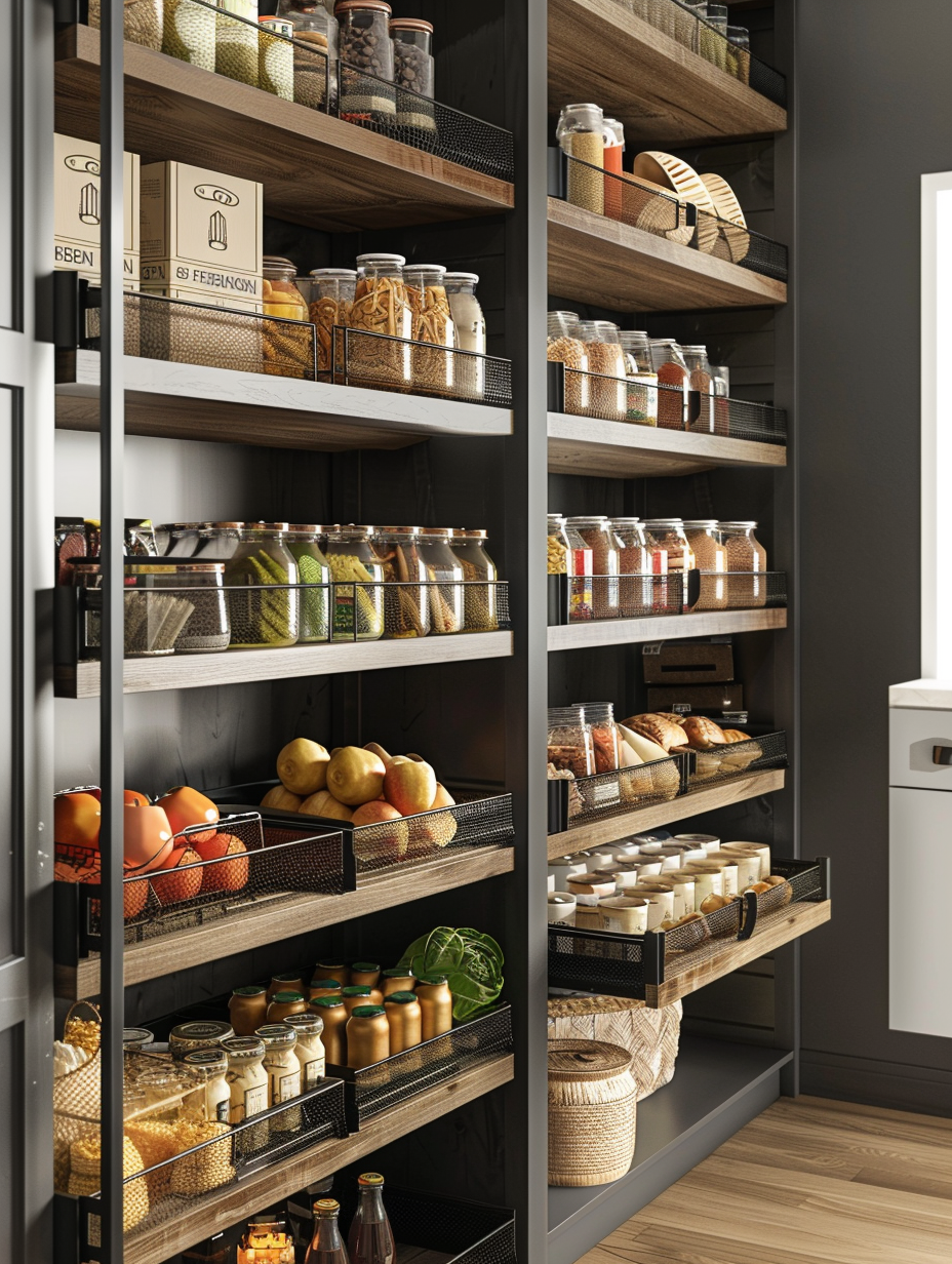Concealed pantry shelves present a neat and discreet method of storage. Mount pull-out shelves to be hidden behind cabinet doors or use sliding panels to discretely put away your pantry stock. This technique allows your kitchen to be shiny and organized with no visible mess and a simple path to cupboard essentials.