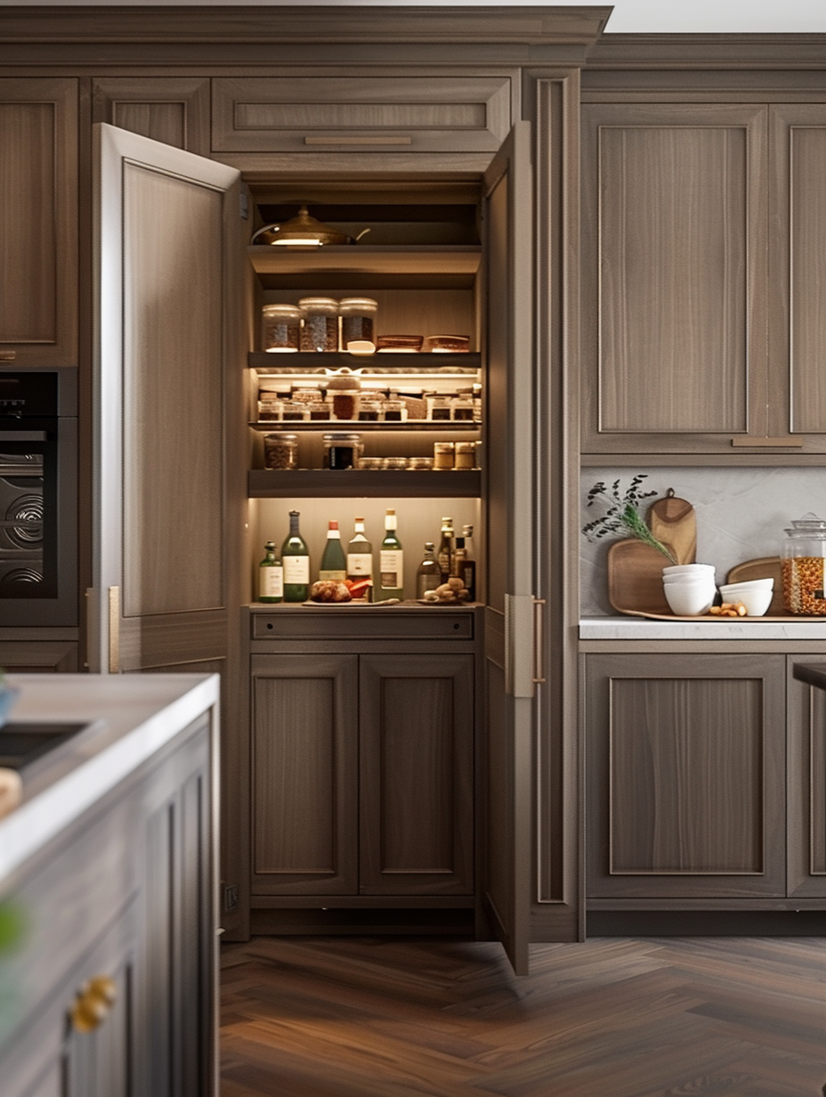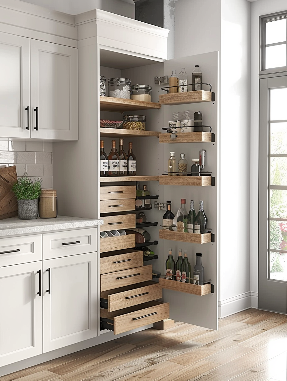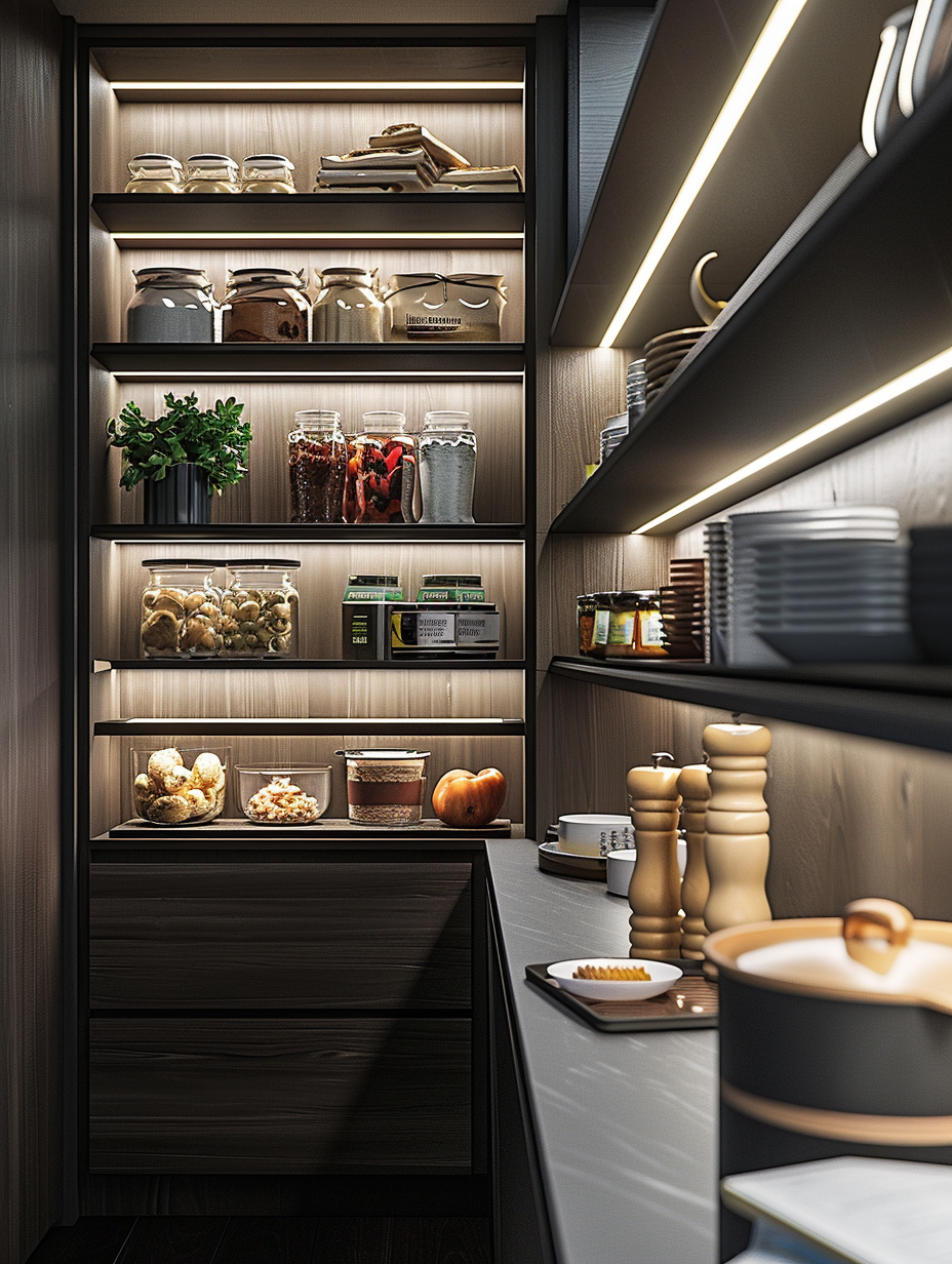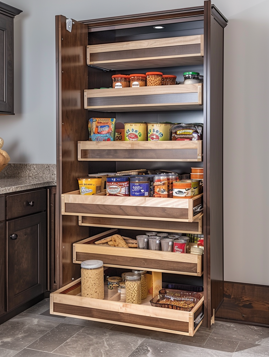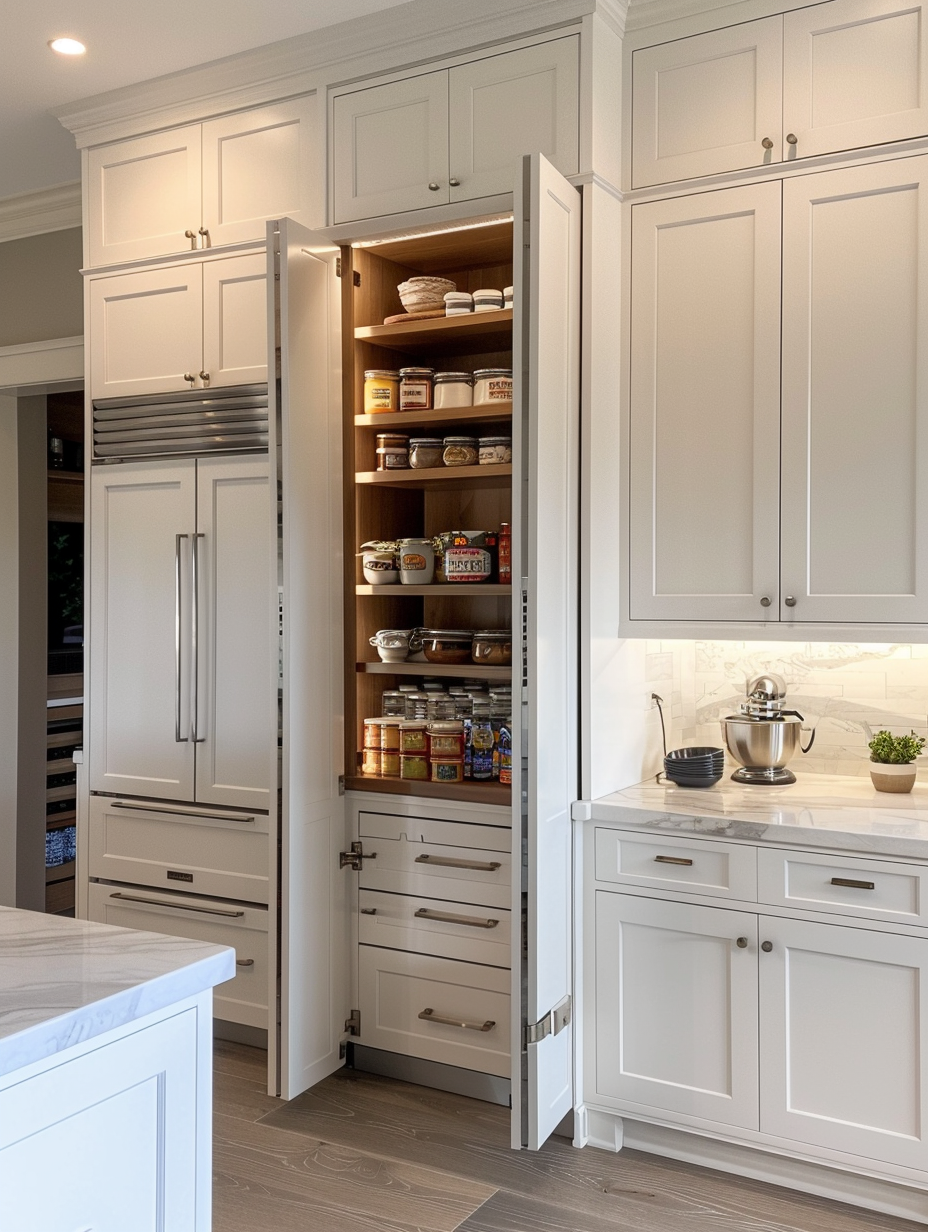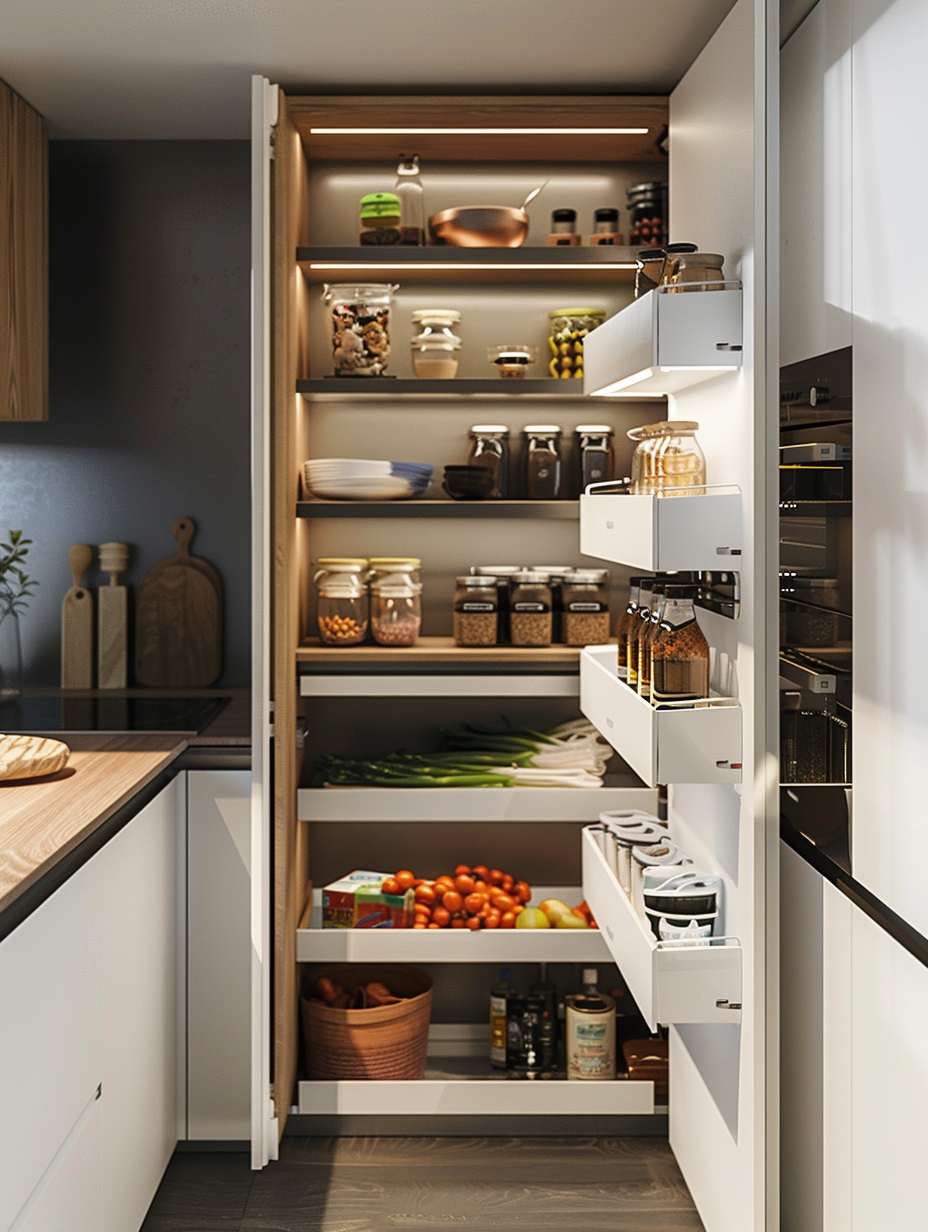 Concealed pantry shelves present a neat and discreet method of storage. Mount pull-out shelves to be hidden behind cabinet doors or use sliding panels to discretely put away your pantry stock. This technique allows your kitchen to be shiny and organized with no visible mess and a simple path to cupboard essentials.