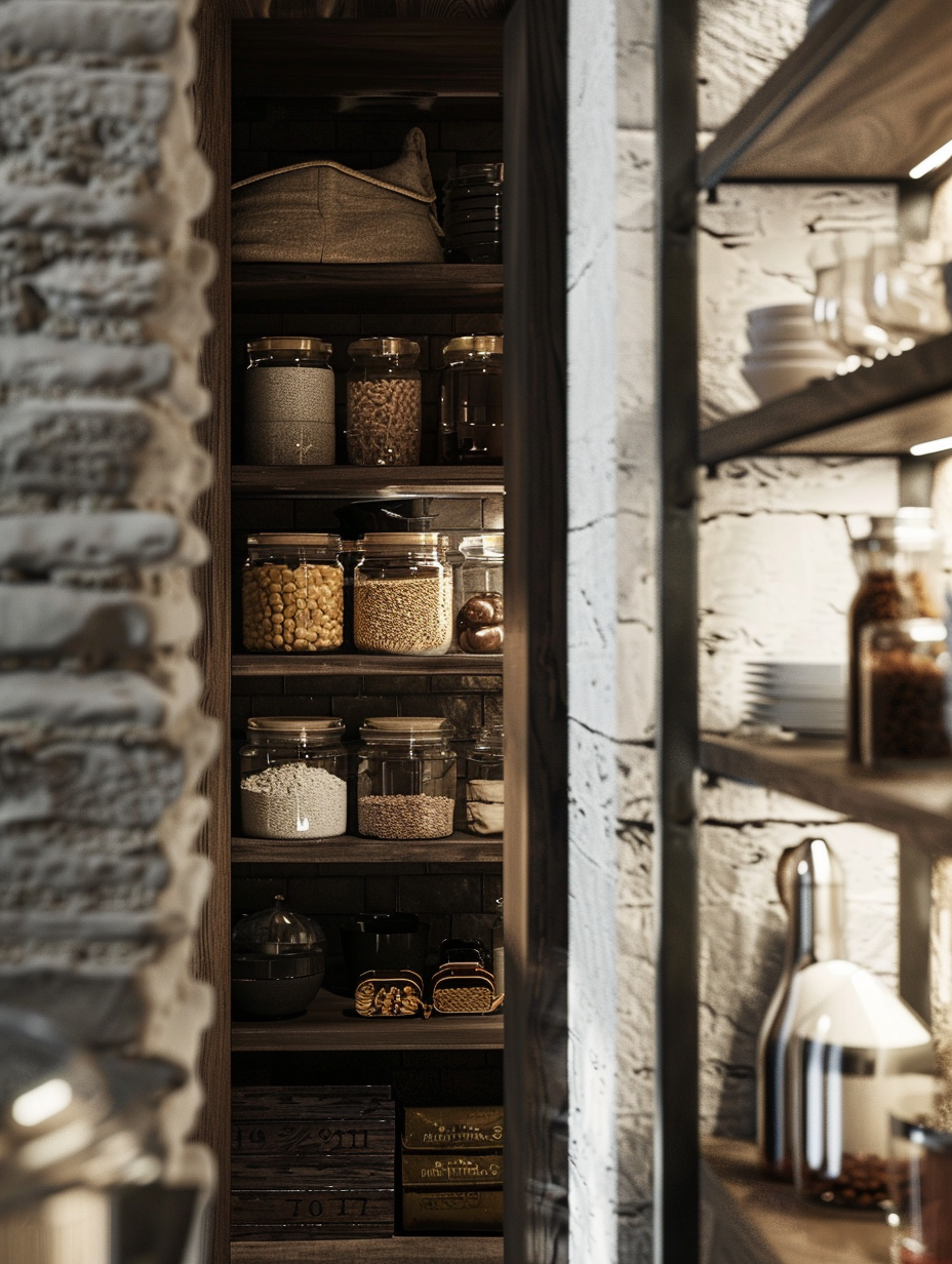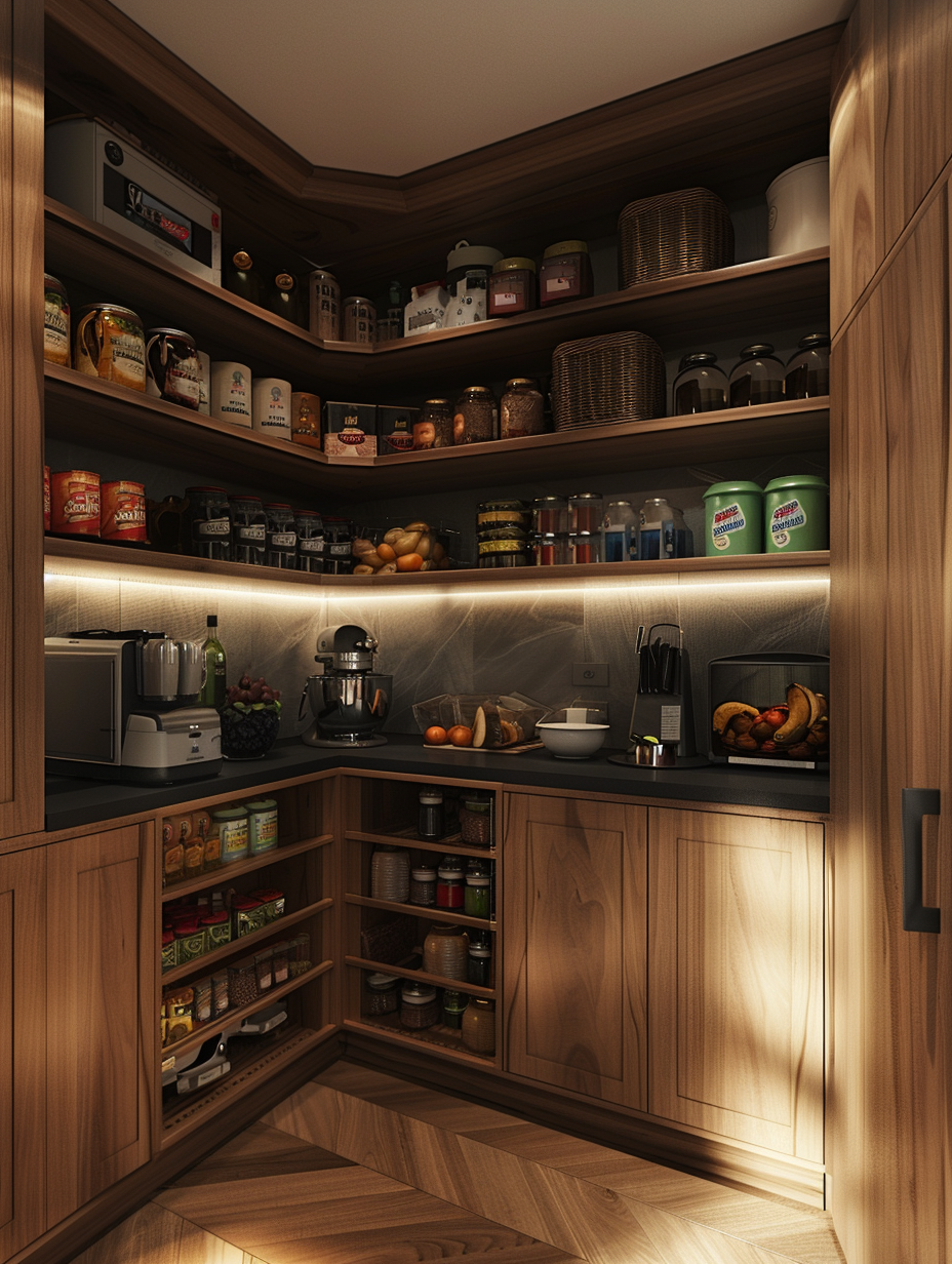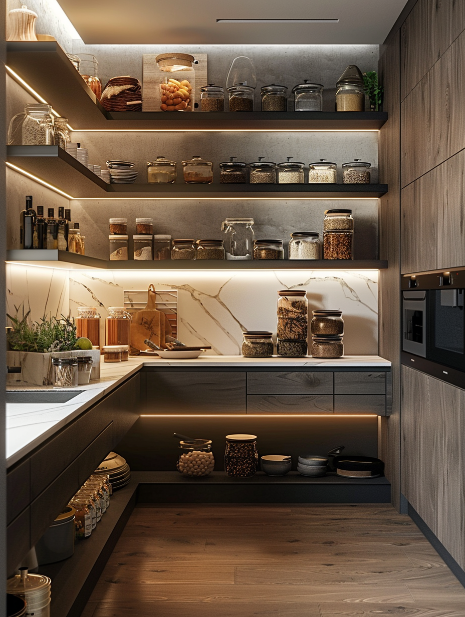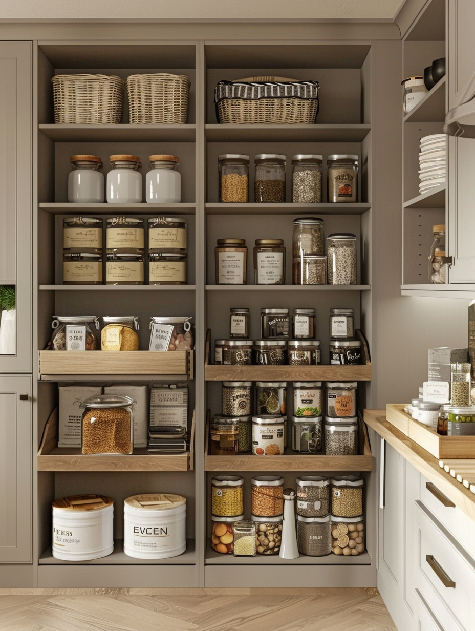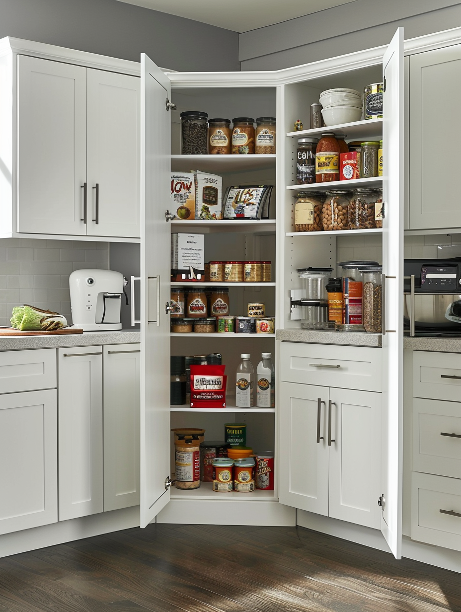 Concealed pantry shelves present a neat and discreet method of storage. Mount pull-out shelves to be hidden behind cabinet doors or use sliding panels to discretely put away your pantry stock. This technique allows your kitchen to be shiny and organized with no visible mess and a simple path to cupboard essentials.