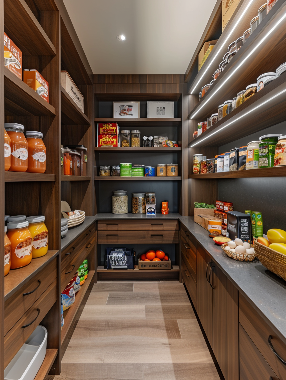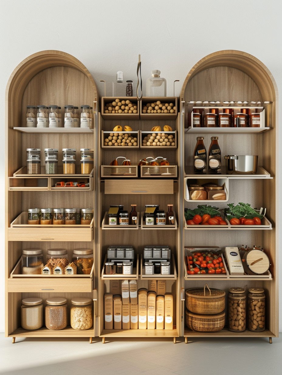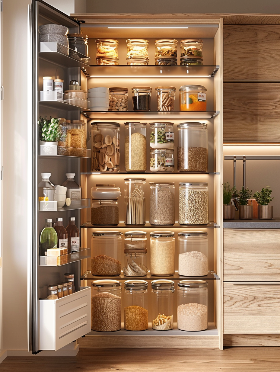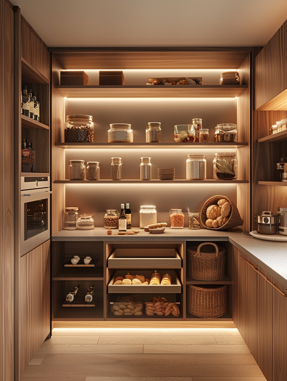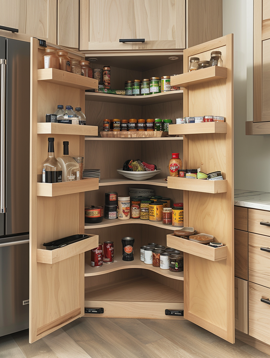 Concealed pantry shelves present a neat and discreet method of storage. Mount pull-out shelves to be hidden behind cabinet doors or use sliding panels to discretely put away your pantry stock. This technique allows your kitchen to be shiny and organized with no visible mess and a simple path to cupboard essentials.