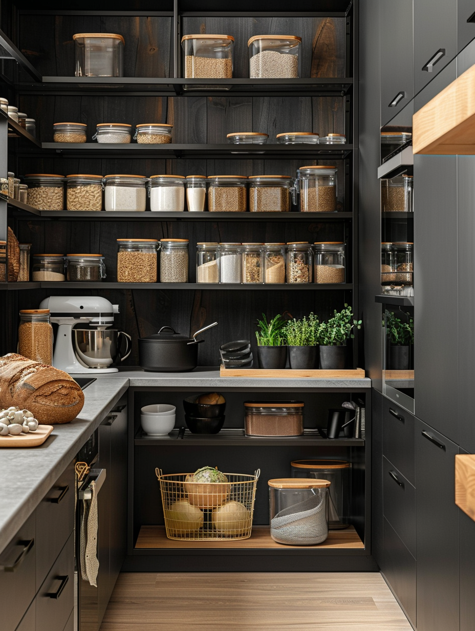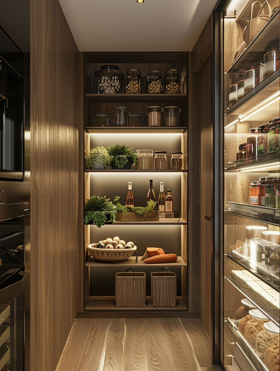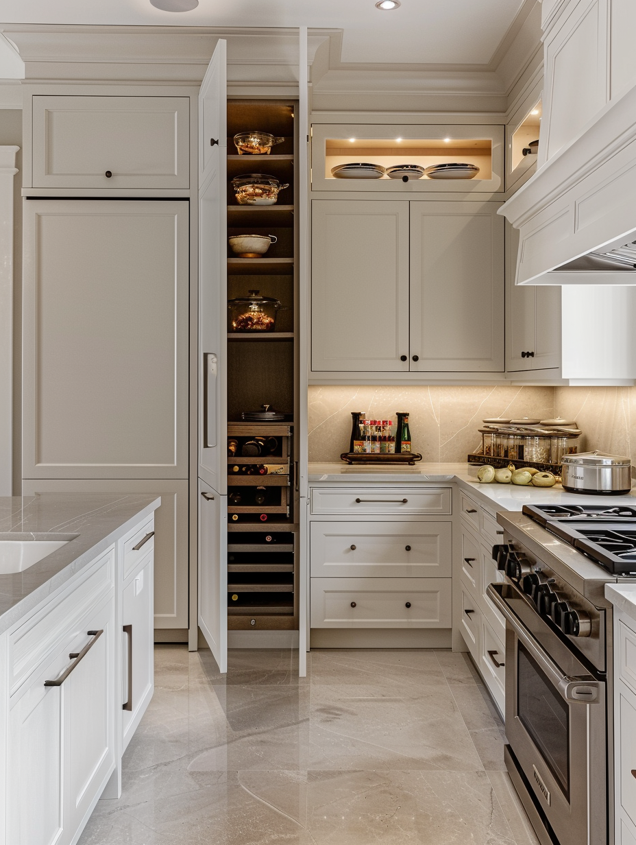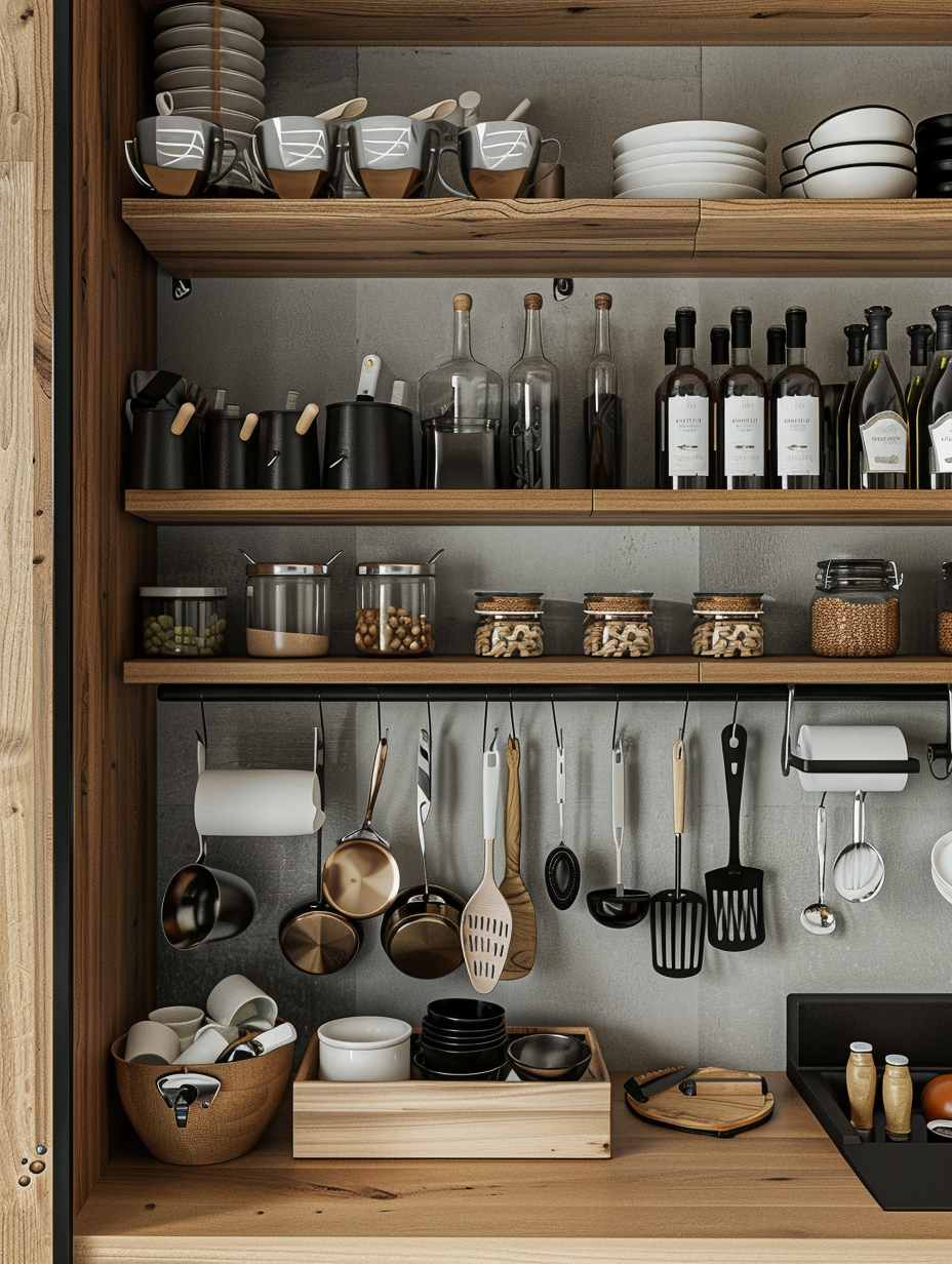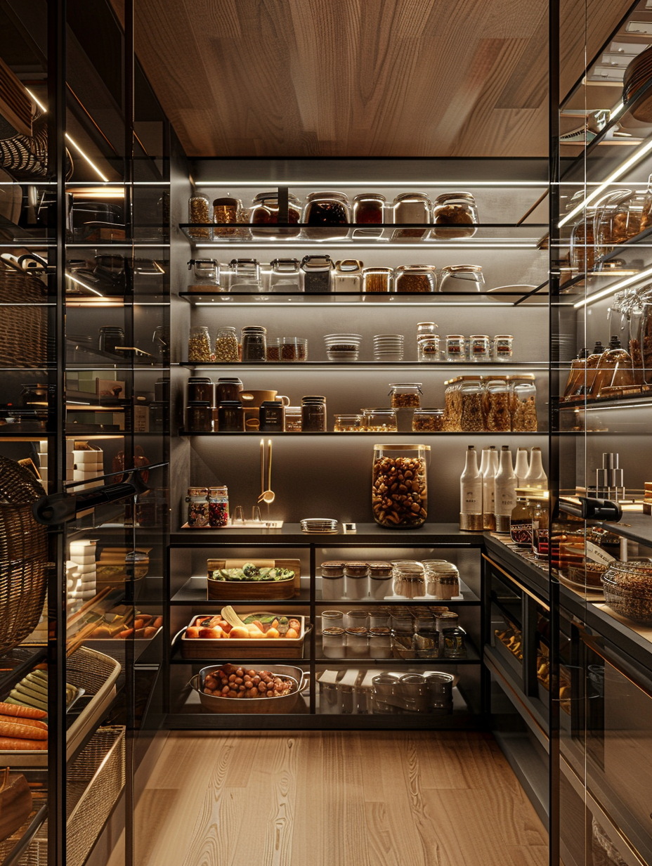Concealed pantry shelves present a neat and discreet method of storage. Mount pull-out shelves to be hidden behind cabinet doors or use sliding panels to discretely put away your pantry stock. This technique allows your kitchen to be shiny and organized with no visible mess and a simple path to cupboard essentials.