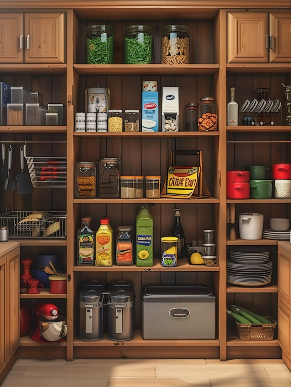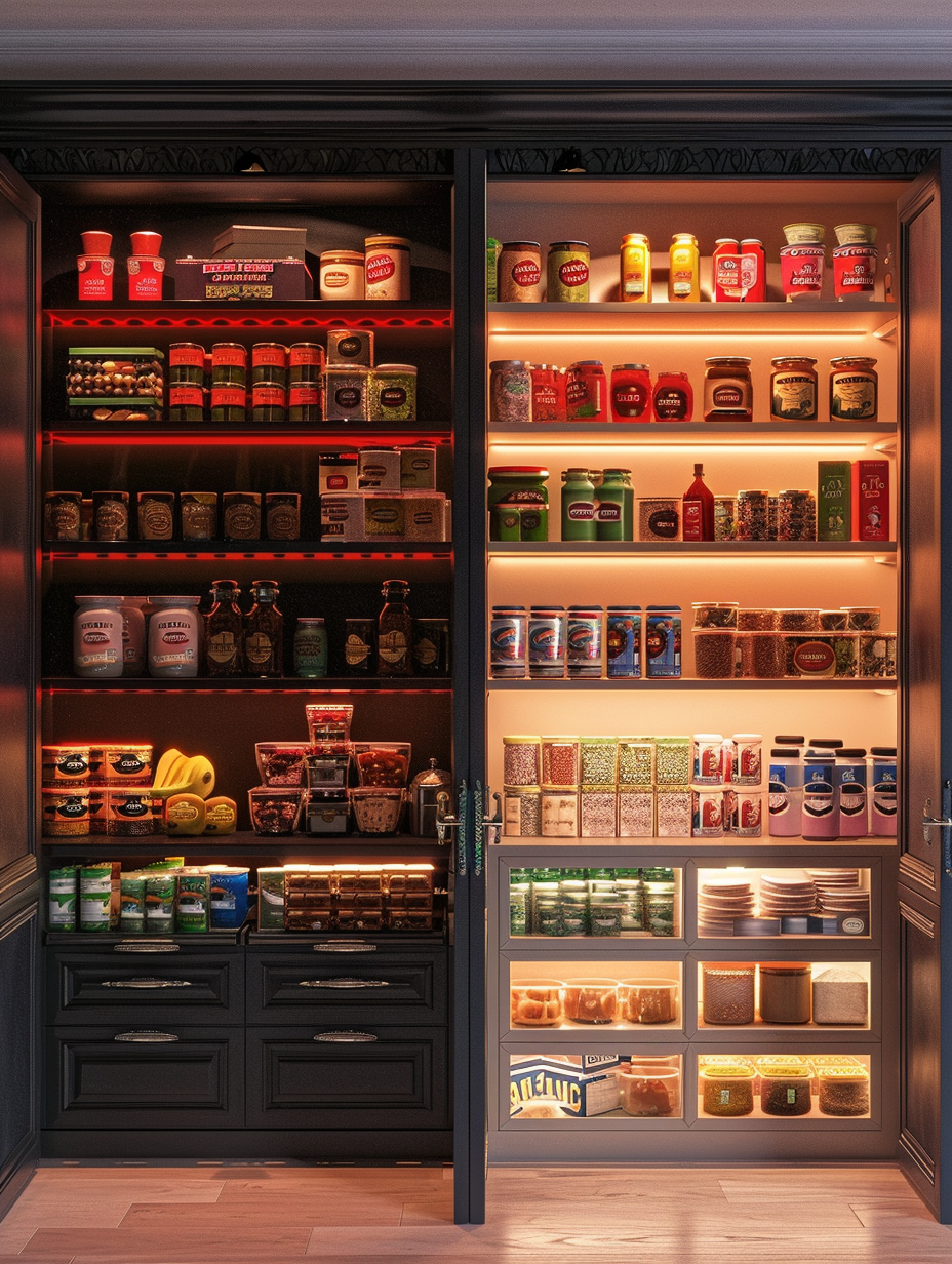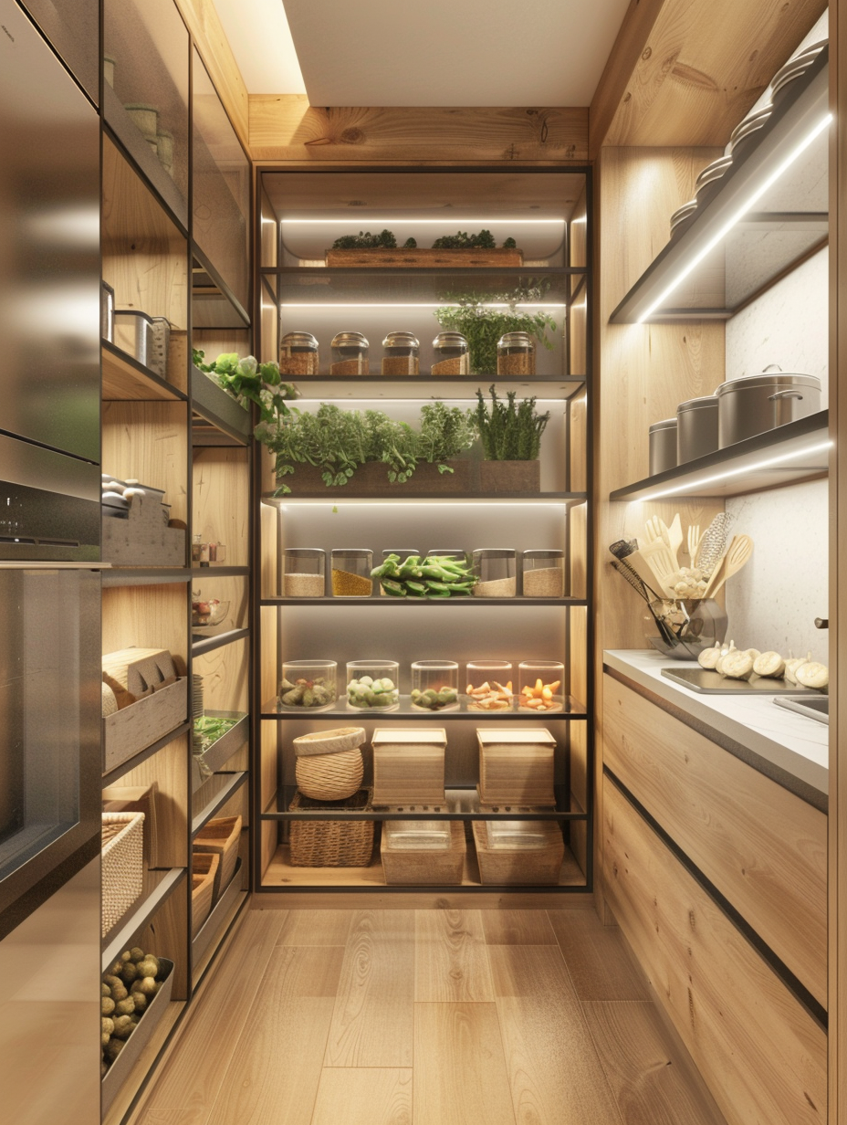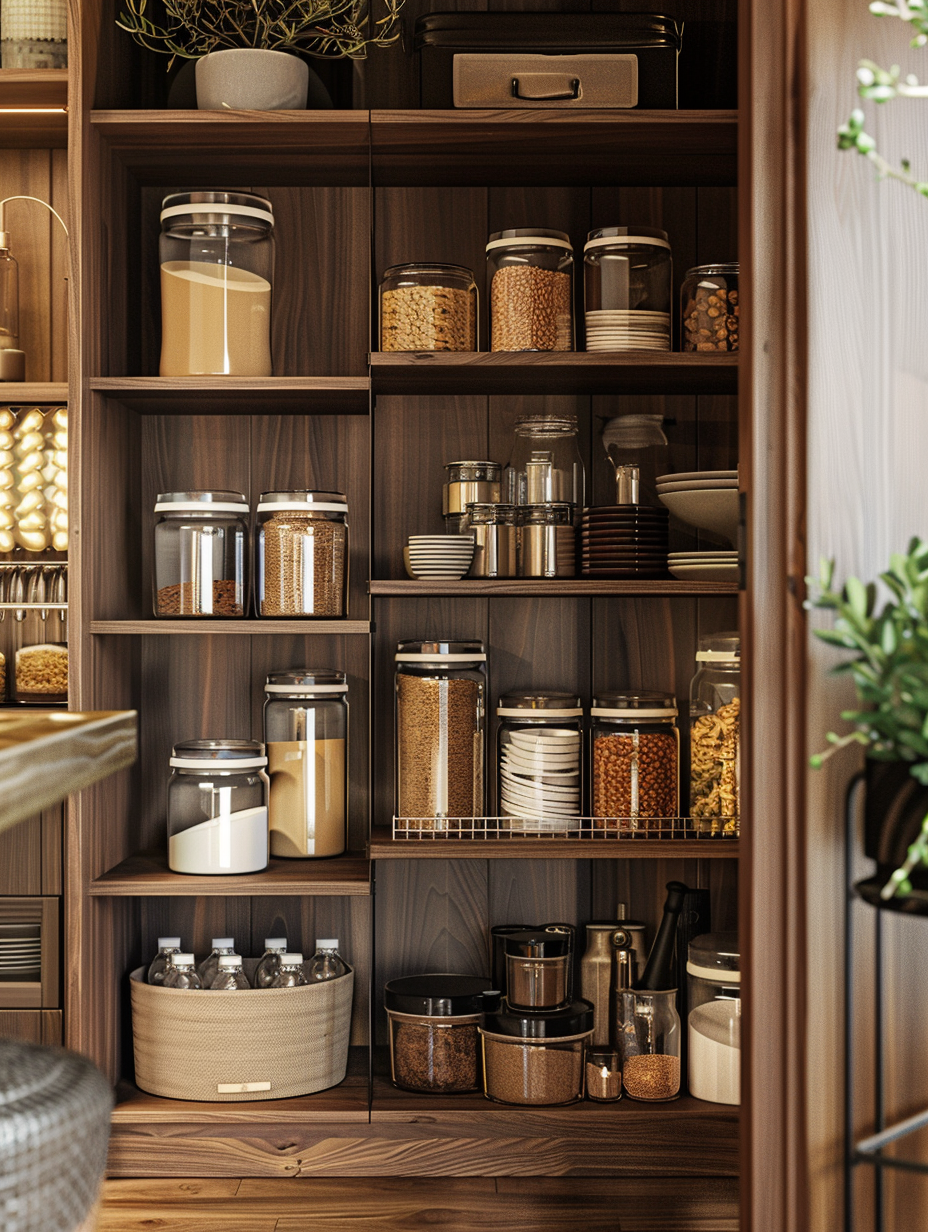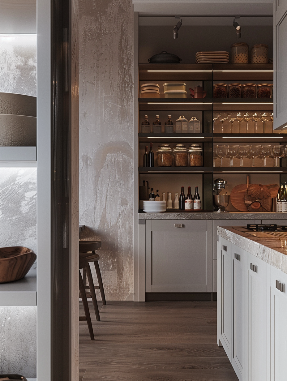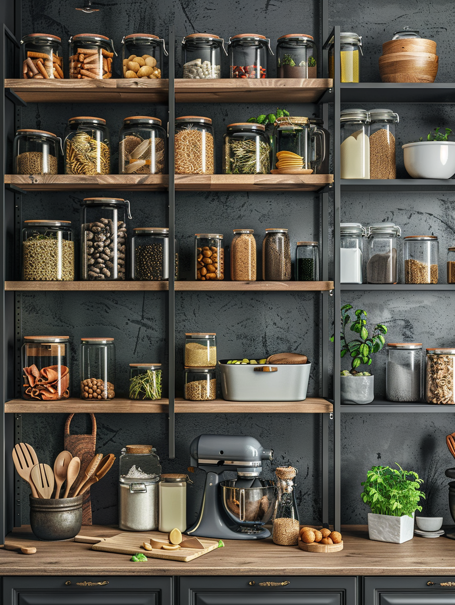Concealed pantry shelves present a neat and discreet method of storage. Mount pull-out shelves to be hidden behind cabinet doors or use sliding panels to discretely put away your pantry stock. This technique allows your kitchen to be shiny and organized with no visible mess and a simple path to cupboard essentials.
