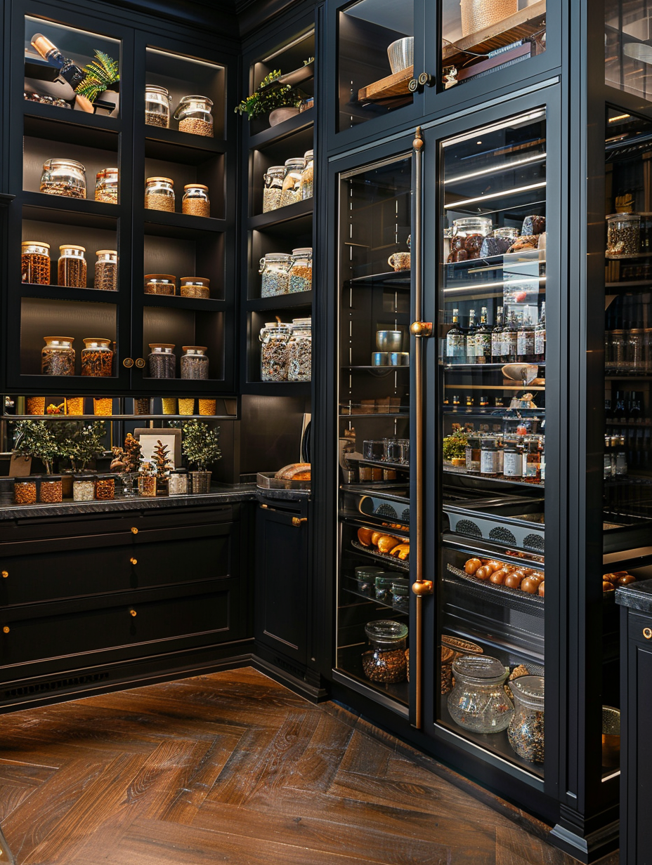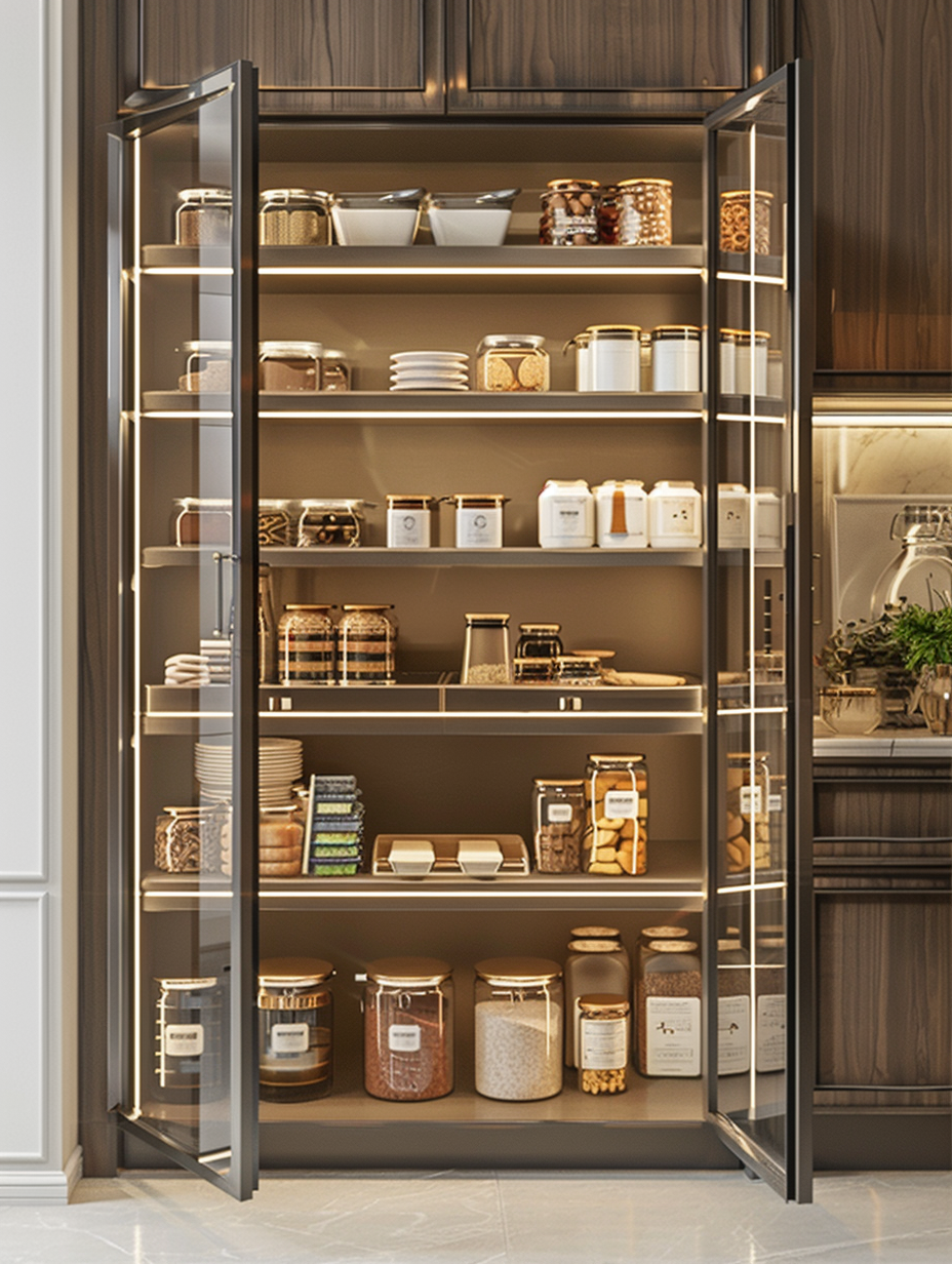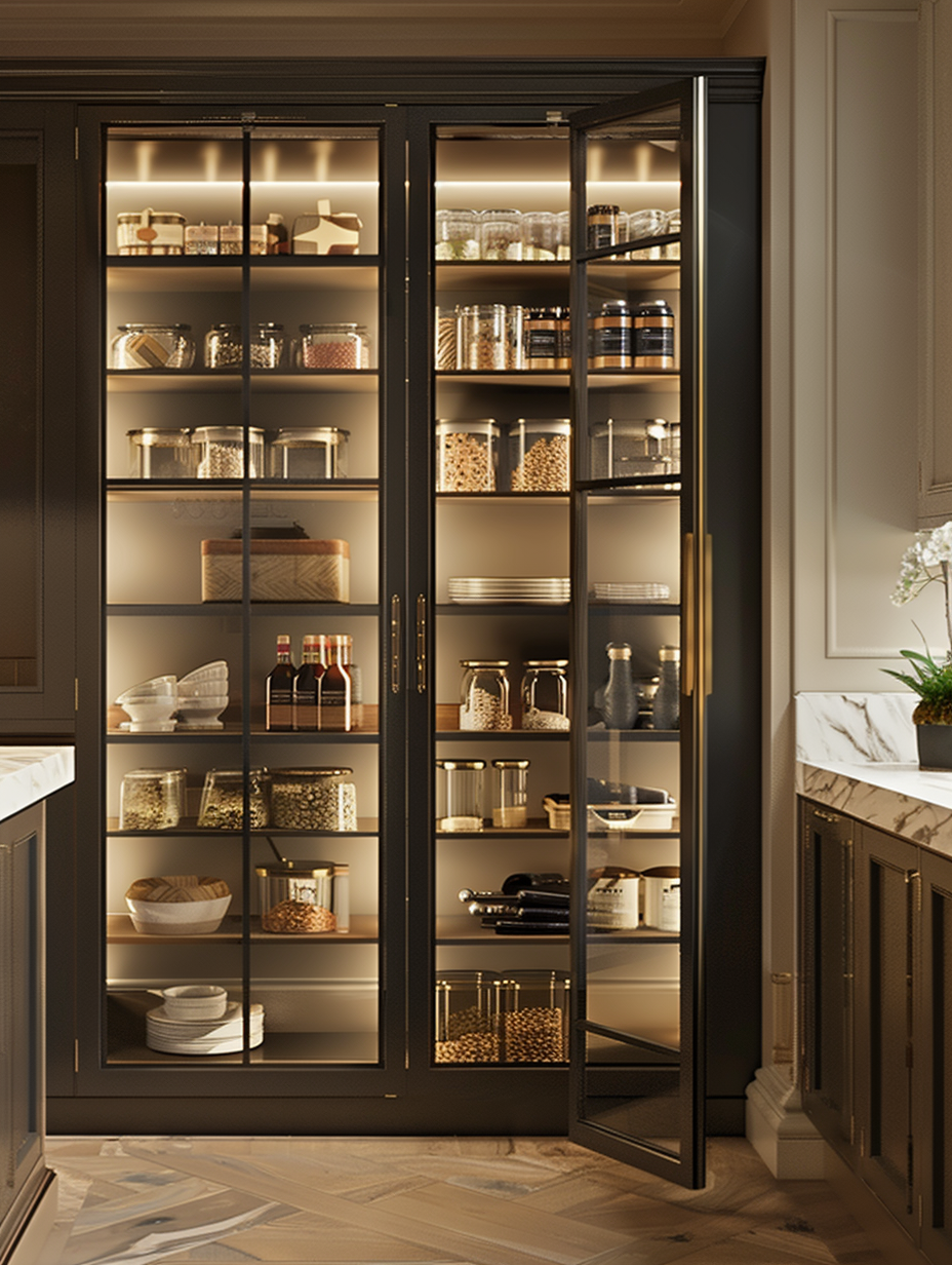 Pantry shelving with glass doors offers both practical and decorative functions. Glass doors ensure that what’s inside is clear, so you can find things more quickly, while also giving a stylish look to one’s kitchen. Decide on tempered glass, which means it is sturdy and safe. This look will be the best to show off your neatly stored pantry and at the same time prevent dust and pests from getting in.