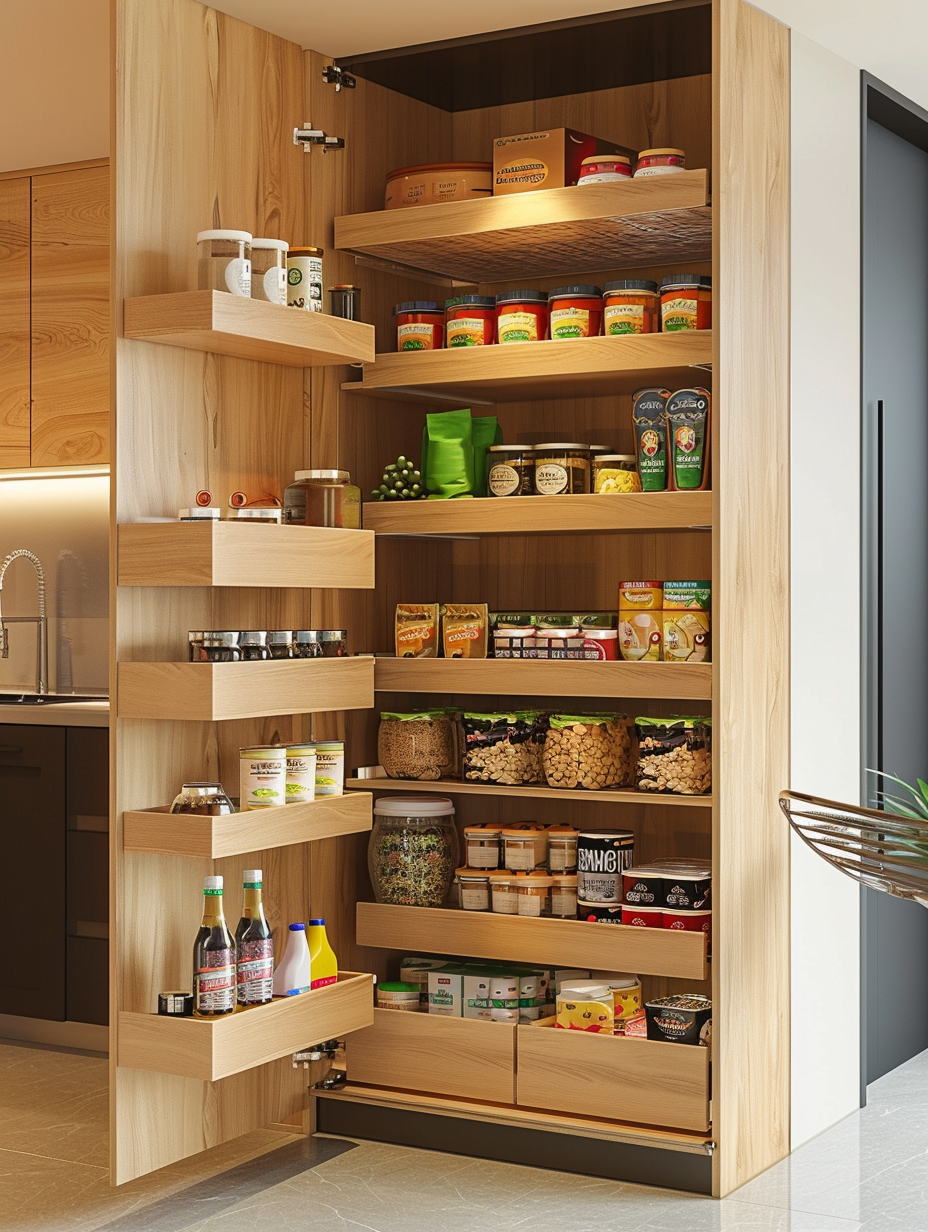 Space-saving slide-out shelves are perfect for smaller pantry spaces or those that are designed more economically. Via a perfectly working slide, these shelves receive the contents and deliver the goods to the center without space wastage. This idea suits limited storage spaces where smart solutions are needed.
